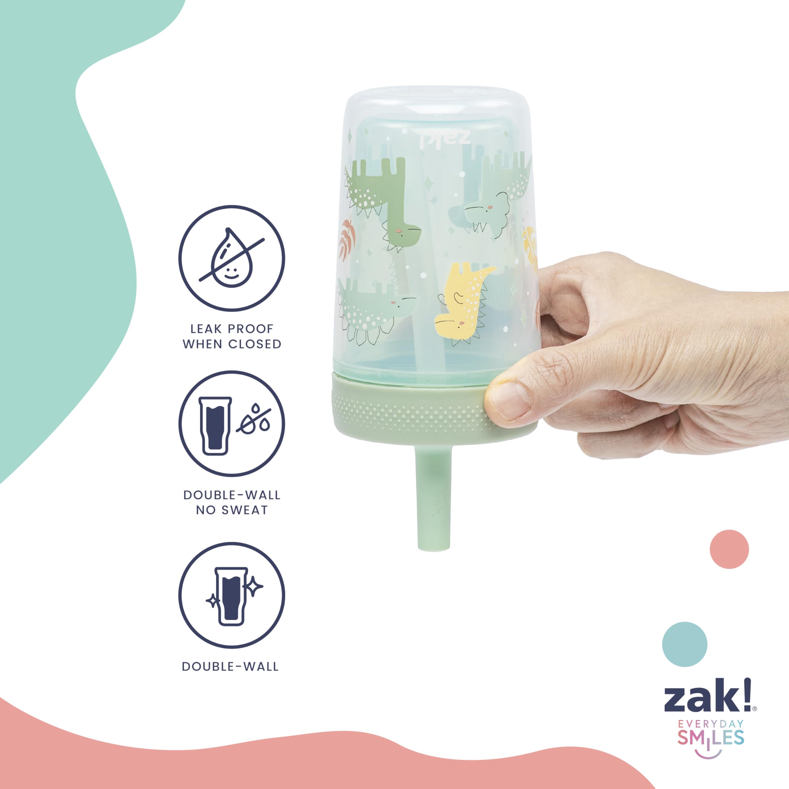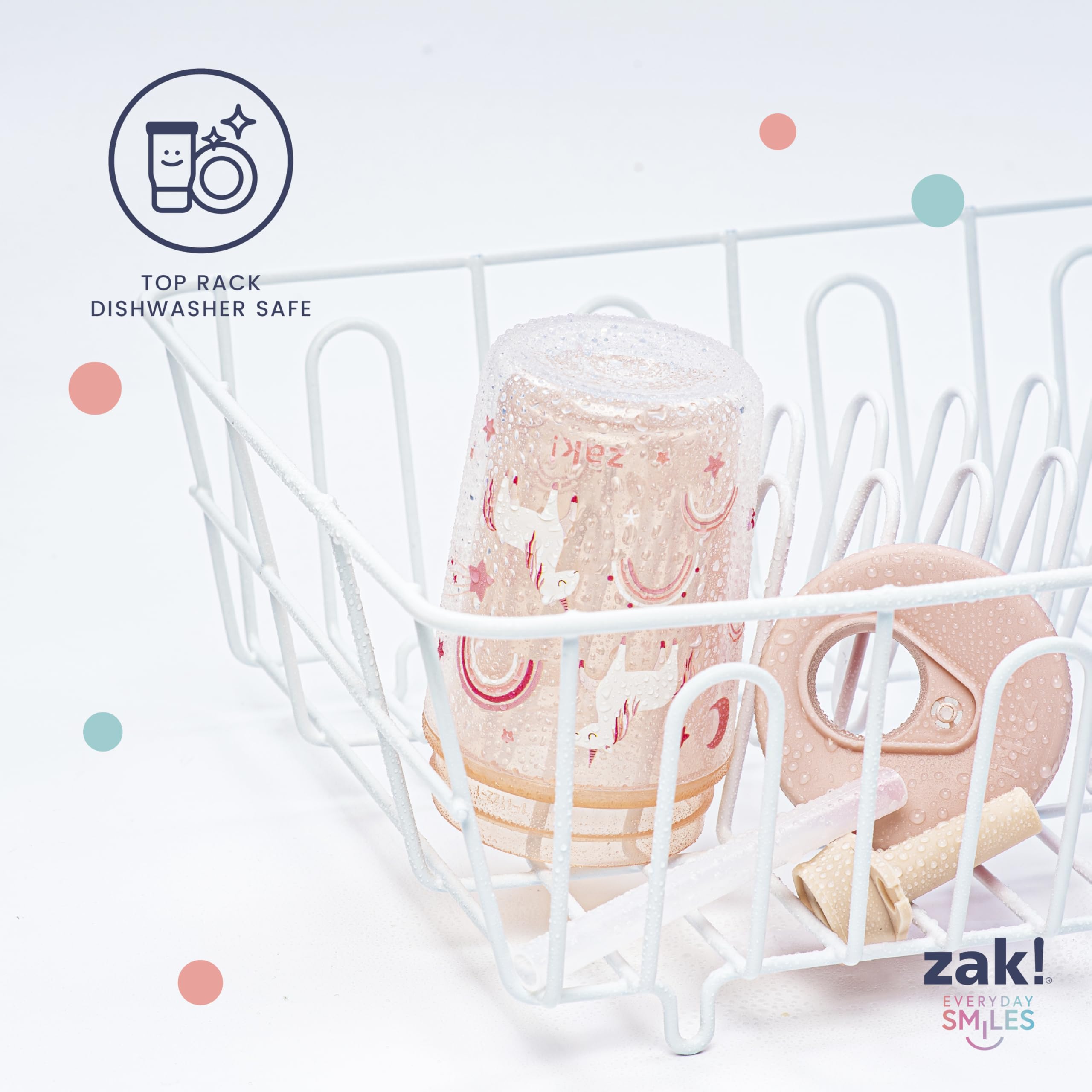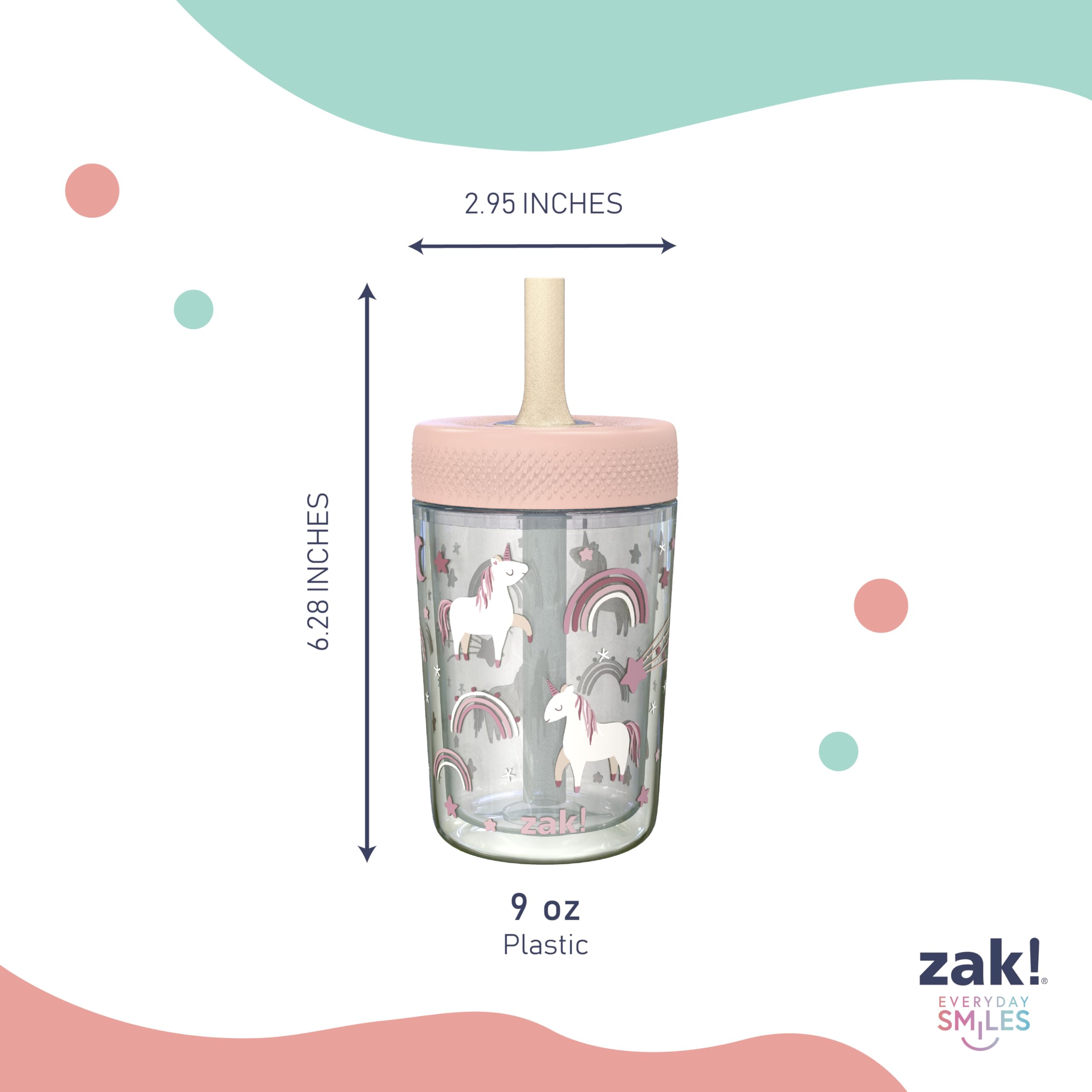 This leak-proof kids' tumbler set from Zak Designs makes hydration fun! Durable Materials: The tumbler is made from lightweight plastic, and the comfortable straw is made from silicone. Everything is dishwasher safe, and the lid can be disassembled for easy cleaning. Leak-Proof Straw: The straw has a built-in valve that allows liquid to flow when drinking and prevents spills when the tumbler is tipped over. Hydrate Anywhere: The tumbler won't splash or leak and fits in car cup holders, making it ideal to take on the go. At home, you don't have to worry about spills or stains around fabrics or electronics, and drinks stay easily accessible through the straw. Plus, the double-wall insulation stops condensation and messy water rings! Specifications: 2 tumblers with 9 oz capacity. Made of durable plastic and silicone. Dishwasher safe, do not microwave. Length: 2.95-inch, Width: 2.95-inch, Height: 6.28-inch. Design: Fairy Tales and Rainbow Magic.