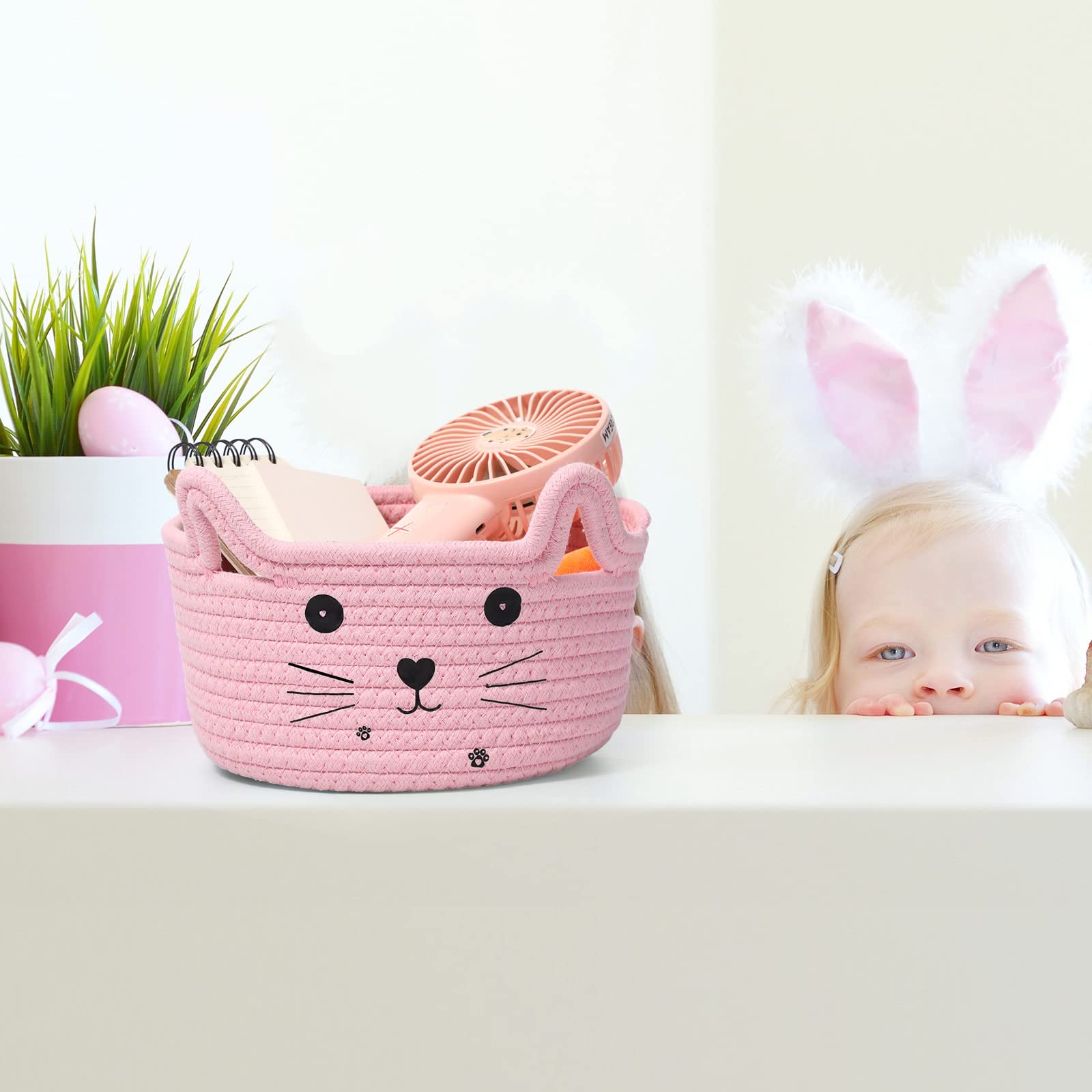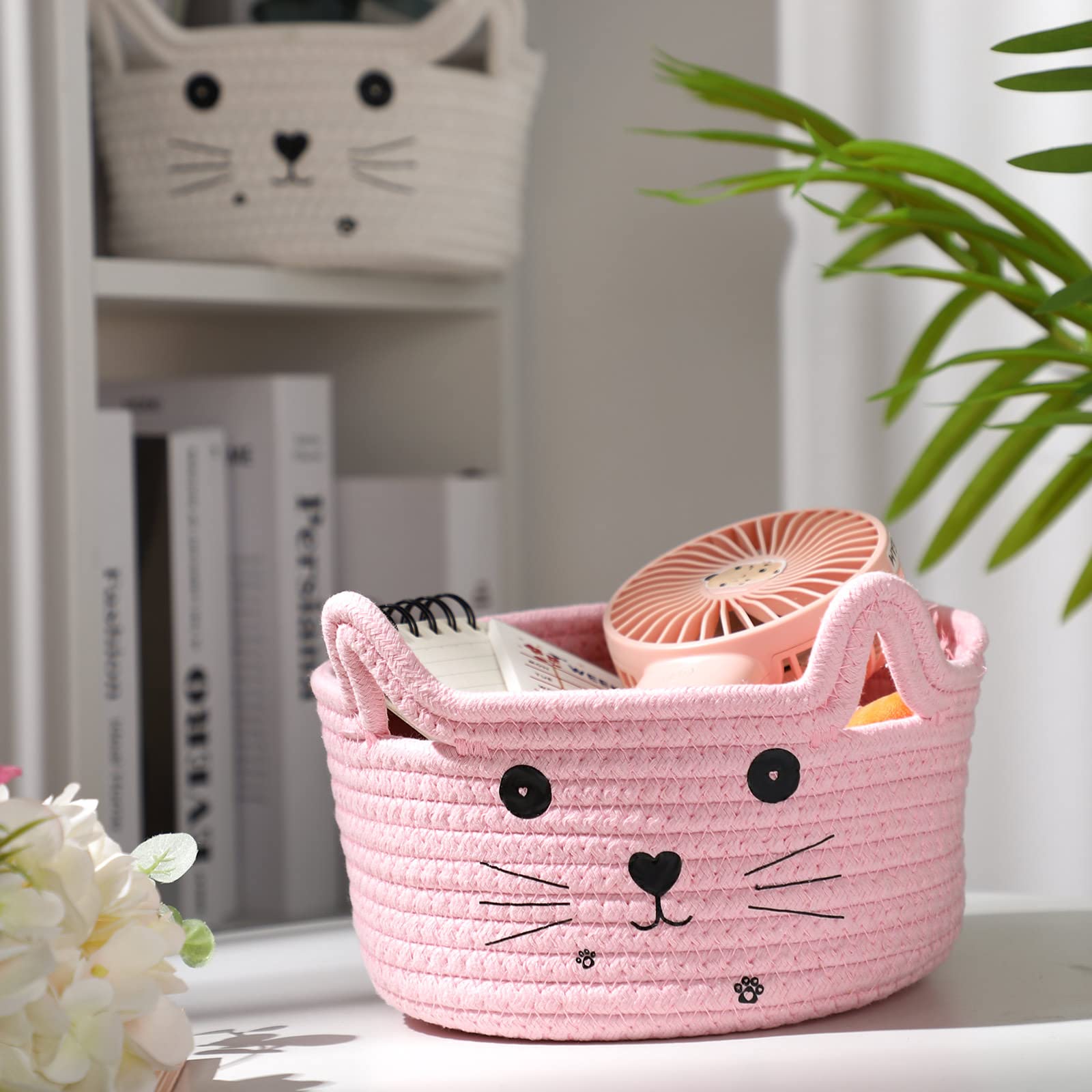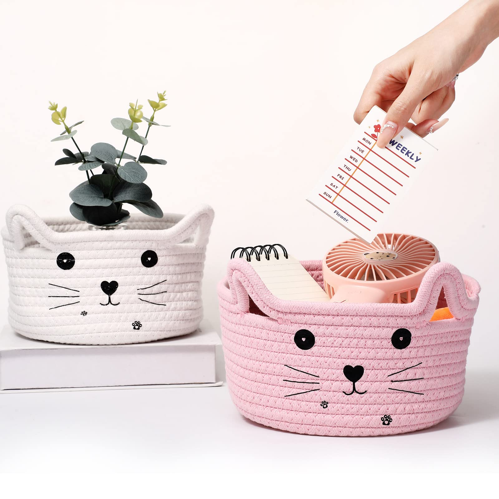 Widely Applied: the small woven basket with cute designs can be applied in your home bedrooms, restaurants, kitchens, living room, playroom, office, etc., and it can store cosmetics, stationery, dried flower decorations, snacks, cats or dog toys