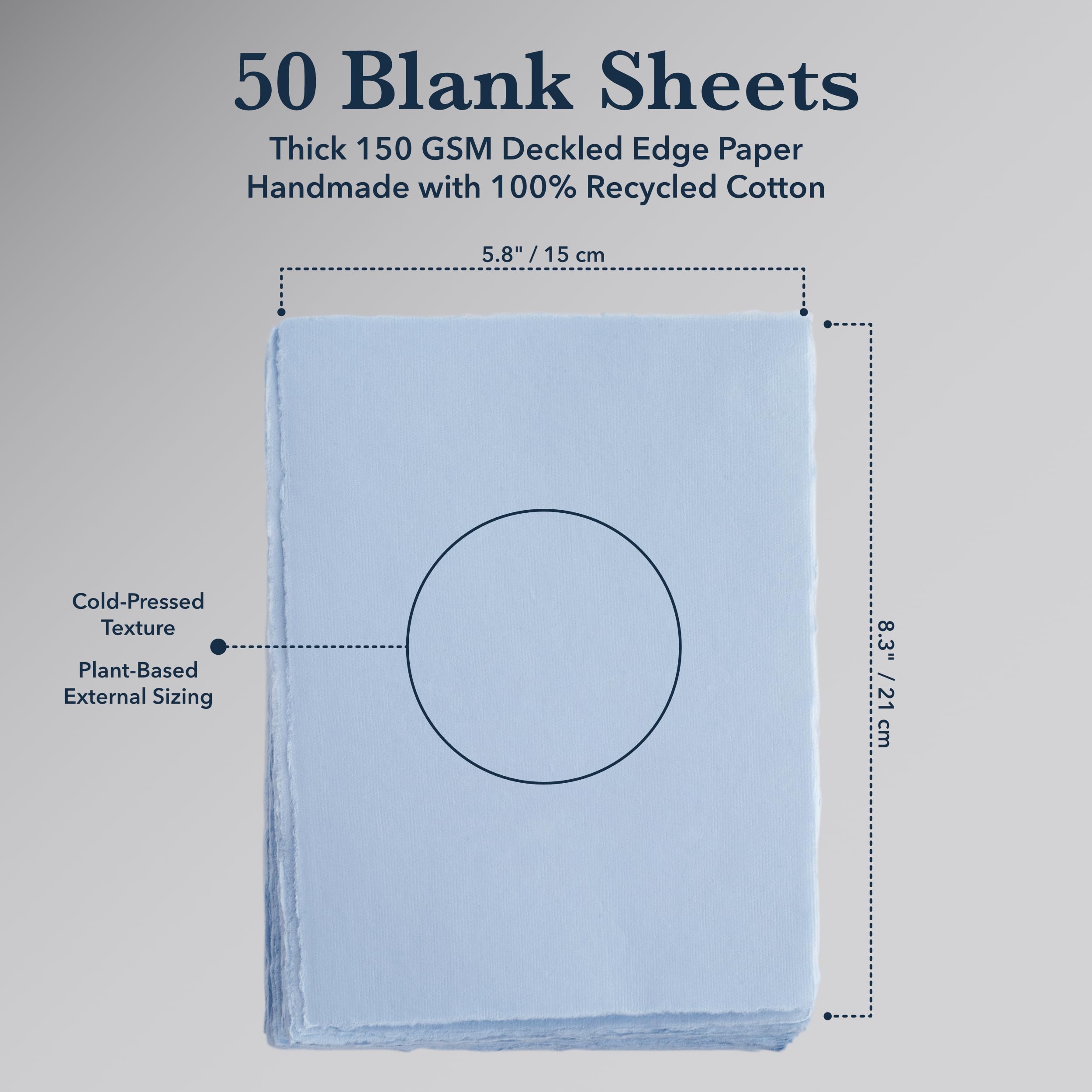[Artisan Crafted]: Experience the unmatched craftsmanship of our 50-pack handmade cotton deckled edge paper, expertly produced by artisans using time-honored techniques passed down through generations since 14th-century India. This luxurious, cold-pressed 150gsm blank paper is externally treated with a plant-based sizing solution, making it ideal for bringing your creative visions to life—whether with watercolor, acrylics, charcoal, ink, or colored pencils