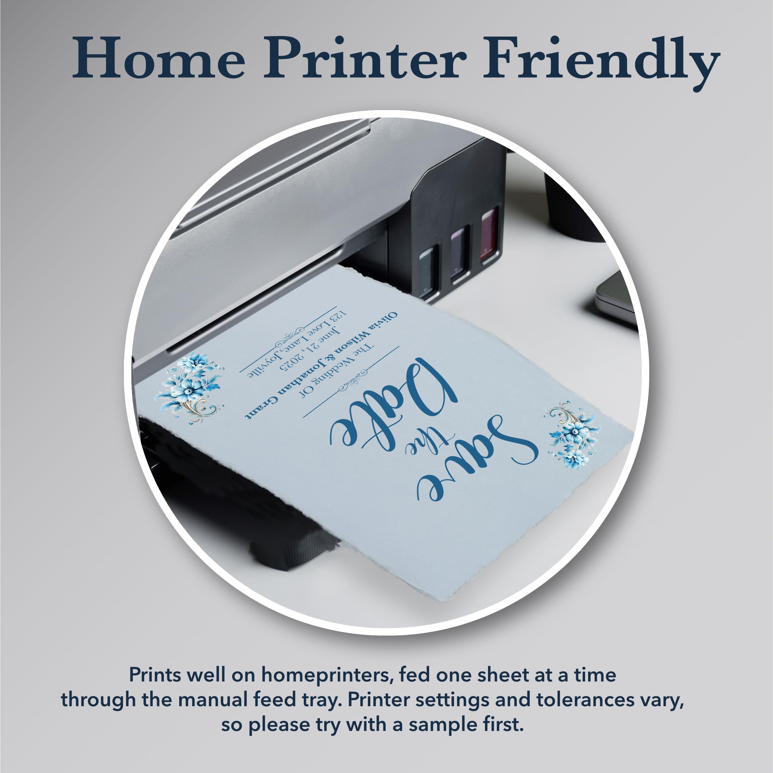 [Home Printer Friendly]: Our deckled edge 150gsm paper is compatible with home printers, offering endless possibilities to make a lasting impression with creations such as menus, wedding invitations, cards, or even books. For best results, feed one sheet at a time through the manual feed tray. As printer settings and tolerances can vary, we recommend testing with a sample first to ensure optimal print quality. 50 sheets of 5.8 x 8.3, A5 paper