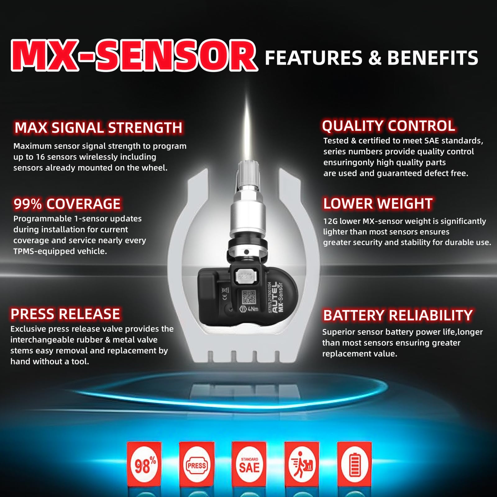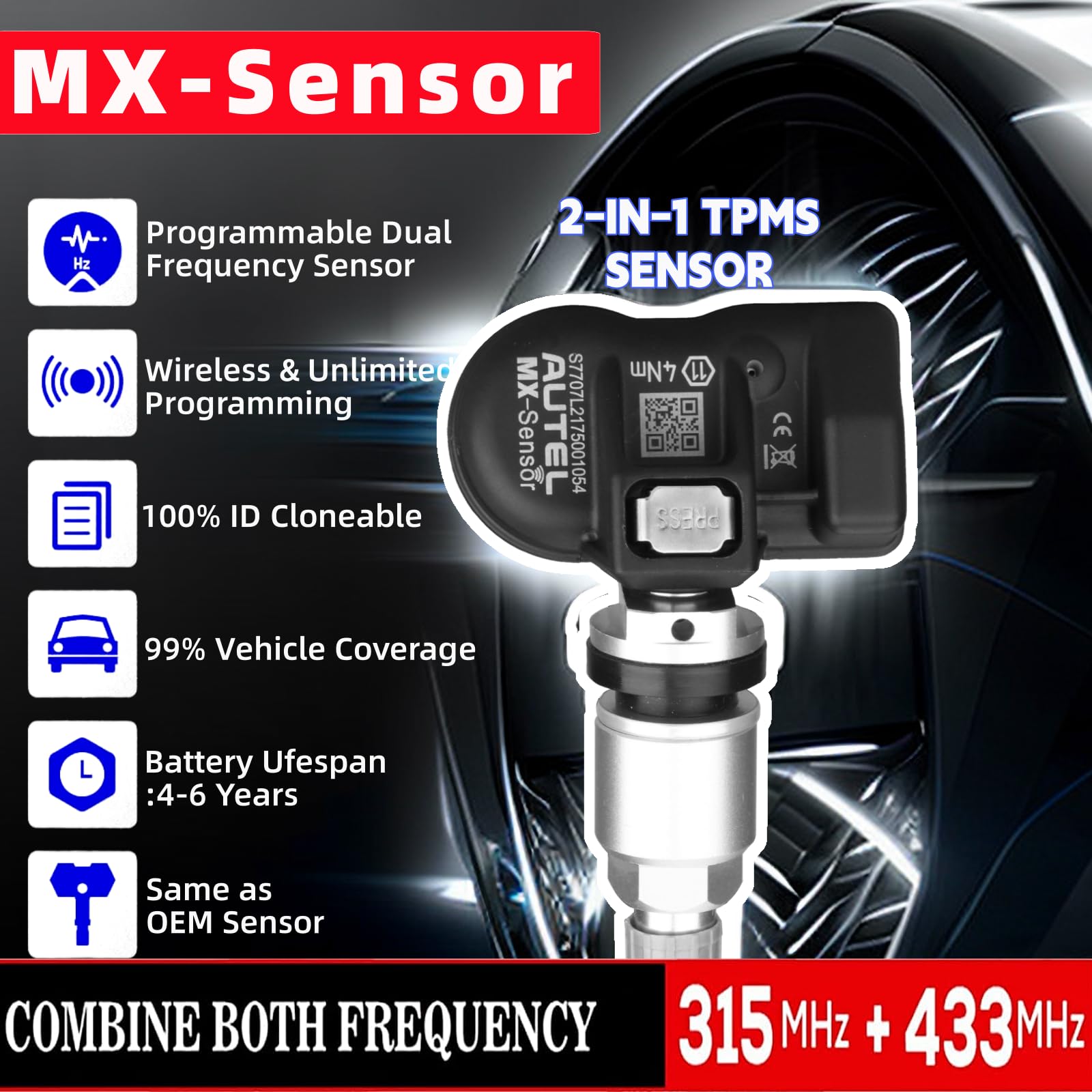 This package includes 12pcs Sensors. Autel 1-Sensor combines both 315MHz + 433MHz frequencies into one TPMS sensor with the highest industry vehicle coverage. Built to match or exceed OEM sensors in frequency strength and durability, MX-Sensors are 100% ID clone-able with no relearn required and offer latest model vehicle coverage because they quickly update with an Autel wireless programming tool.