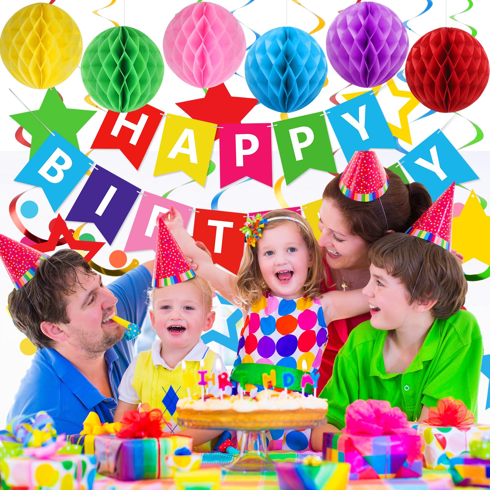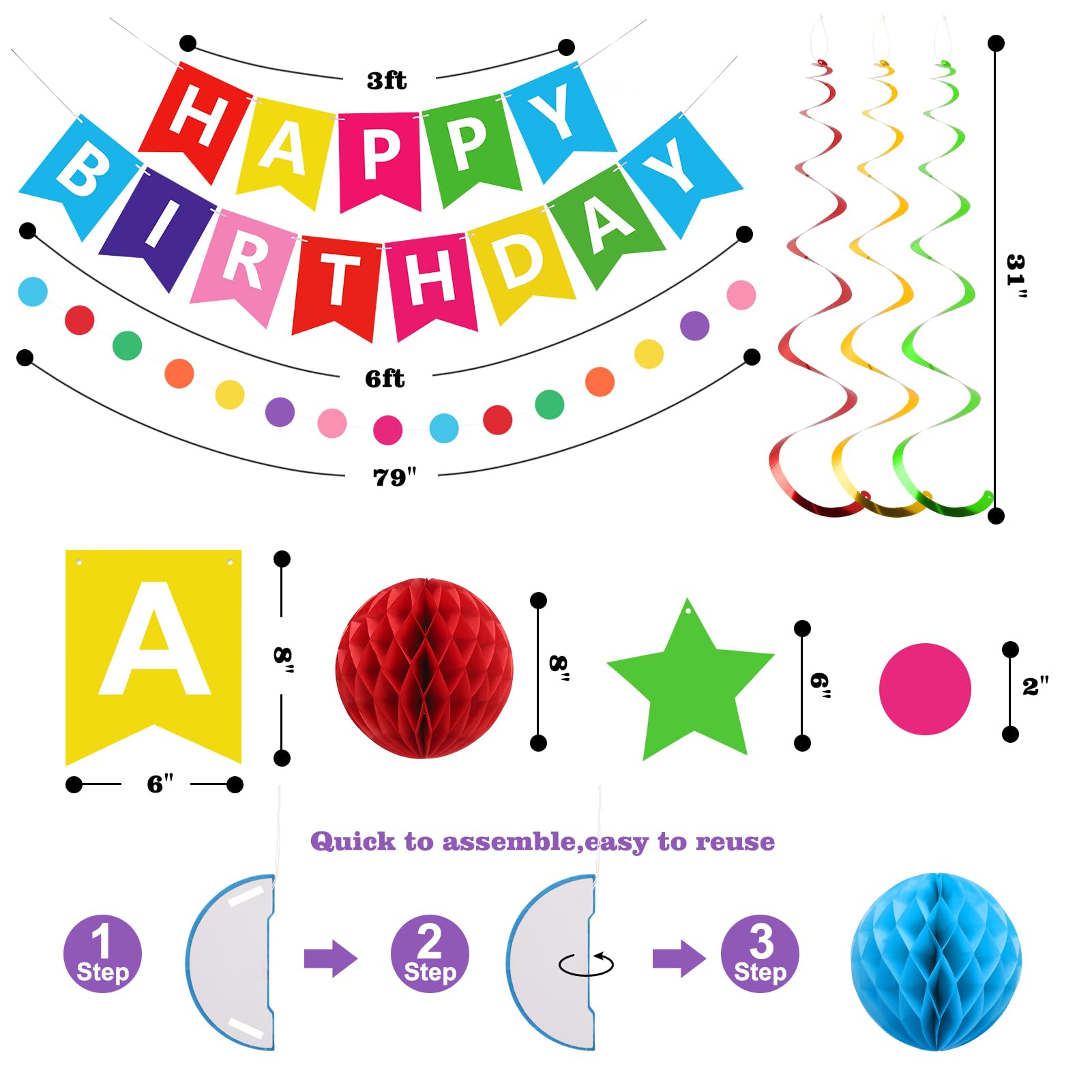 Package Including: With our Birthday Party Decorations package, you'll have everything you need to create the perfect party atmosphere. You can get 1pcs Happy Birthday Banner, 12pcs Honeycomb Balls, 16pcs Stars Swirls Streamers, and 1pcs Circle Dots Decorations. No need to worry about running around and finding individual items. It's convenient package.