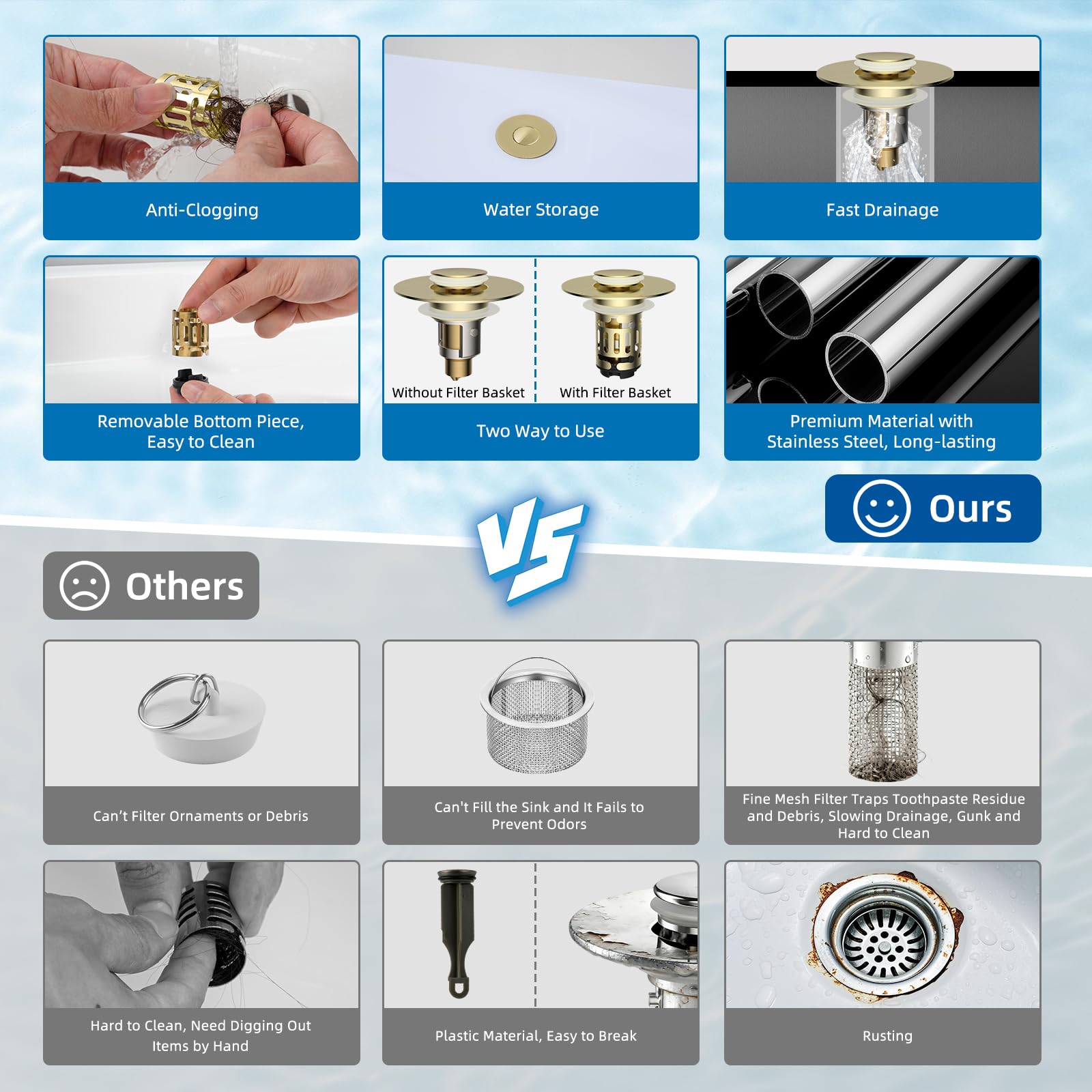 [Pop-up Design] Our pop-up sink drain strainer is made of high-quality stainless steel, plastic, and solid brass, providing exceptional rebound strength, corrosion resistance, and long-lasting durability. It features a long-lasting and sensitive pop-up brass bullet core mechanism, allowing you to easily switch between the water storage and fast drainage modes with just a gentle press