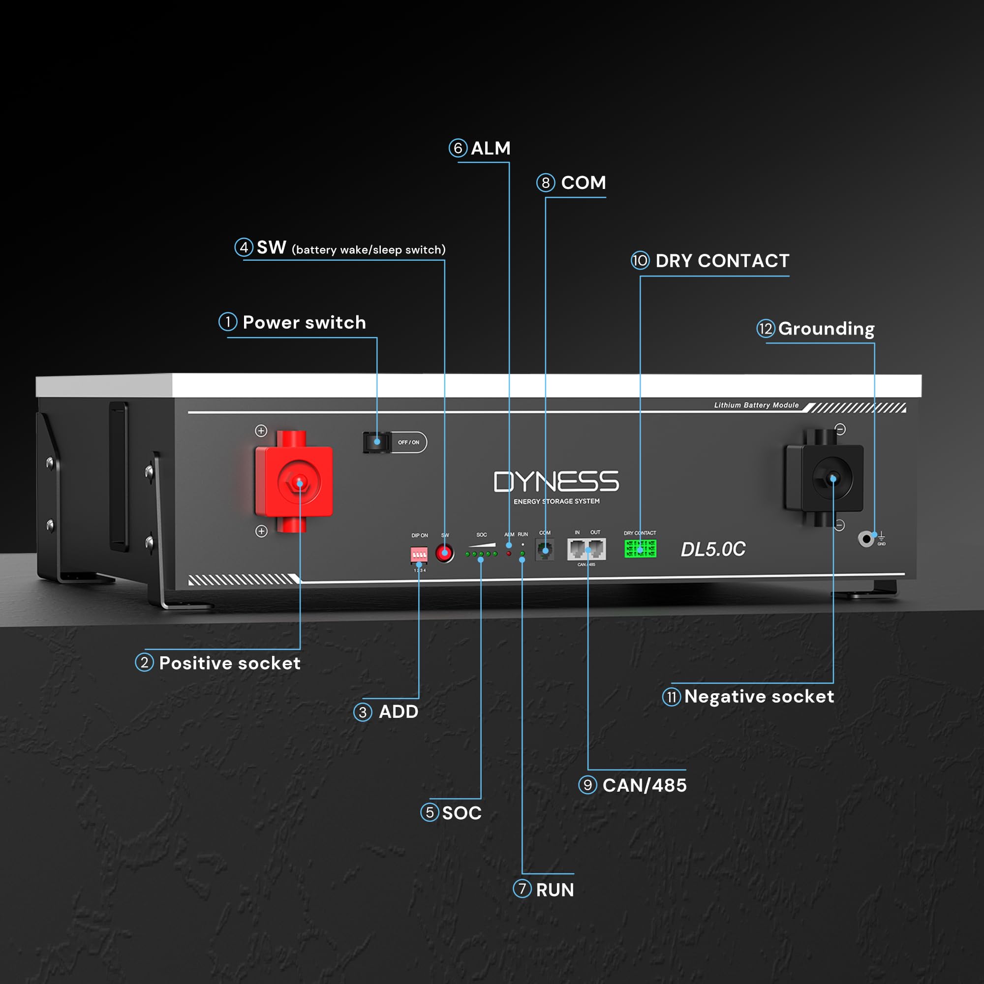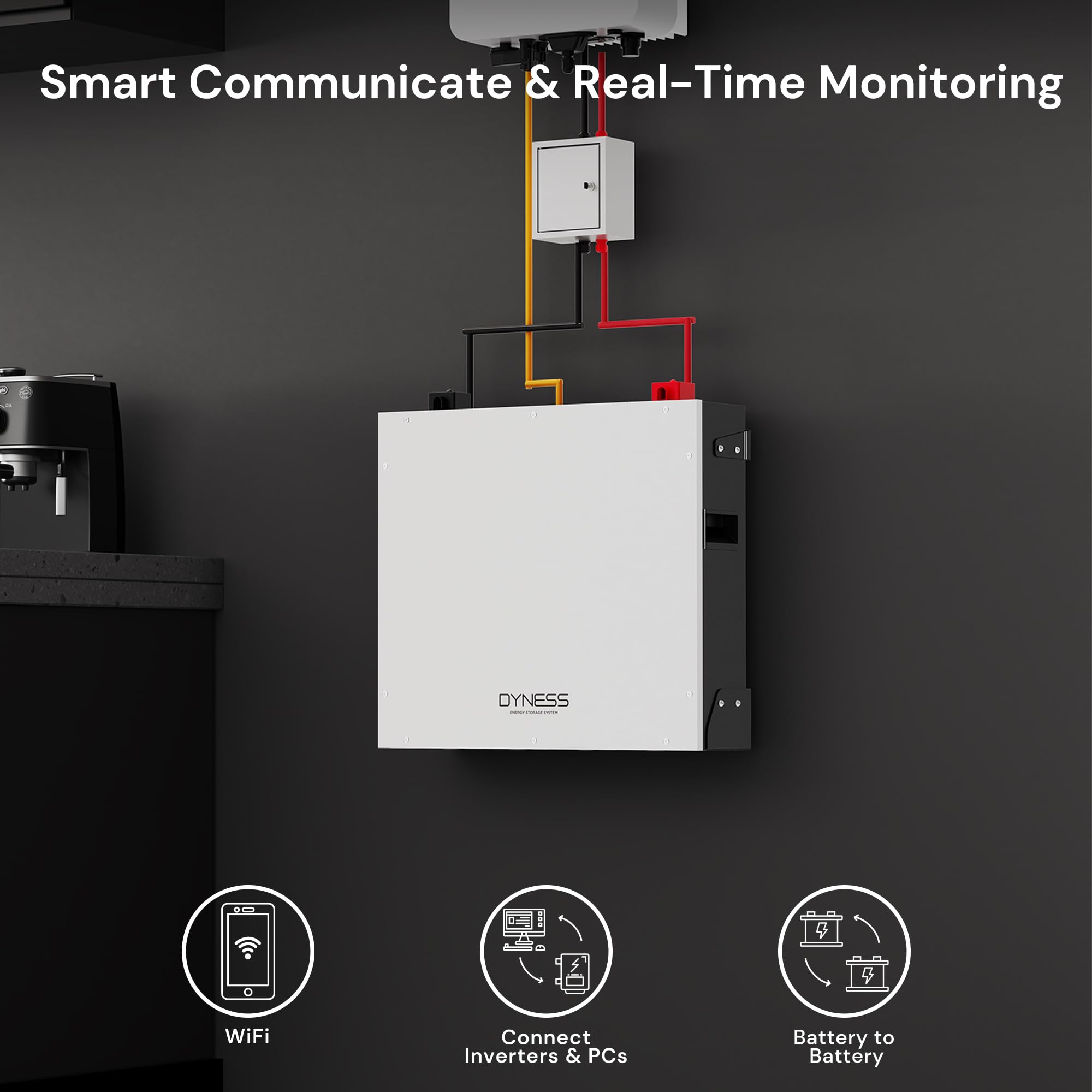 [Real-Time Monitoring]Dyness 51.2V LiFePO4 Battery equipped with a COM port,which can be used to connect Wi-Fi signal booster, external data loggers or displays that support the RS232 protocol for stay informed on your battery’s health and performance, including: voltage, current, temperature, and protection status. All from the convenience of your smartphone. Additionally, battery features a LED indicator on the front panel for real-time display the state of charge (SOC), operational status, and fault alarms