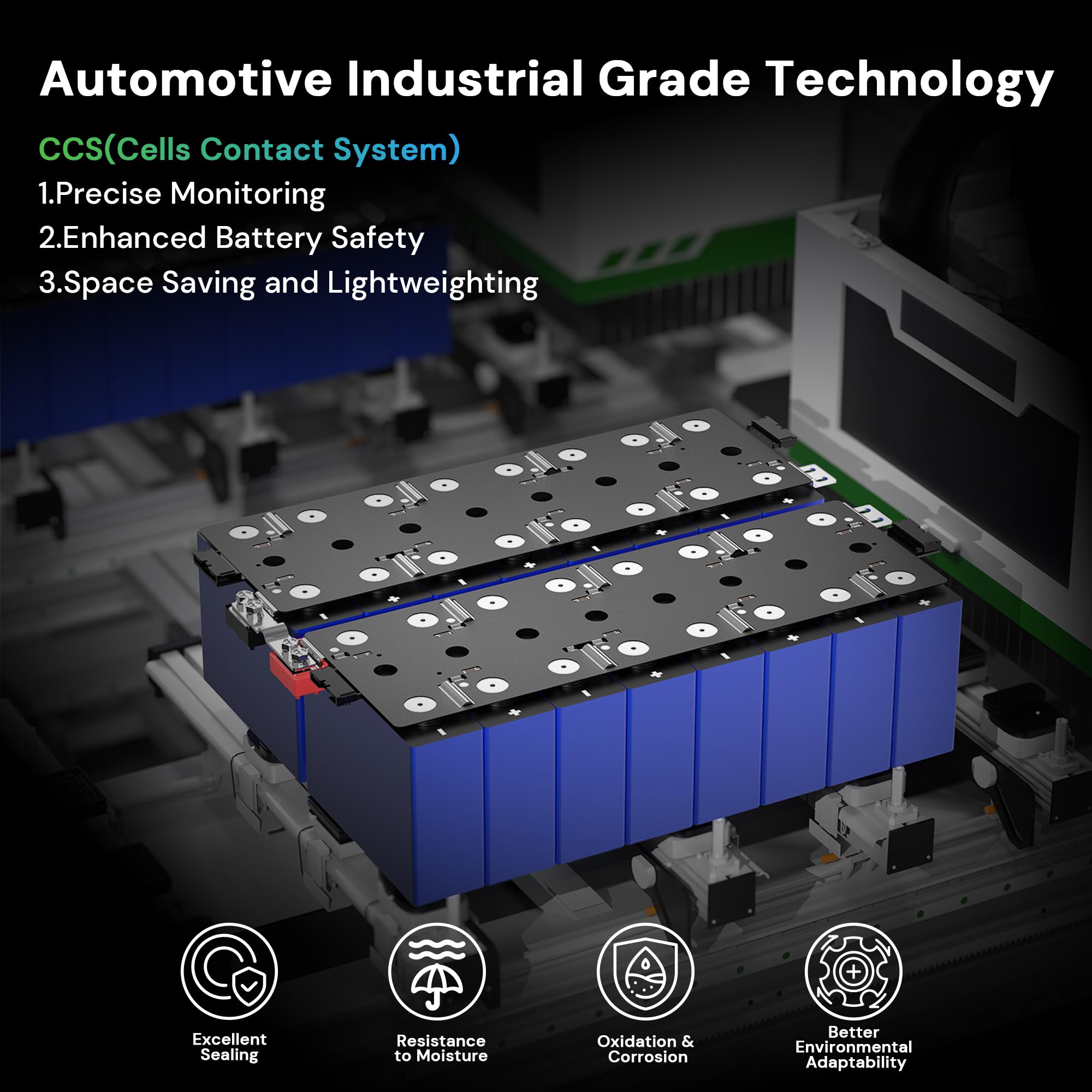 [Automotive-Grade Cell Connection Technology]Dyness lithium iron phosphate battery utilizes newly "Cells Contact System (CCS)" technology, an integrated modular solution for battery cell interconnection. It replaces traditional wiring harnesses by integrating sampling lines (voltage/temperature), communication interfaces, and structural supports into a unified system. This design significantly enhances spatial utilization, and ensures higher consistency and reliability in electrical connections.