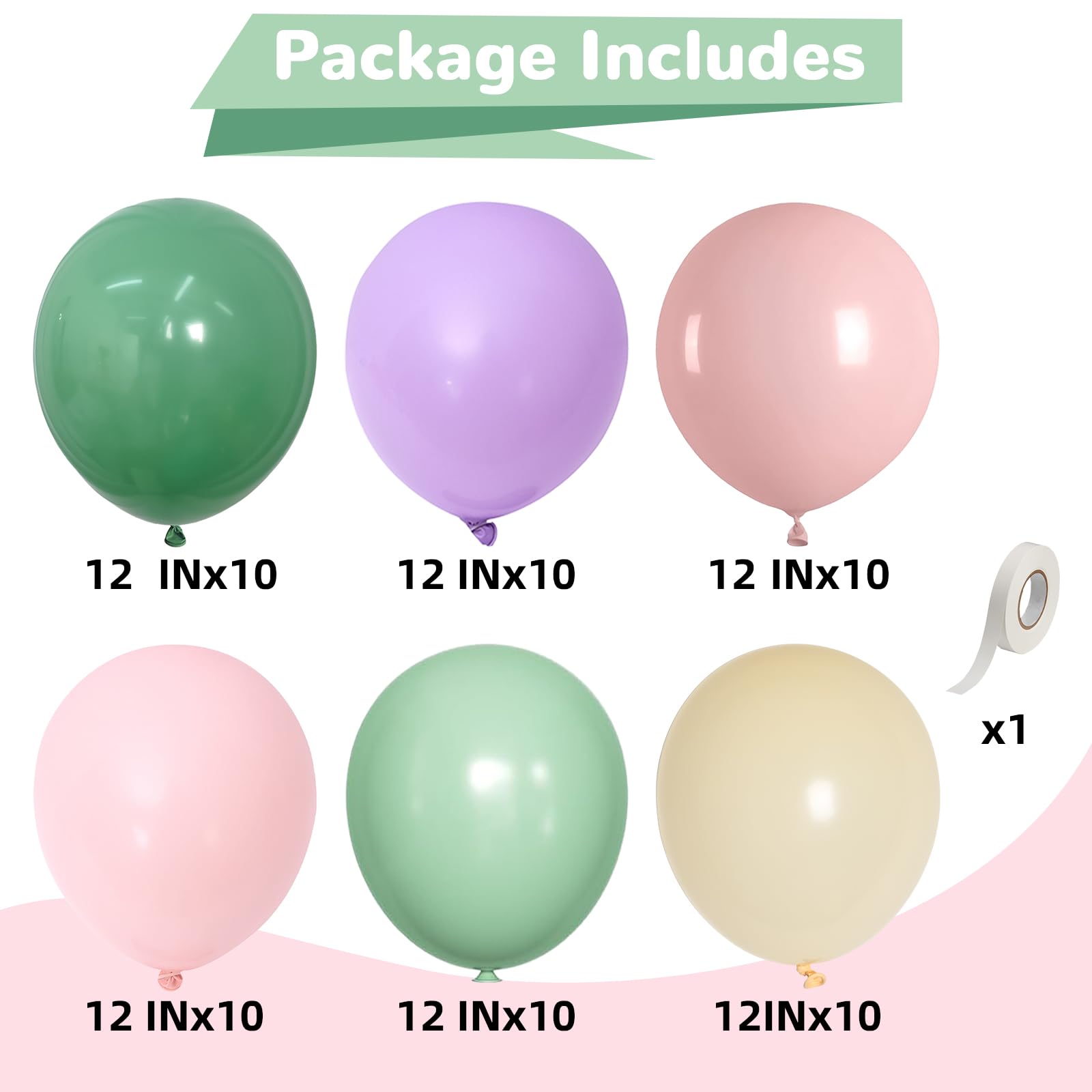 Fairy Themed Party Decorations: Includes 12 inch 10 pcs olive green balloons, 12 in 10 pcs pastel purple balloons, 12 in 10 pcs blush pink balloons, 12 in 10 pcs light pink balloon, 12 in 10 pcs dusty green balloons, 12 in 10 pcs cream balloons and a roll of balloon ribbon