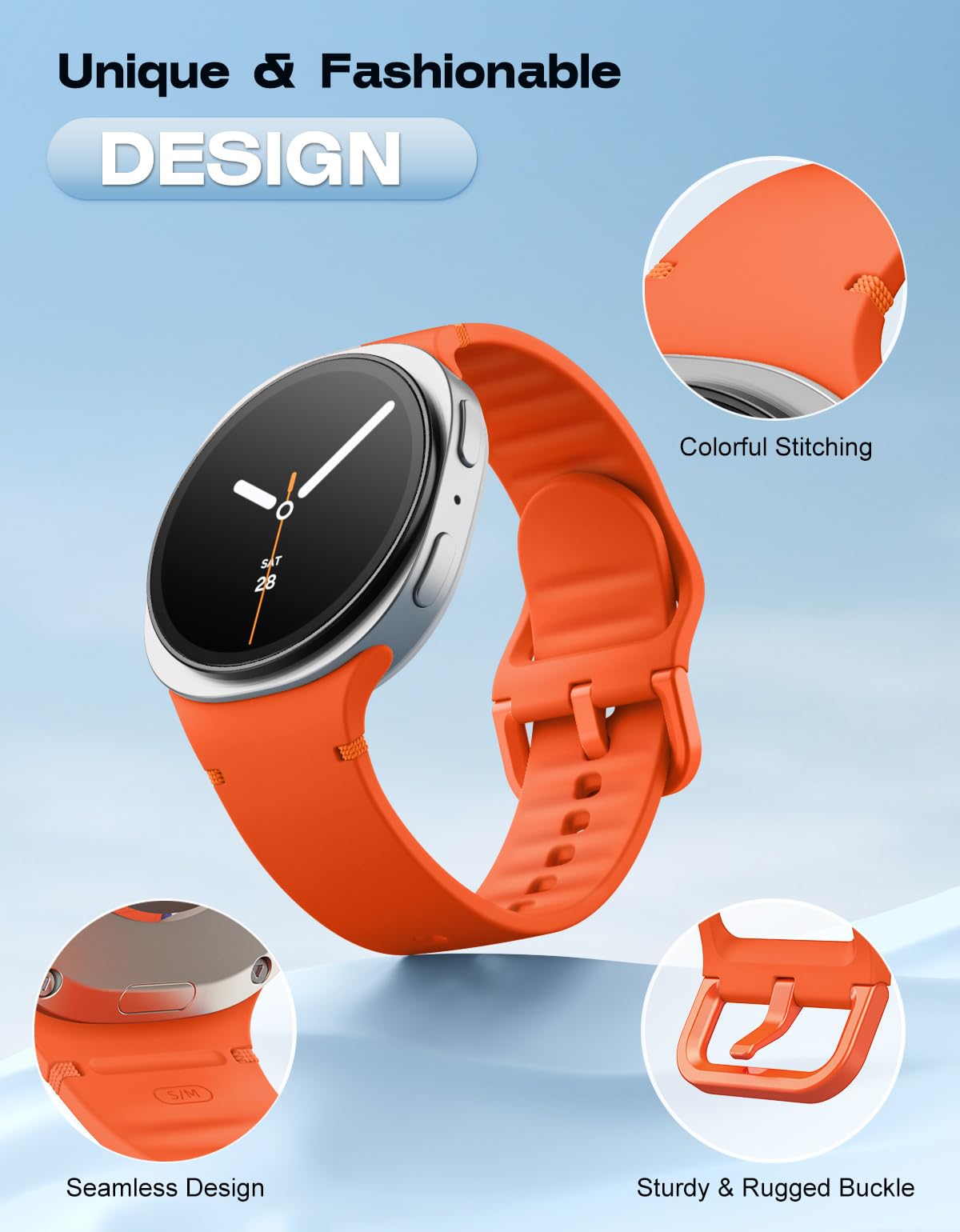Seamless Design: The Galaxy Watch 8 band is accented with colorful stitching, adding a touch of elegance to your wrist, and the rippled design inside the band allows for easy drainage and quick drying of sweat. It has a lugless design that blends seamlessly into the body of the watch, ensuring a sleek look and comfortable fit, especially during intense exercise.