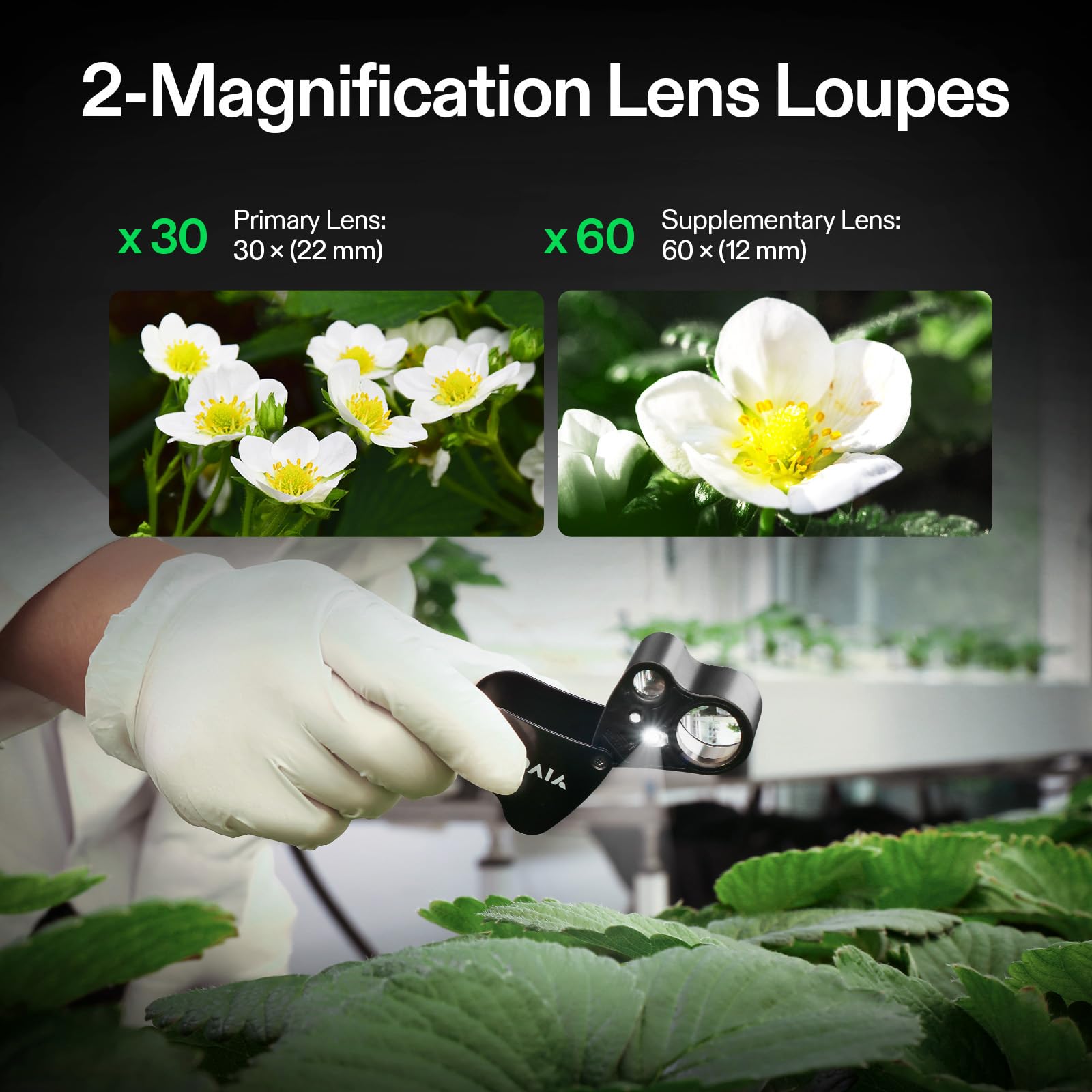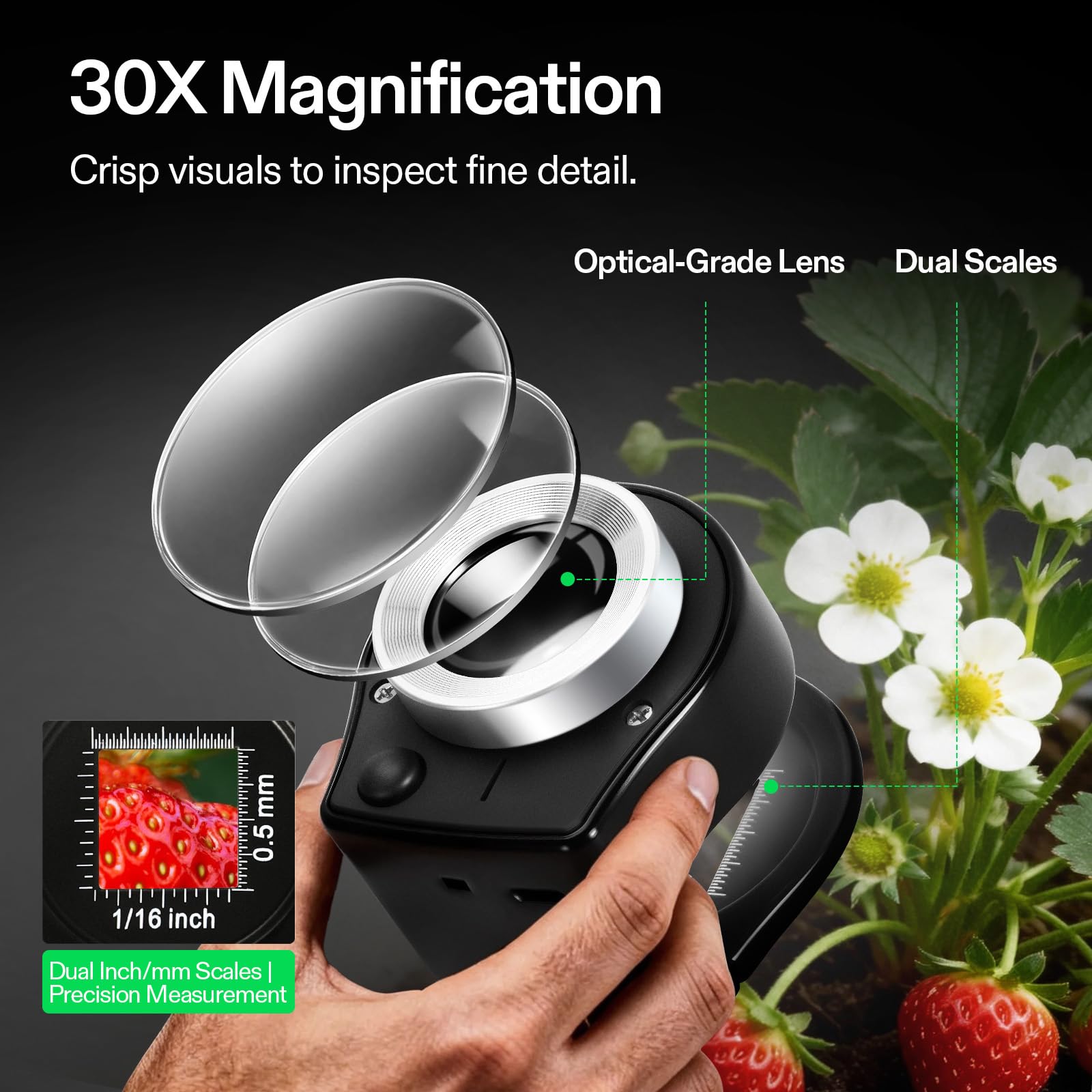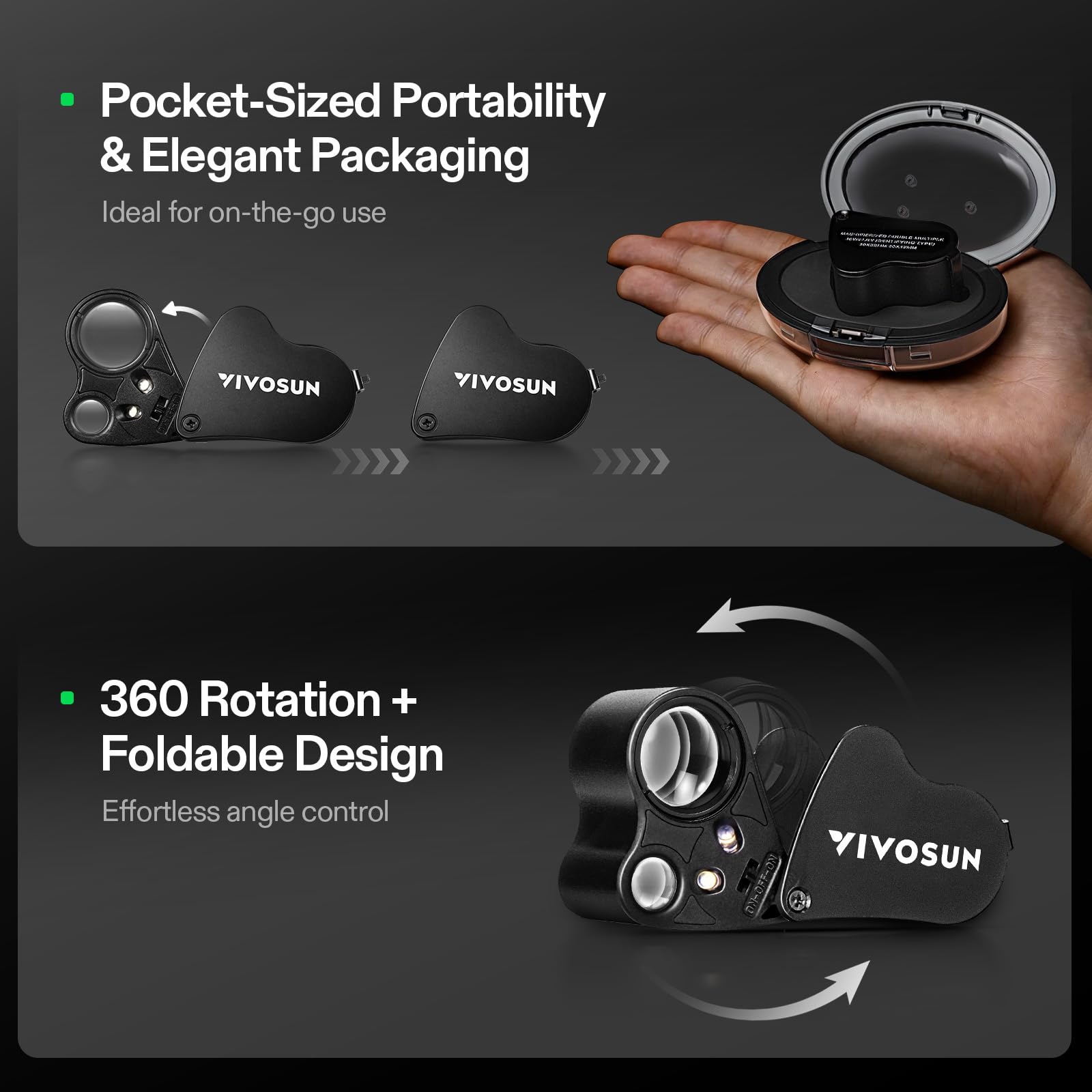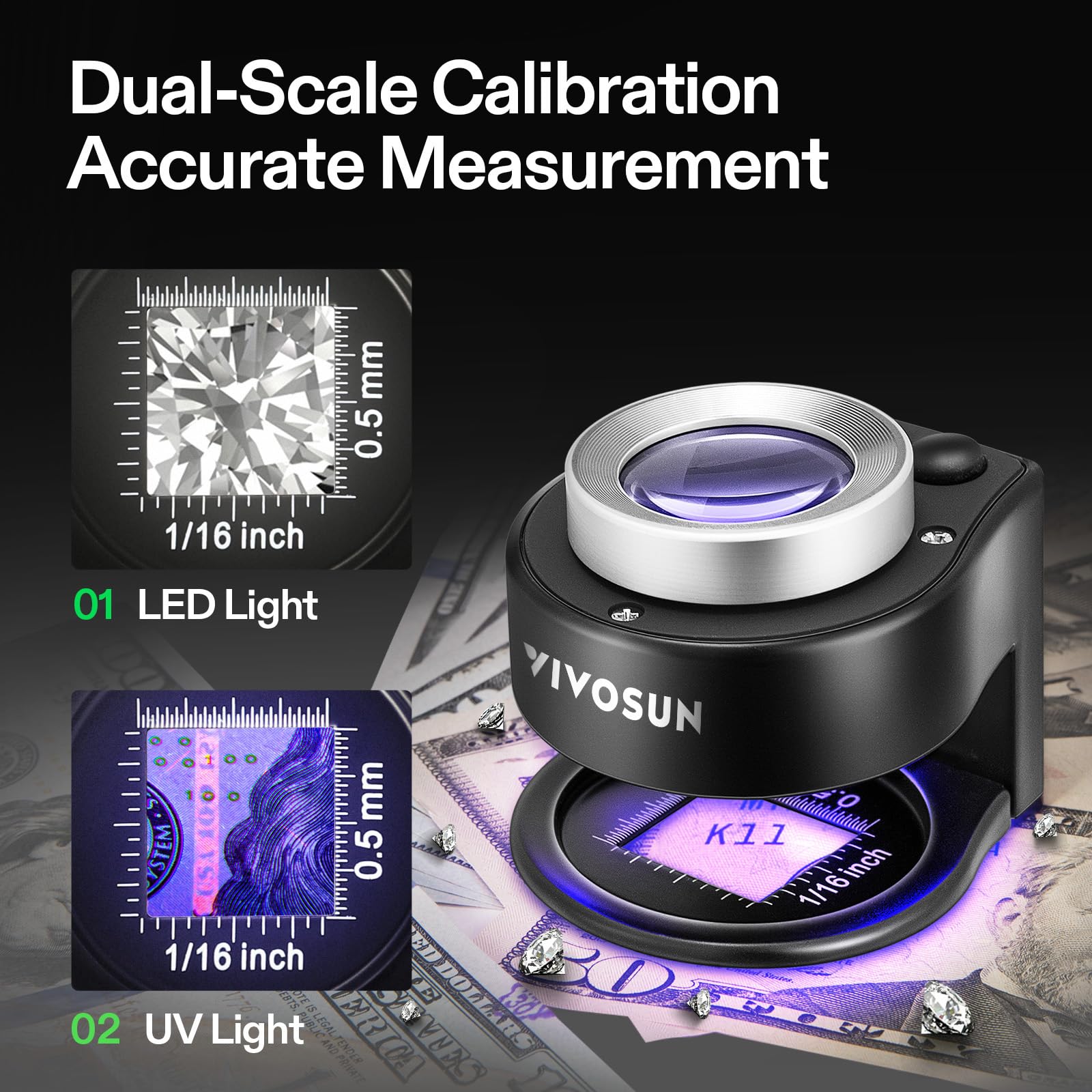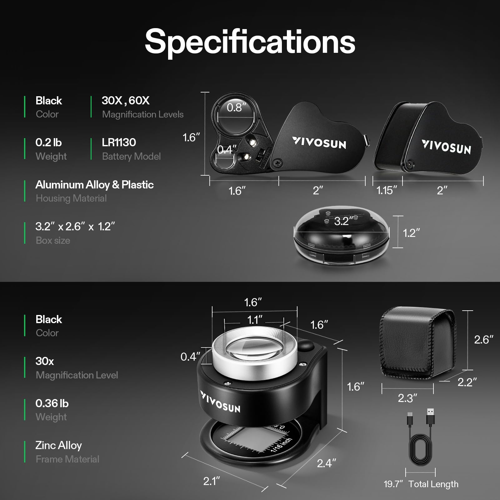 30X/60X Foldable Illuminated Magnifier: This foldable loupe has an aluminum alloy and plastic housing and optical-grade lenses and offers two magnification levels of 30X and 60X for versatile use; It includes 2 bright LED lights to ensure excellent visibility in low-light environments; Includes a storage case and 3 LR1130 batteries that are preinstalled