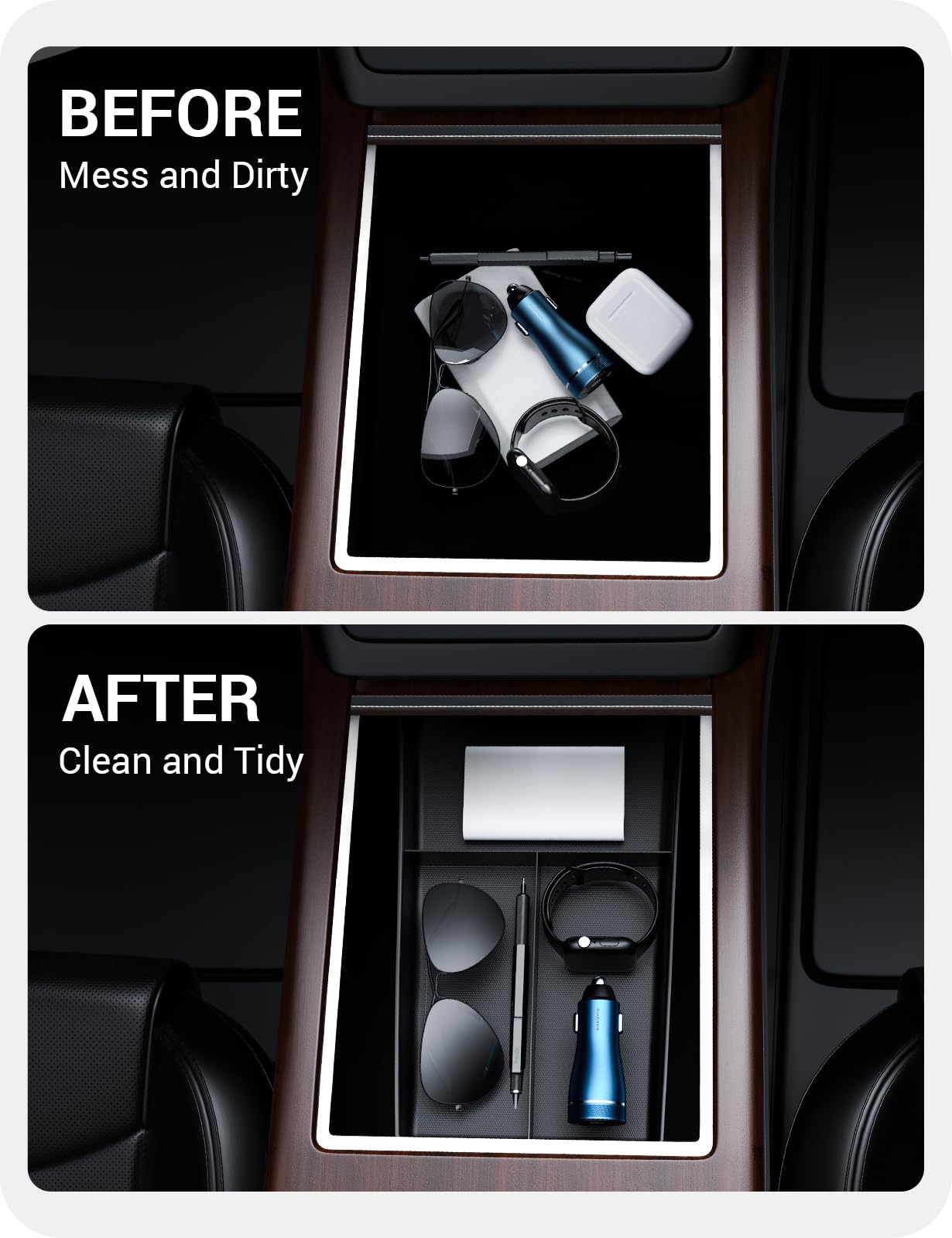 Multi-purpose Use: Transform your cluttered Tesla center console storage with our thoughtfully designed organizer tray featuring high edges and dividers to keep your items tidy, secure, and easily accessible. Whether commuting or on a road trip, your belongings will remain tidy and organized
