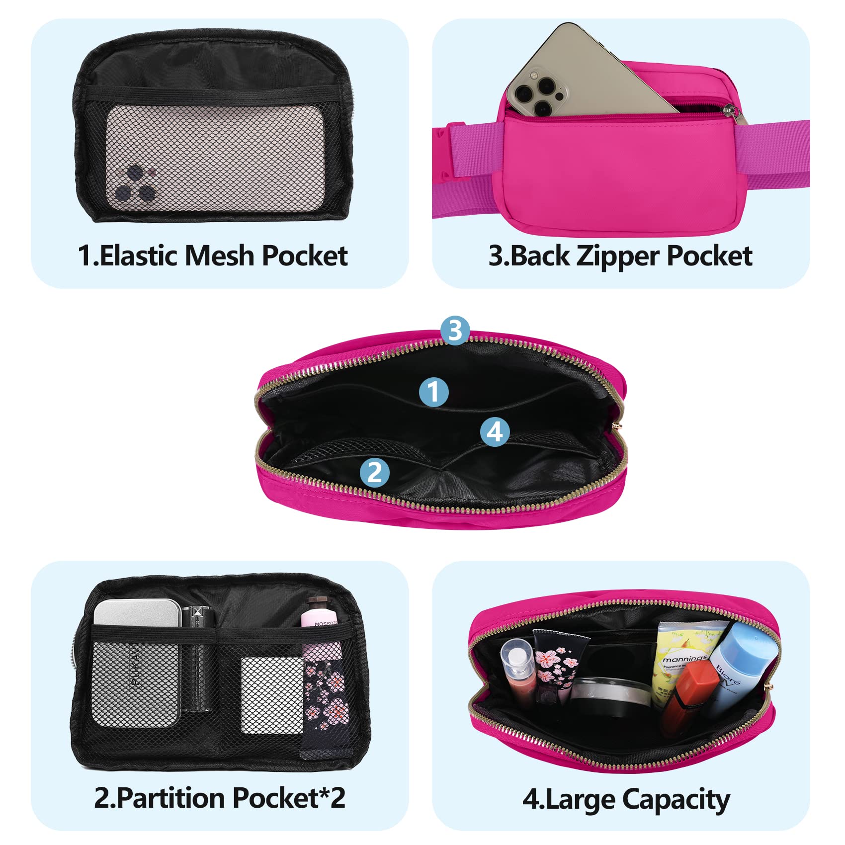 Large Capacity: The Belt packs have one main pocket + back pocket + big insert bag +insert card pocket*2. You can put your mobile phone, key, headset, headset, sunglasses, cosmetics, wallets, passports, etc.
