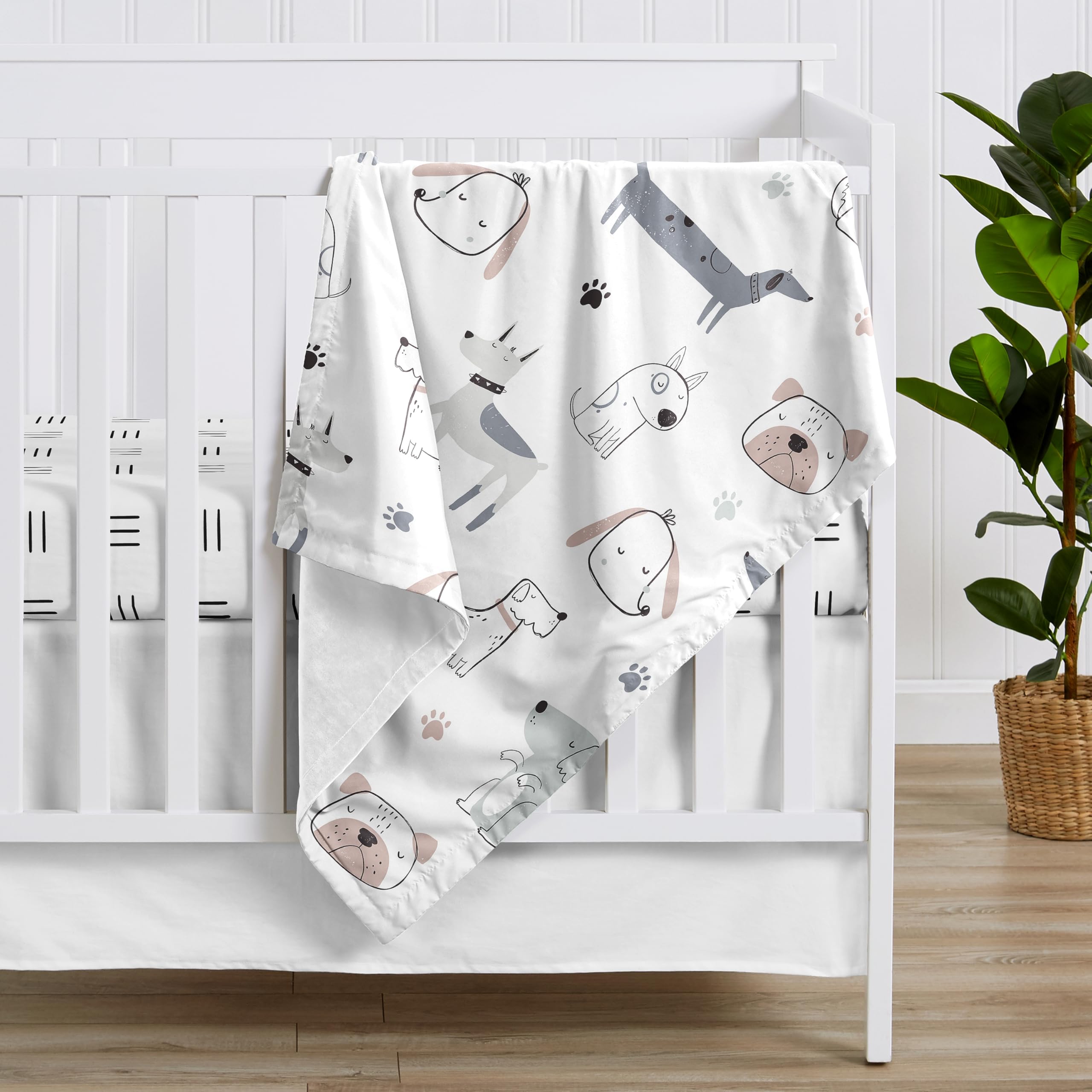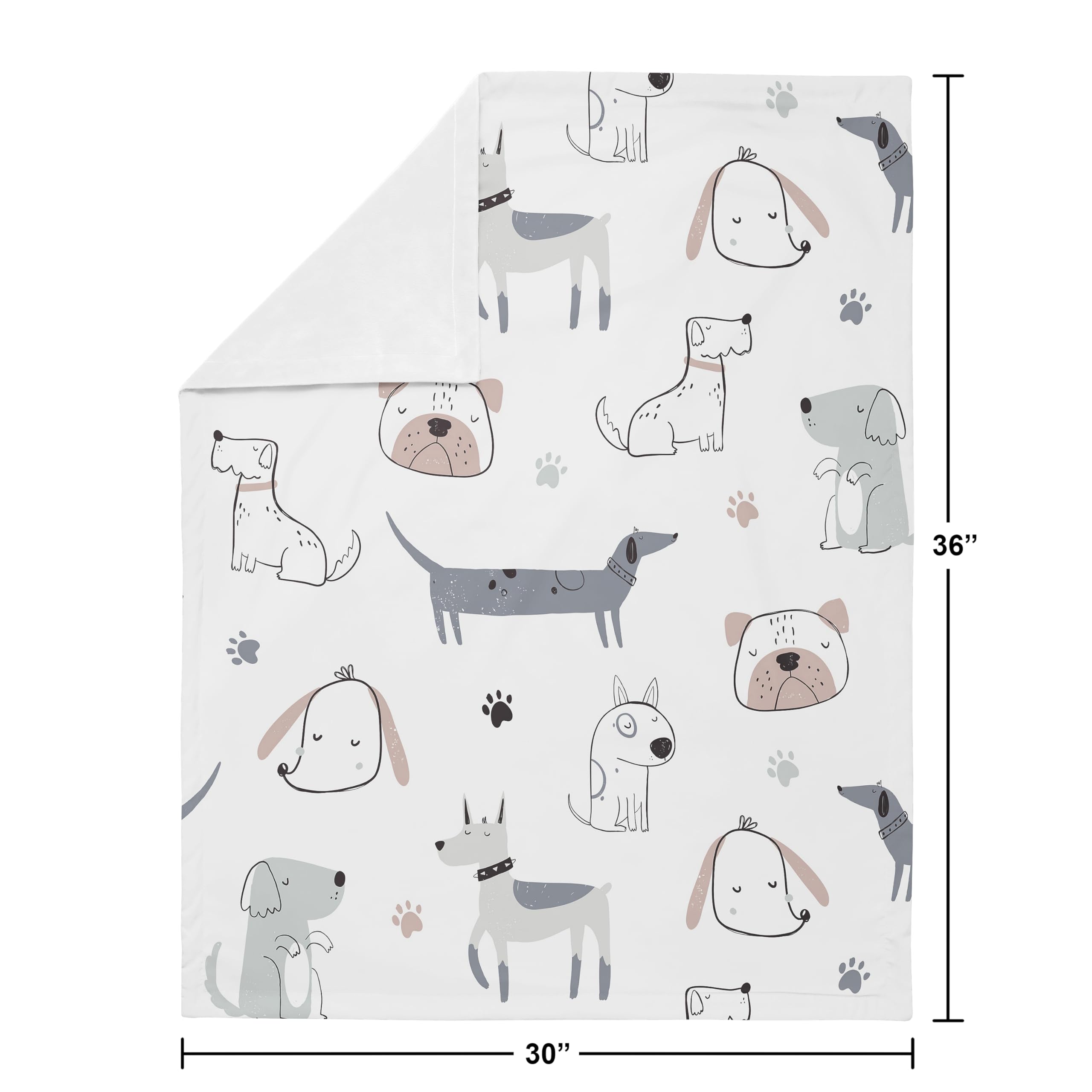 This baby security blanket is designed using a a grey taupe and blue modern watercolor puppy bulldog wiener doggy pet puppies dog and paw brushed microfiber print and reverses to a soft white minky.