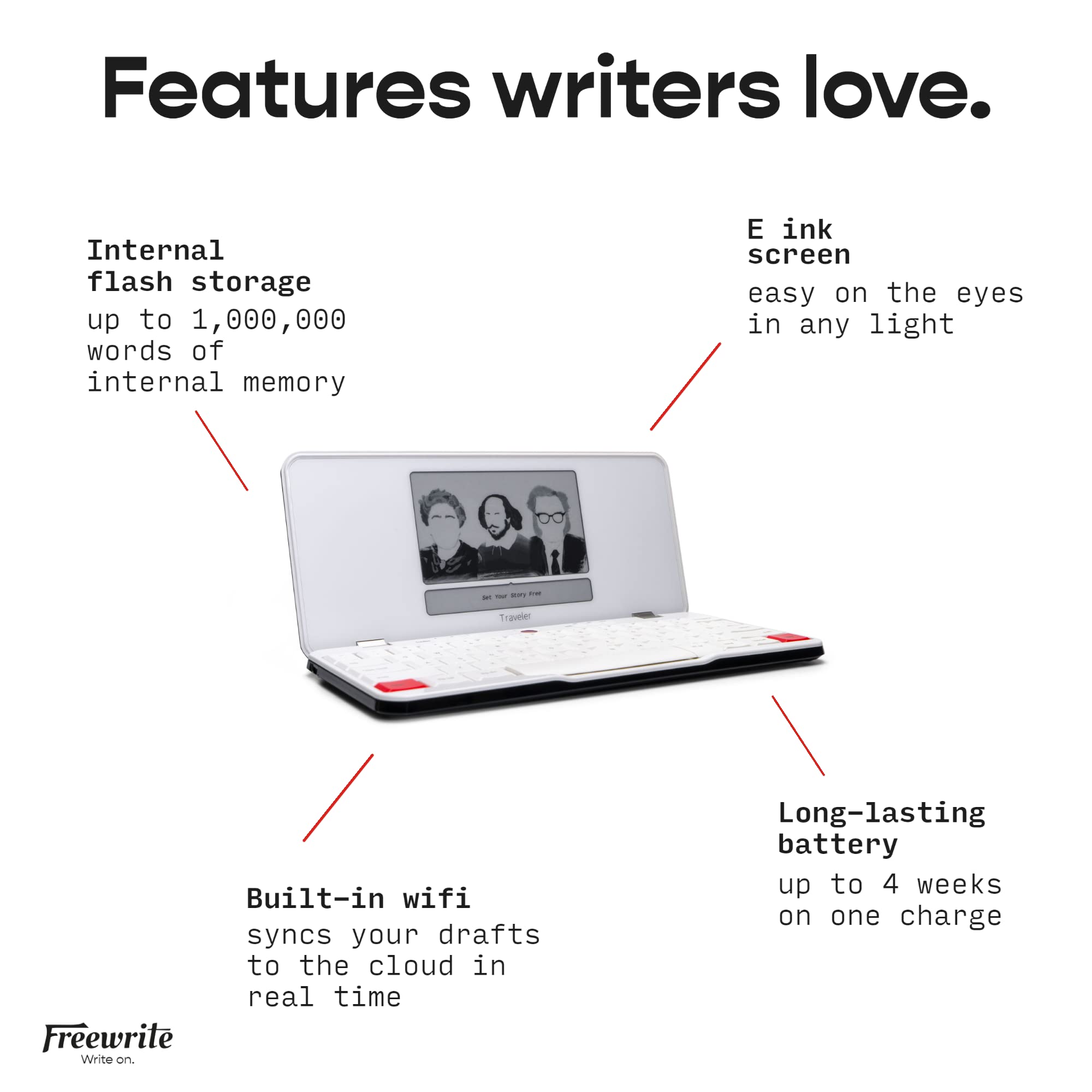 ELIMINATE DISTRACTIONS — Always struggling to resist distractions (notifications, emails, internet browsing, social media, etc.) when trying to write on your laptop? Traveler by Freewrite is a portable typewriter that functions as a truly distraction-free word processor, so you can focus and become absorbed in your writing—and not the latest cat memes.
