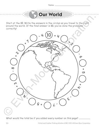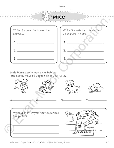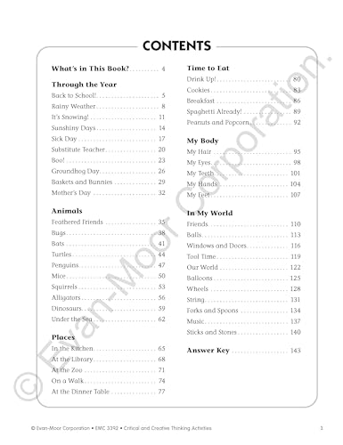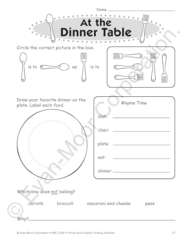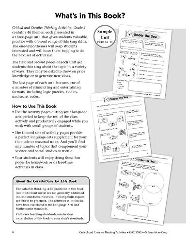 Evan-Moor Critical And Creative Thinking Activities Book of 140+ pages of fun, imaginative activities to practice thinking with variety of curriculum and theme based topics. It has 46 theme-based units with activities that fit the core curriculum like through the year: back to school!, rainy weather, it's snowing!, sunshiny days, sick day, substitute teacher, boo!, groundhog day, baskets and bunnies, mother's day, animals: feathered friends, bugs, bats, turtles, penguins, mice, squirrels, alligators, dinosaurs, under the sea, places: in the kitchen, at the library, at the zoo, on a walk, at the dinner table, time to eat: drink up!, cookies, breakfast, spaghetti already!, peanuts and popcorn, my body: my hair, my eyes, my teeth, my hands, my feet, in my world: friends, balls, windows and doors, our world, balloons, wheels, string, forks and spoons, music, sticks and stones. It is ideal for grade 2 students.