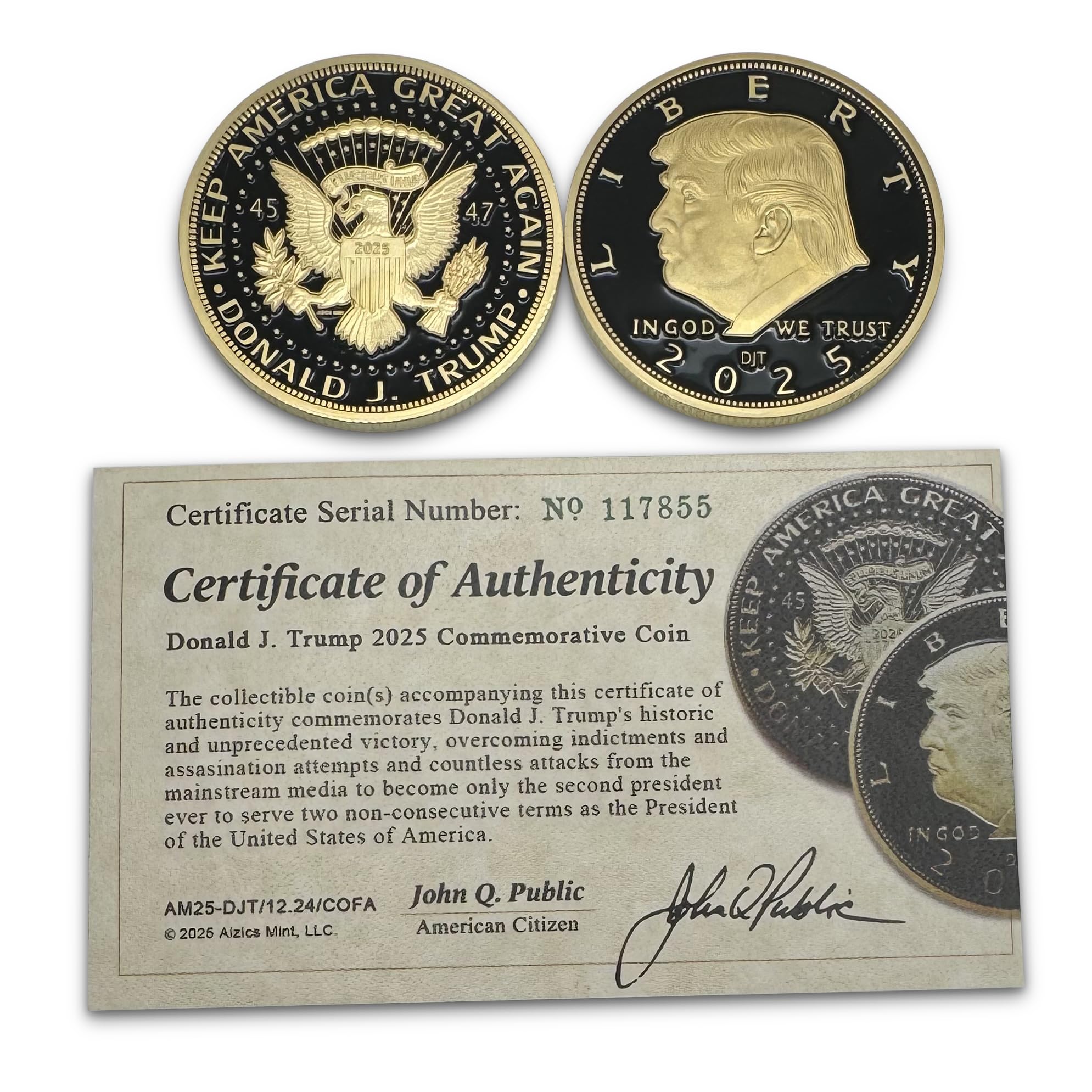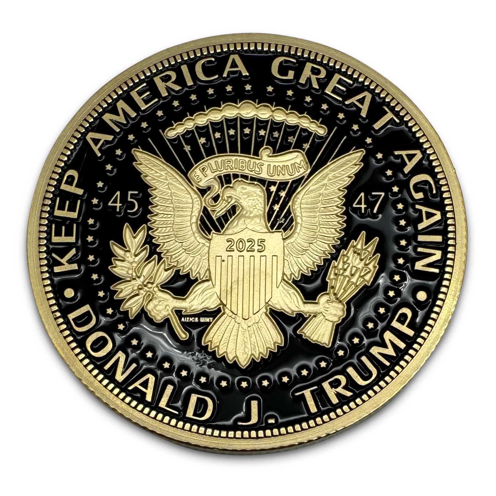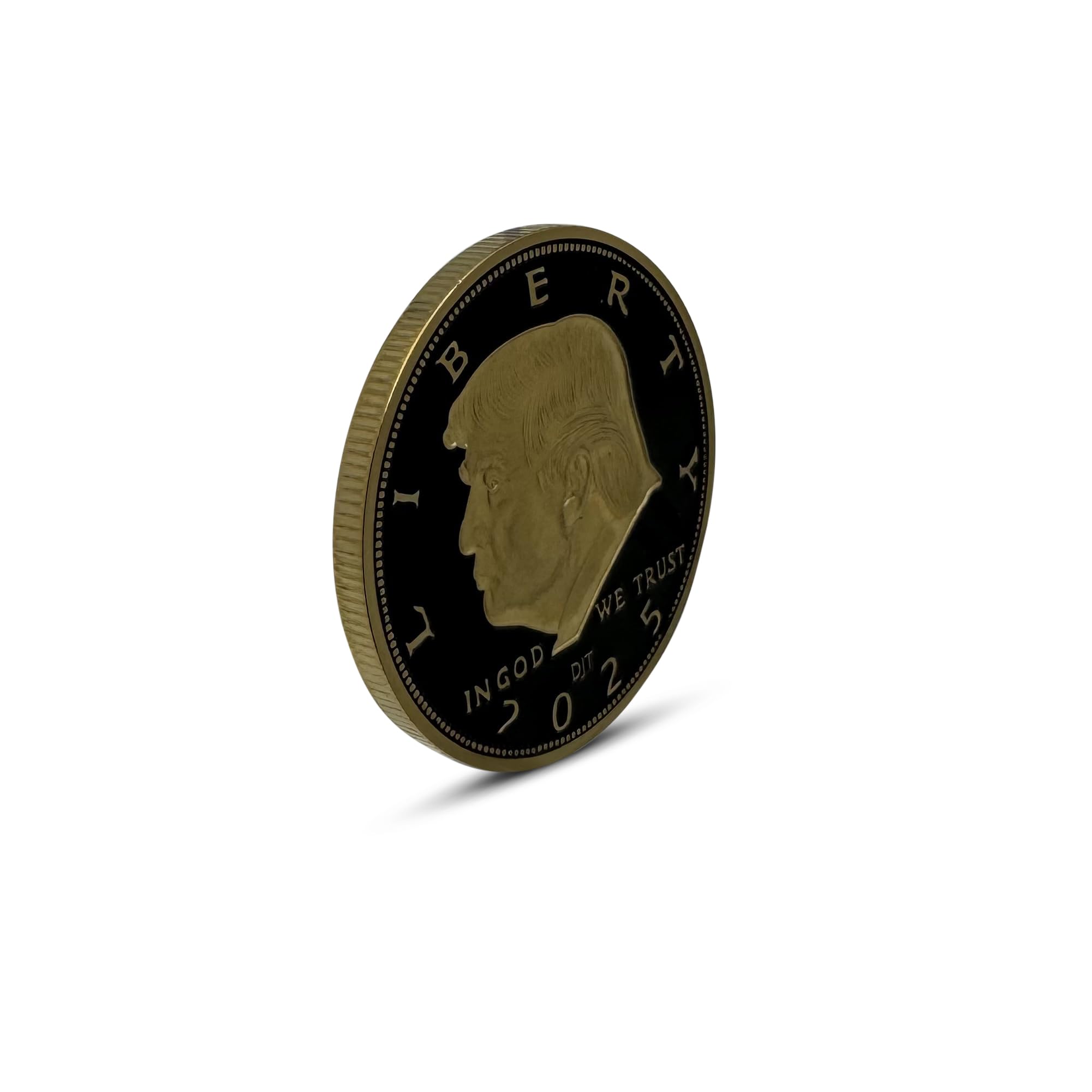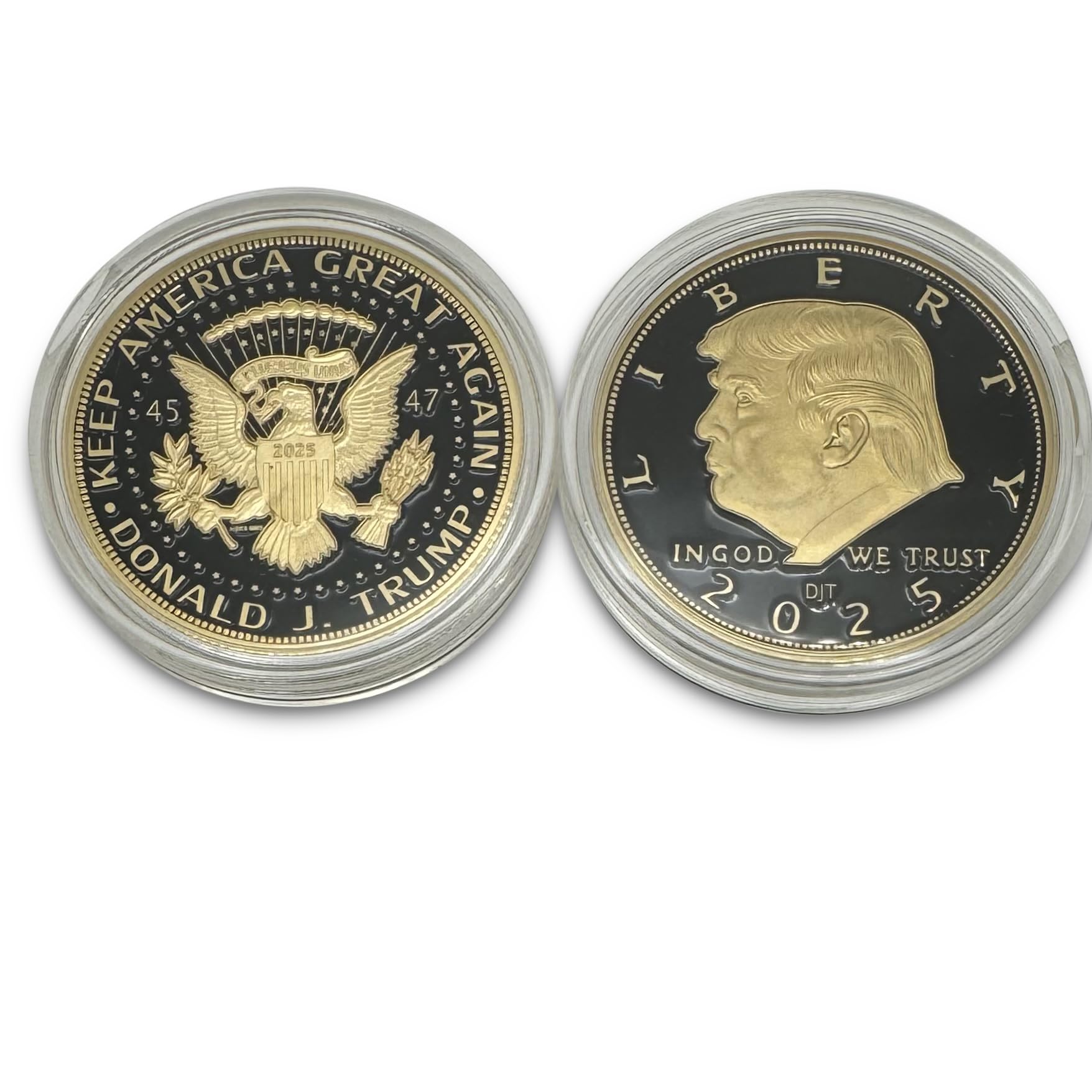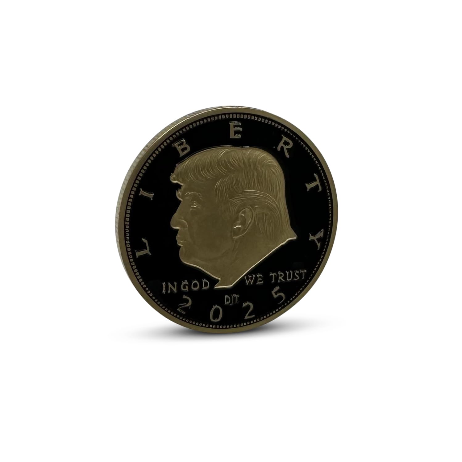 COLLECTIBLE. First edition, one of a kind 2025 Donald J. Trump gold coin for collectors is the perfect addition to your MAGA President Trump challenge coins, memorabilia, flags, hats, t-shirts, bobbleheads, and pens