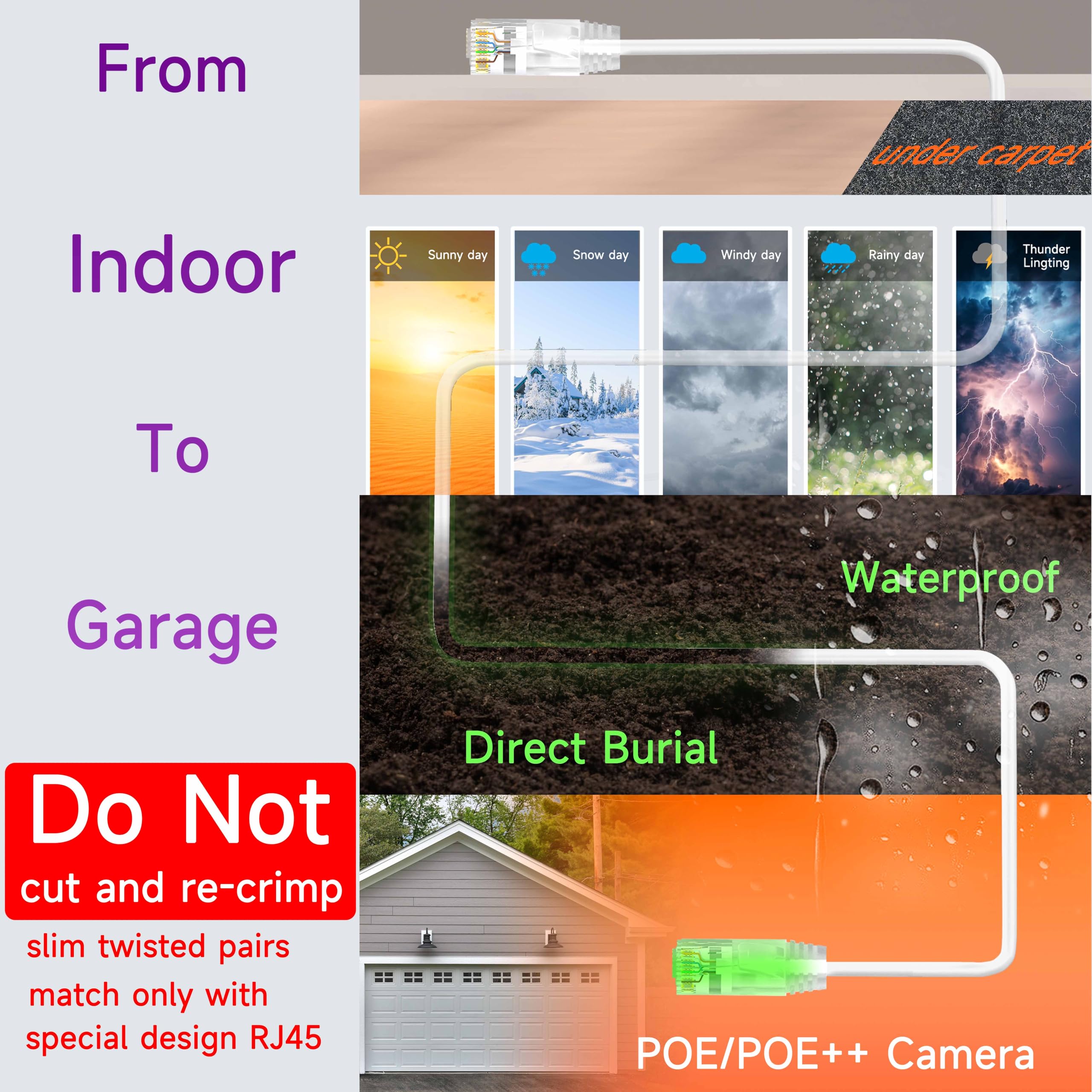 From house to garage: Long ethernet cable 100 feet is the best way to connect Ethernet from house to out building. Have ethernet cable cat 6 start from the modem, along with the baseboard, through conduit, out of house, down a wall, exposed to the outdoors, direct buiral, across a garage, POE for carmera or AP. Underground cat 6 ethernet cable perfectly cope with various weather conditions and outdoor Ethernet cable installation challenges.