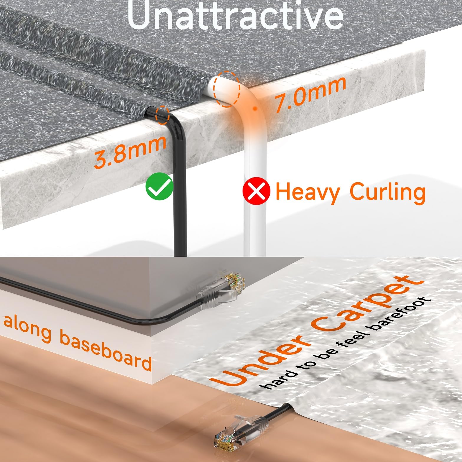 Unattractive: The thin design makes cat 6 ethernet cable 75 ft very easy to run along walls and carpets, and then up walls along door frames. It's so thin, almost gone, unless you really want to find cat 6a ethernet cable 75 ft, you can't even feel it barefoot.