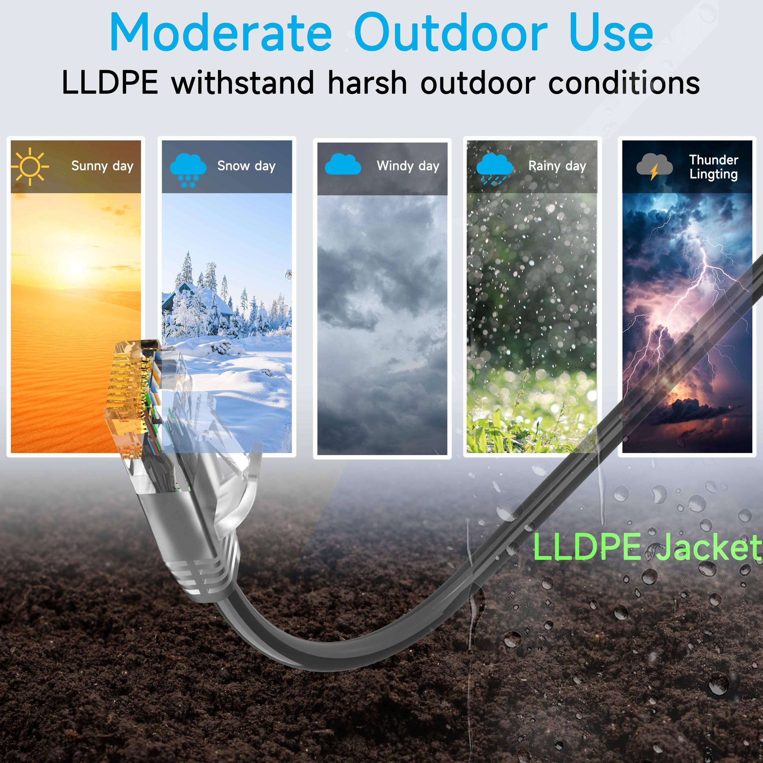 Moderate Outdoor Use : The waterproof cables enable cat6 ethernet cable to withstand harsh outdoor conditions. The sturdy LLDPE outer sheath of cat 6 outdoor ethernet cable is weather resistant, highly resistant to rain, snow, and harsh sunlight, ensuring stable connection under all conditions.
