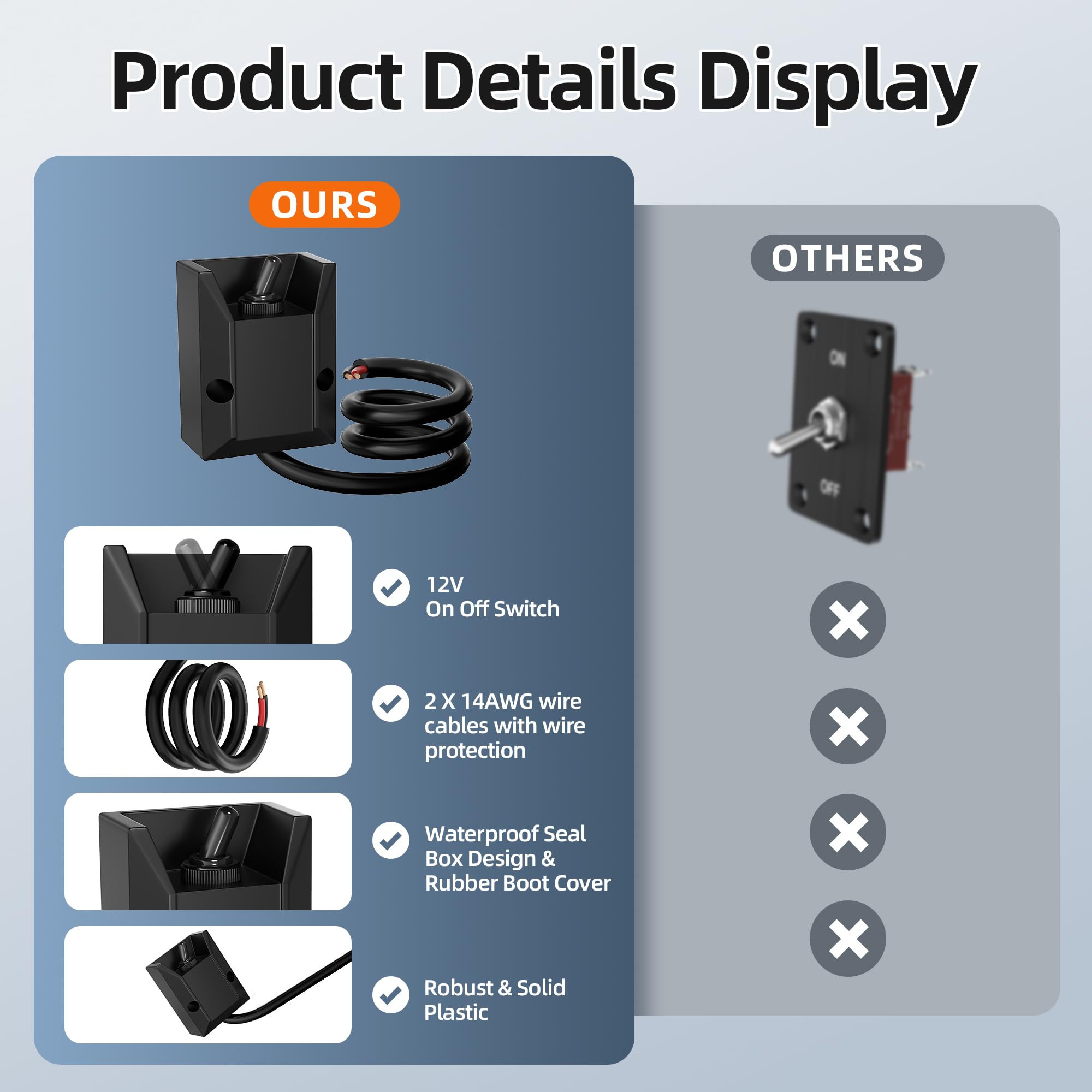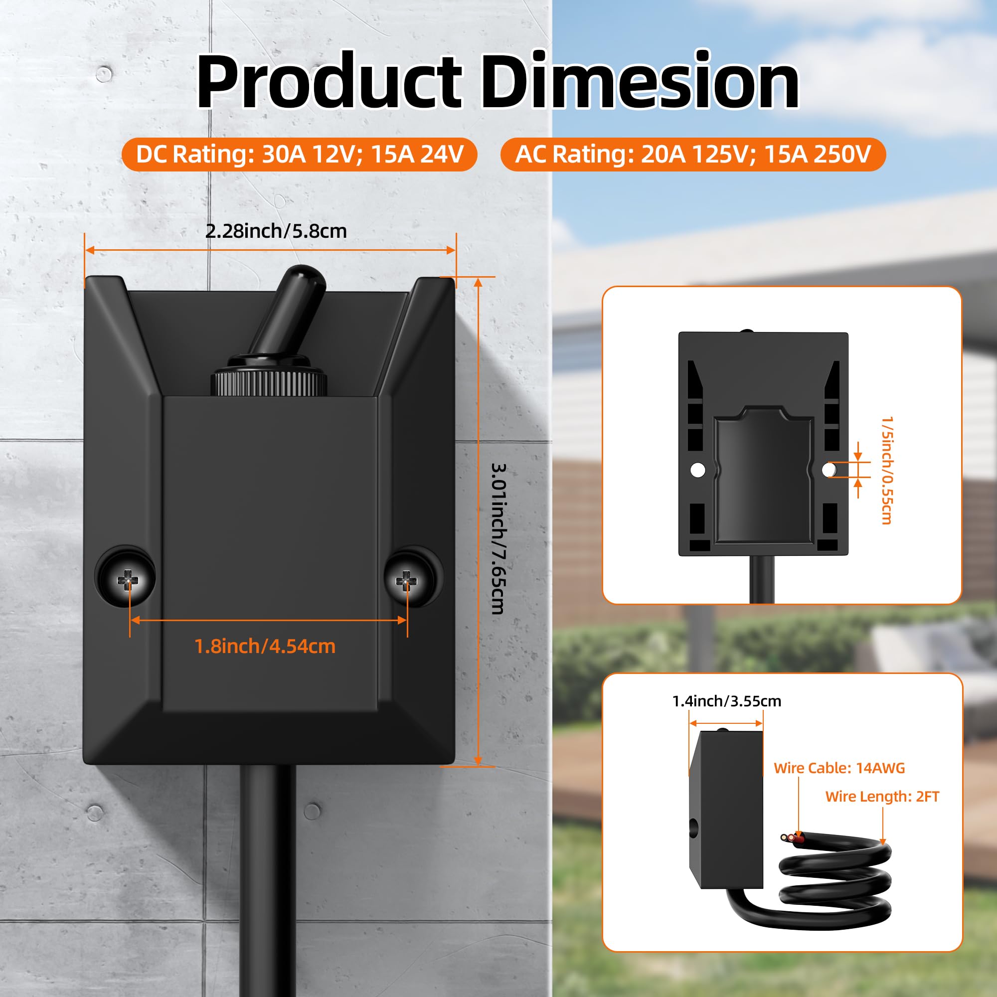 Ease of Installation: Our 12V toggle switch comes with 2 X 14AWG wire cables with wire protection which can prevent your wiring from short circuiting. It also comes with 2pcs mounting screws, so you can install it directly. The unique design also makes your installation more convenient and safer compared with other's