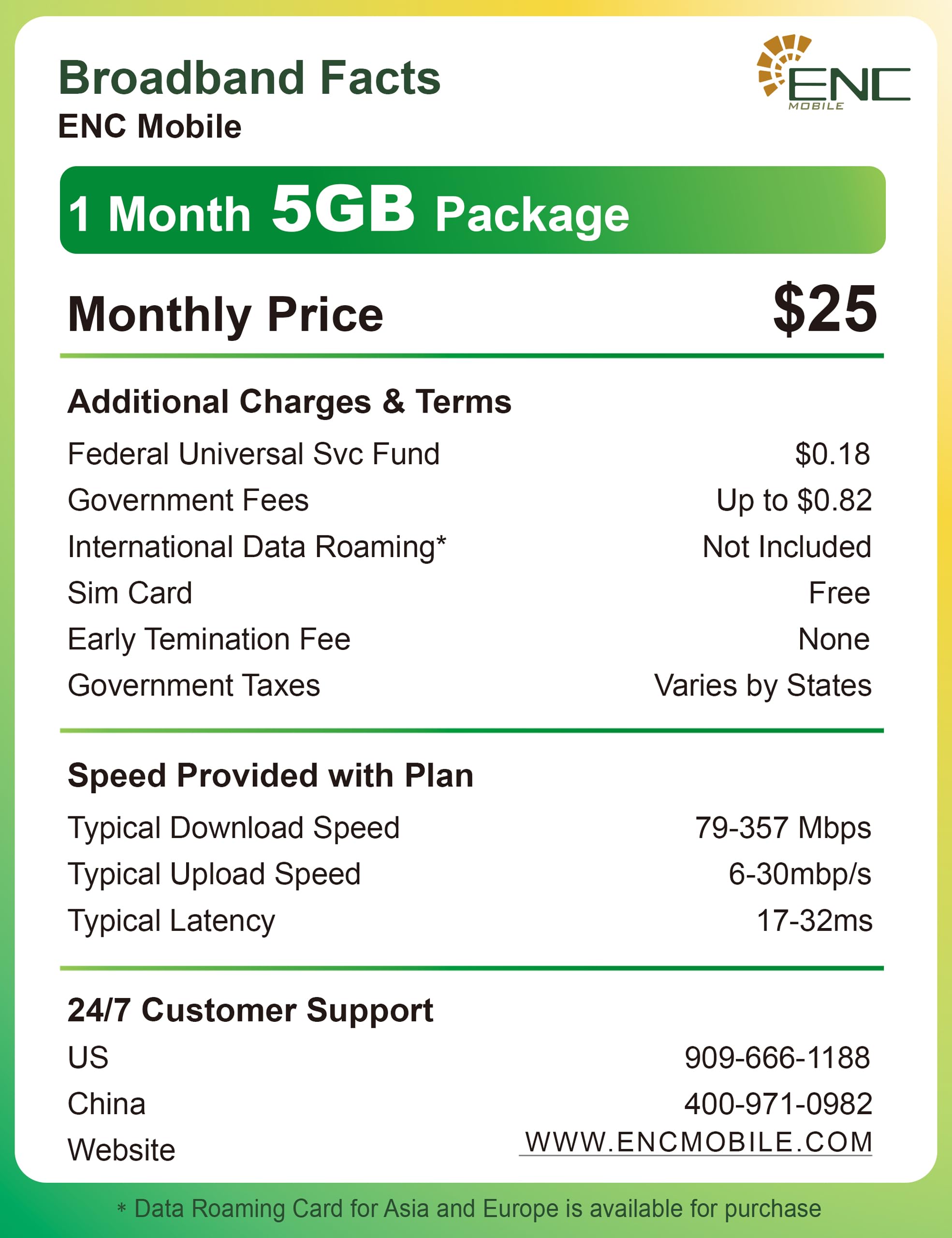【Affordable. No Contract SIM Card】 Stay connected in the US with our affordable, no-contract Prepaid SIM card! Choose the plan that fits your needs with no long-term commitment. The $25/mo plan includes 5GB 5G-4G LTE data each month, unlimited US talk & global text, Free Wi-Fi Calling. Plus Free & Unlimited International Calling to Canada, Mexico, Mainland China, Hong Kong, Macao and Taiwan(landlines).