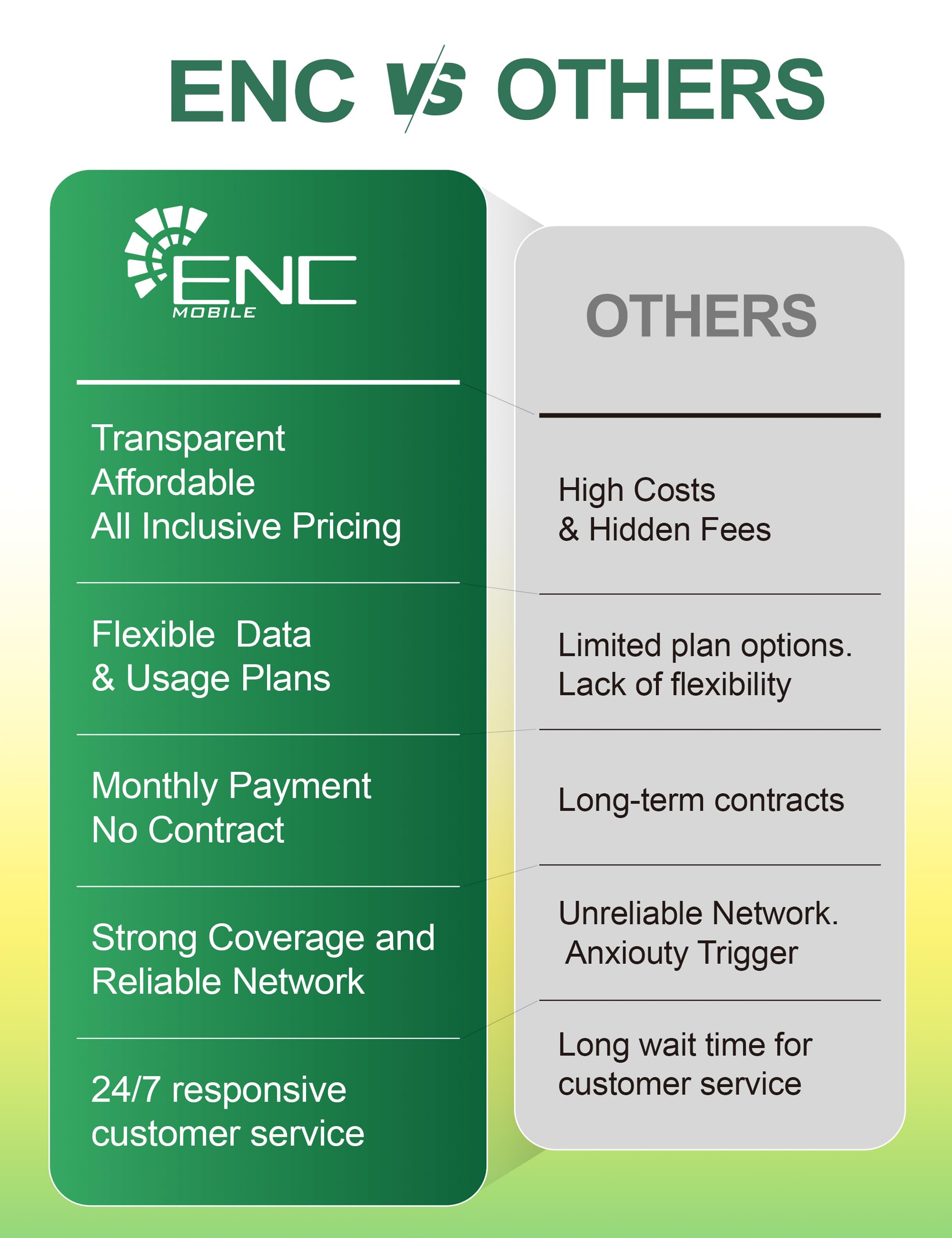 【24/7/365 days Responsive Customer Service】Tired of the waiting game? ENC Mobile’s customer service is 24/7/365 days ready to help. If you have any questions about our plan, activation or renewal, please feel free to contact us.