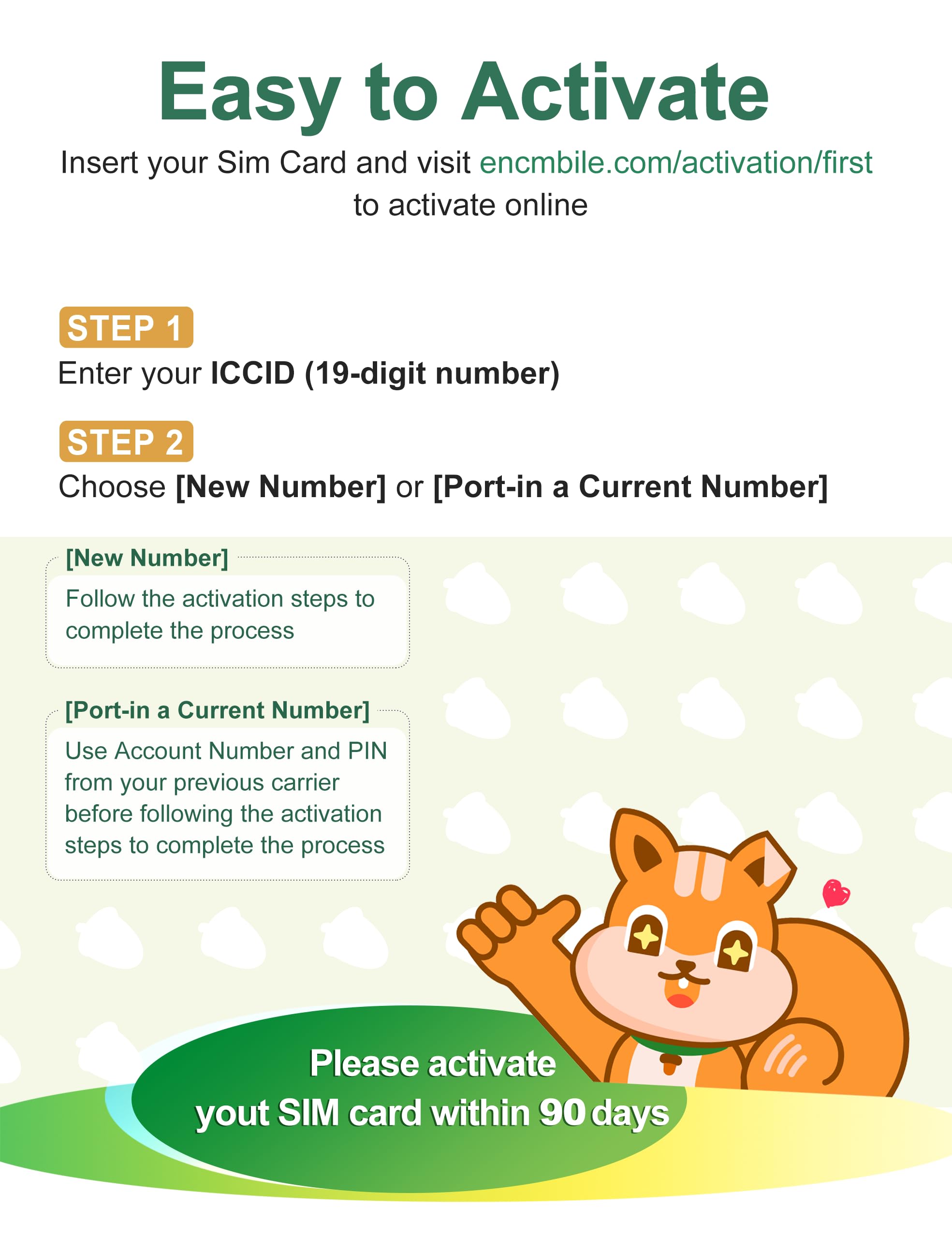【Easy to Activate】 This SIM card for cell phones comes as a 3-in-1 card with standard, micro, and nano sizes. Activation is quick and easy - simply goes to ENC Mobile’s website and follow the instructions to activate on your unlocked device. You can choose to keep your current number or get a new number. Note that it needs to be activated within 90 days of receipt.