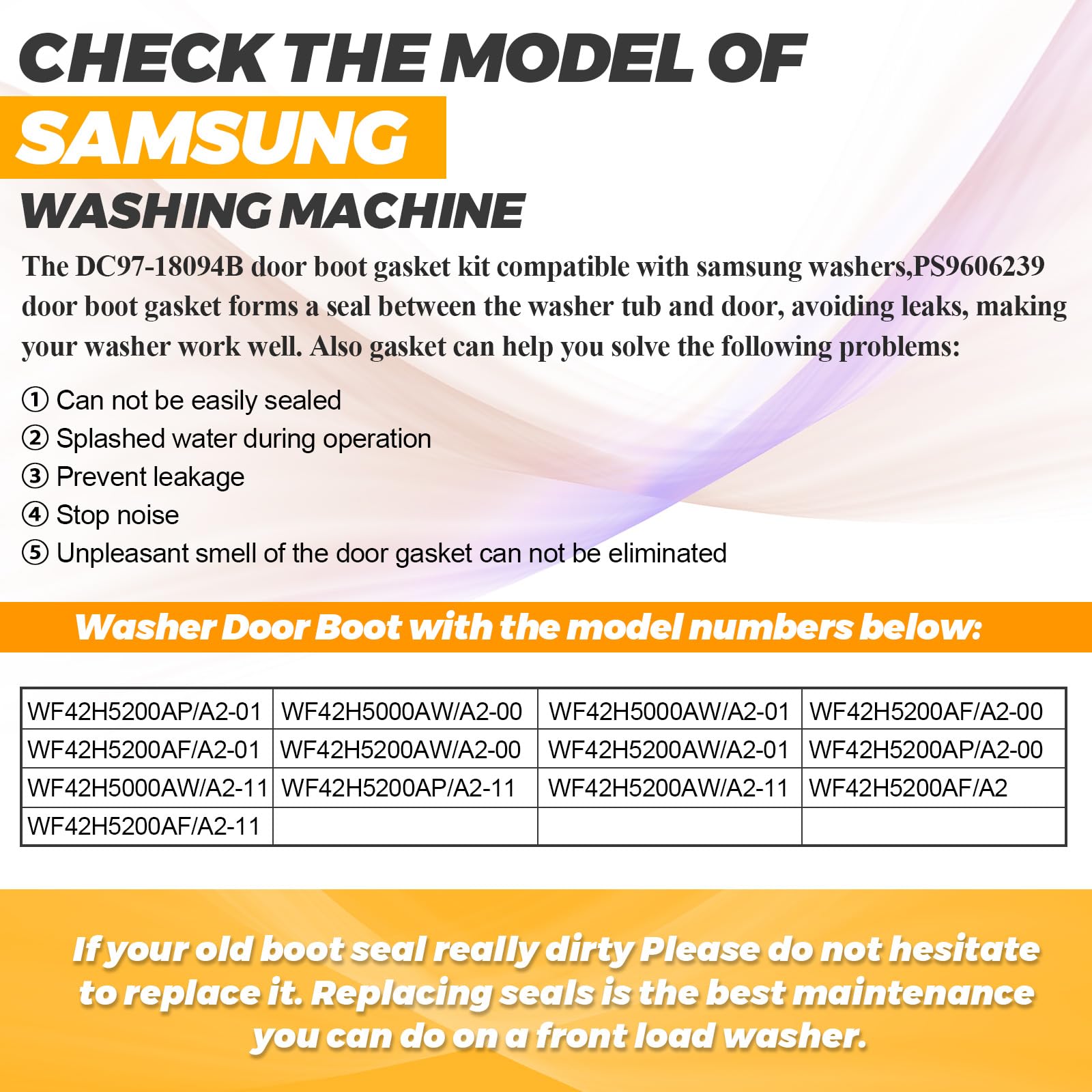 ใ๐๐๐ซ๐๐ฆ ๐ง๐๐ ๐๐ข๐๐๐ข๐ช๐๐ก๐ ๐ฃ๐ฅ๐ข๐๐๐๐ ๐ฆใ:โ Replace the old washing machine door diaphragm, get rid of laundry odors and leaks! If your washer has the following problems: โ Abnormal noise โกSplashes water during operation โขLeaking โฃCannot be sealed due to damage to the sealing ring โคCorrosion and aging โฅDoor Gasket had mold, you can replace the old washer door seal and a new samsung dc97-18094b washer door boot seal wf42h5200ap/a2 will keep your washer in top working order