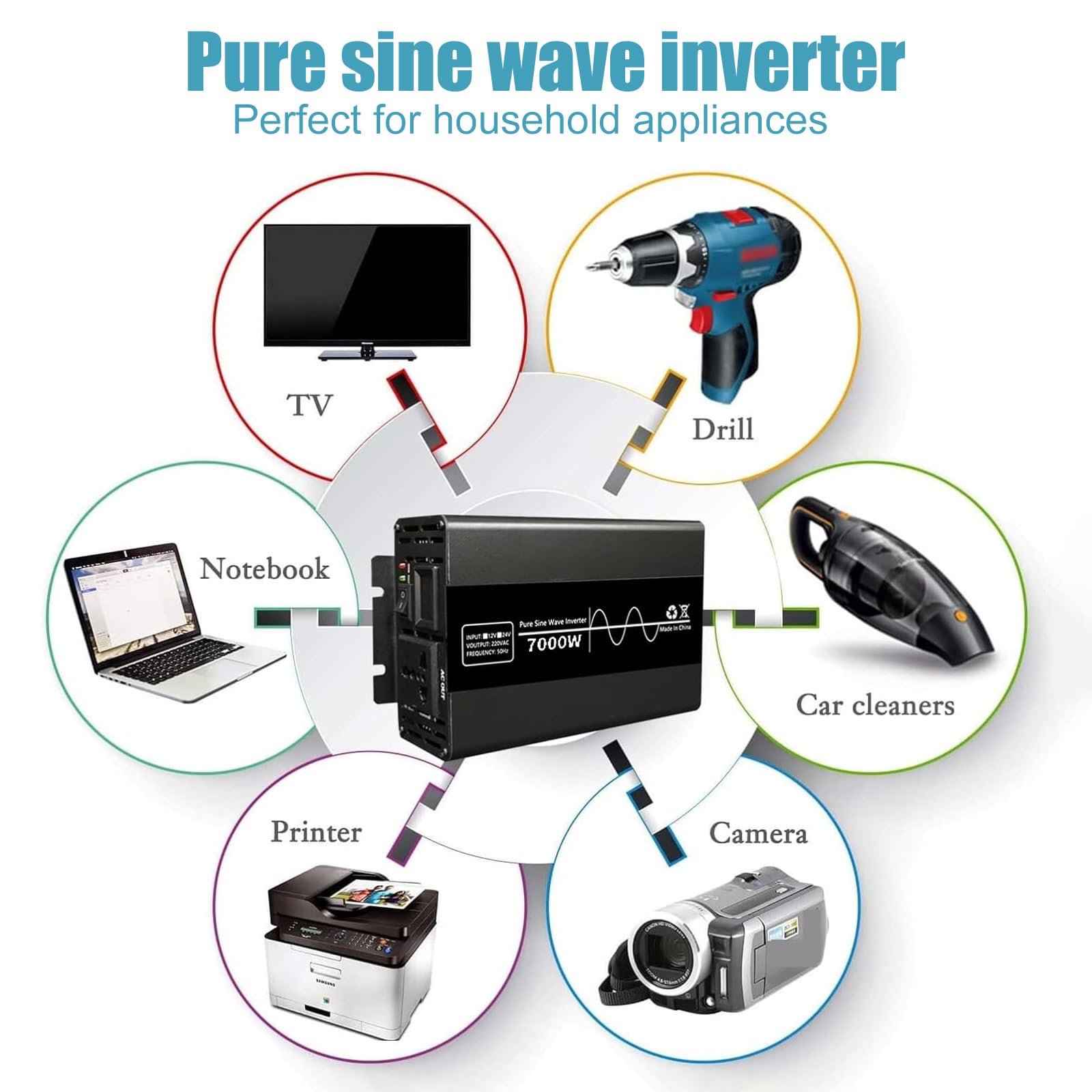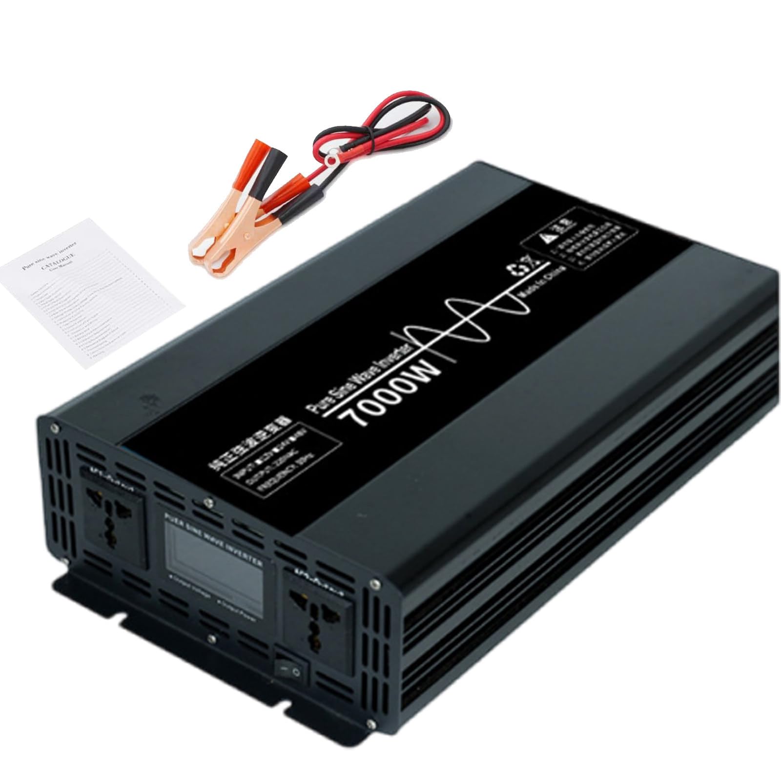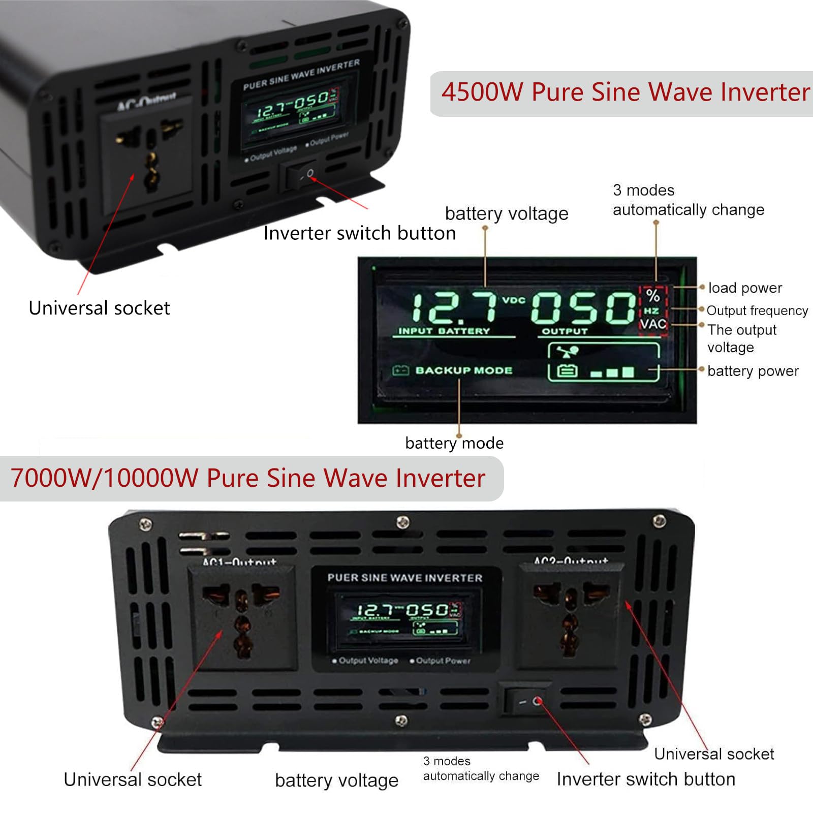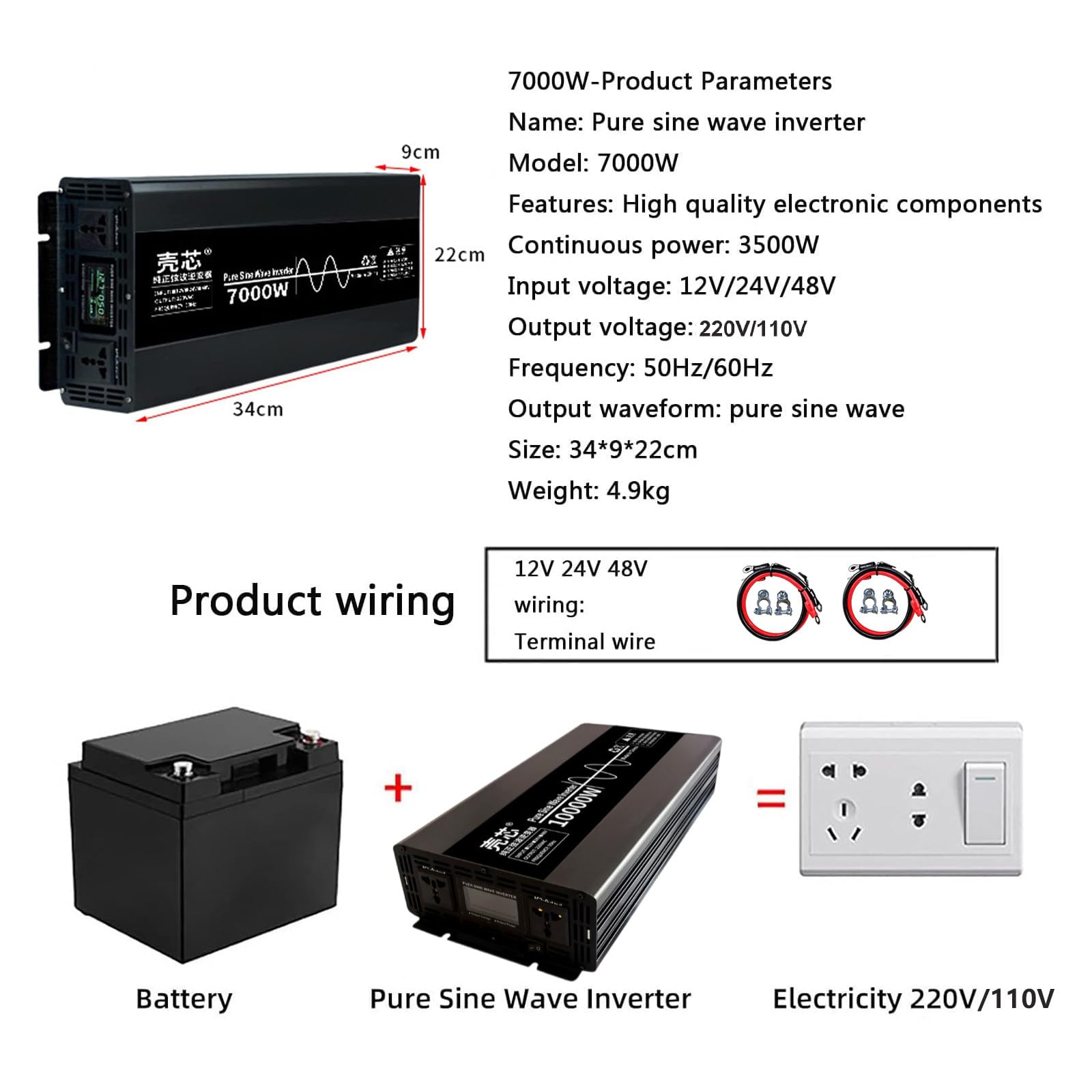 ▶▶Are you still worrying about the power outage? - With this multi-function inverter, you can use ordinary 110V 220V electric appliances in your car/boat/caravan or your distribution garden. Or DIY your own home solar wind power generation system! ▶▶Features: - Stable : Supply continuous pure sine wave output , as stable as main power - Silence : Less audible and electric noise - Save : Less power consumption , less waste - Safe : No damage to your devices ▶▶Specifications: - Name:Pure Sine Wave Power Inverter - Material: aluminum alloy - Output Waveform: pure sine wave - Input Voltage: 12V/24V/48V DC - Output Voltage: 110V/220V AC - Peak Power: 4500W/7000W/10000W (Optional) - Rated Power: 2300W/3300W/5000W (Optional) - Weight: 3.3kg(4500W) /5.25kg(7000W) /6.4kg(10000W) - Output Socket: 2 - LCD Screen: input voltage, output voltage display - Protection: short circuit, undervoltage, overvoltage, overload, high temperature, overcurrent ▶▶ Packing List: - Pure Sine Wave Inverter x 1 - Pure Copper Cables x 1 ▶▶Remarks: 1. Before connecting the inverter, make sure that the inverter switch is off. 2. 12V inverters are only suitable for 12V batteries. 24V inverters are only suitable for 24V batteries. 3. Do not expose the inverter to direct sunlight and store it in a cool, dry environment. 4. Do not use the inverter with products that consume more power than the inverter can supply, as this may damage the inverter and the product. ▶▶Customer service: - As an honest international seller, customer satisfaction is our top priority. If you have any questions about the product, please send us an email in time and we will answer your questions as soon as possible.
