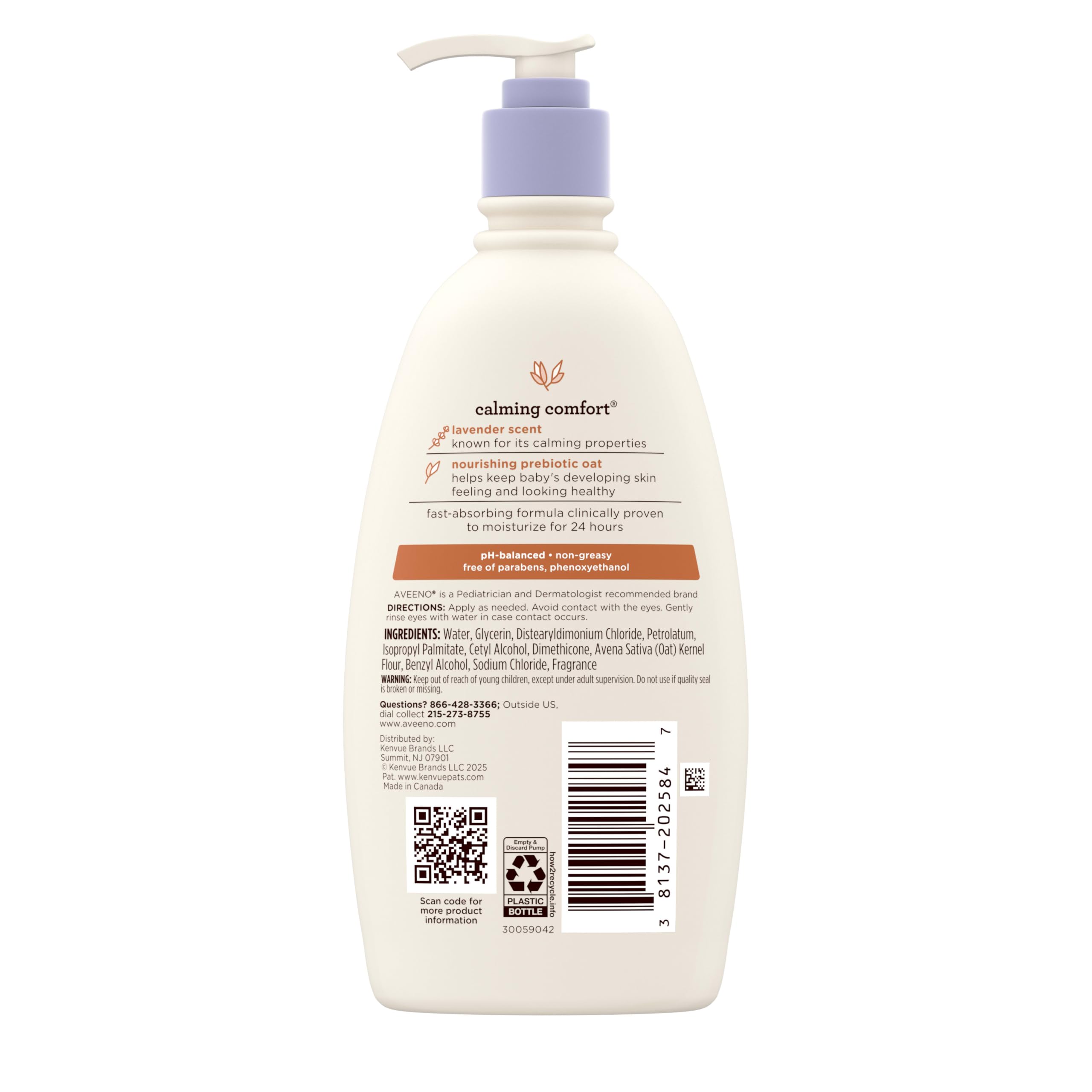 Nourishing and Hydrating: Calming lavender baby lotion helps hydrate your little one's delicate skin. This calming bedtime lotion is formulated with skin-nourishing prebiotic oat to help keep baby's developing skin feeling and looking healthy