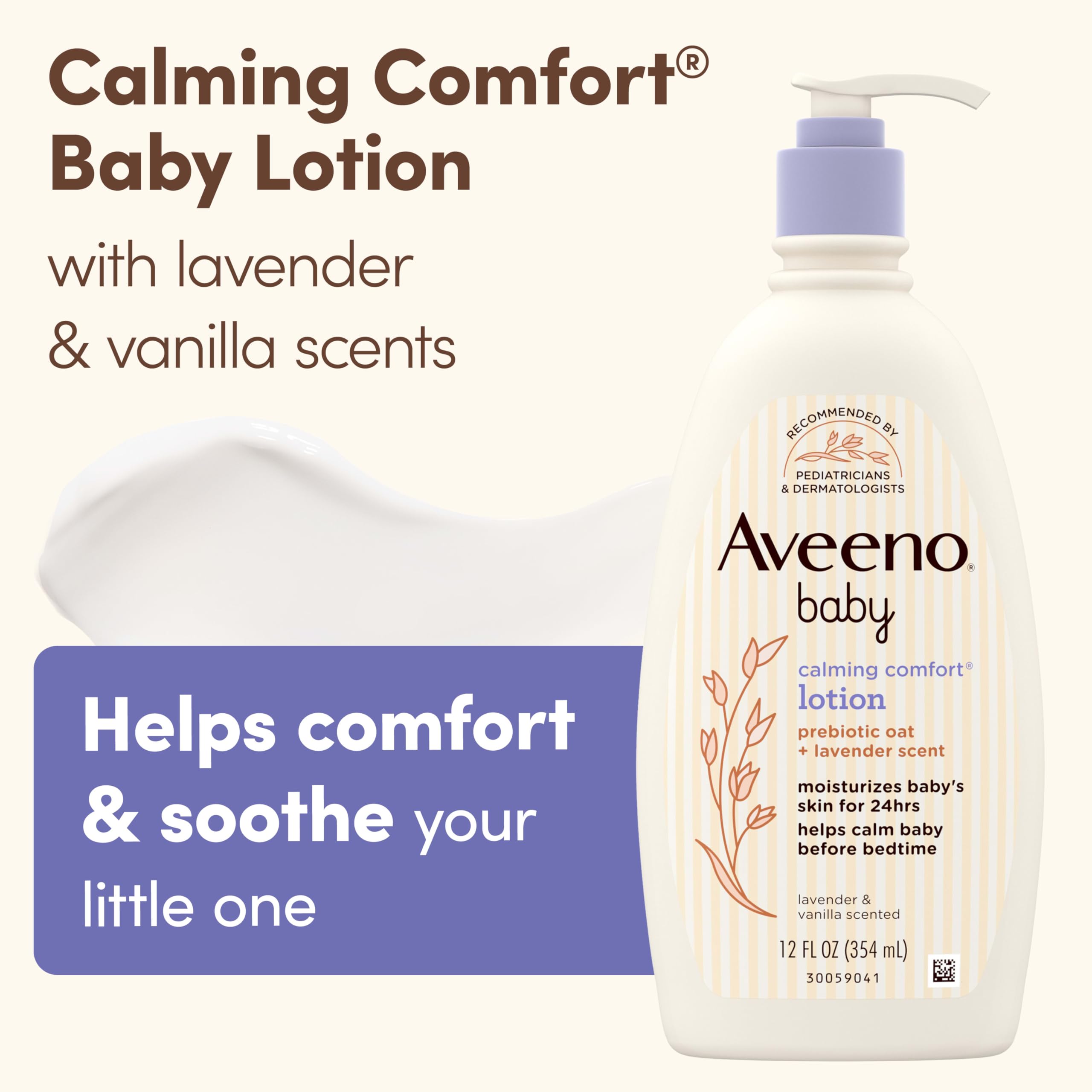 Calming Baby Lotion: Aveeno Baby Calming Comfort Moisturizing Body Lotion with relaxing lavender and vanilla scents helps comfort and soothe your little one at bedtime while moisturizing skin for 24 hours