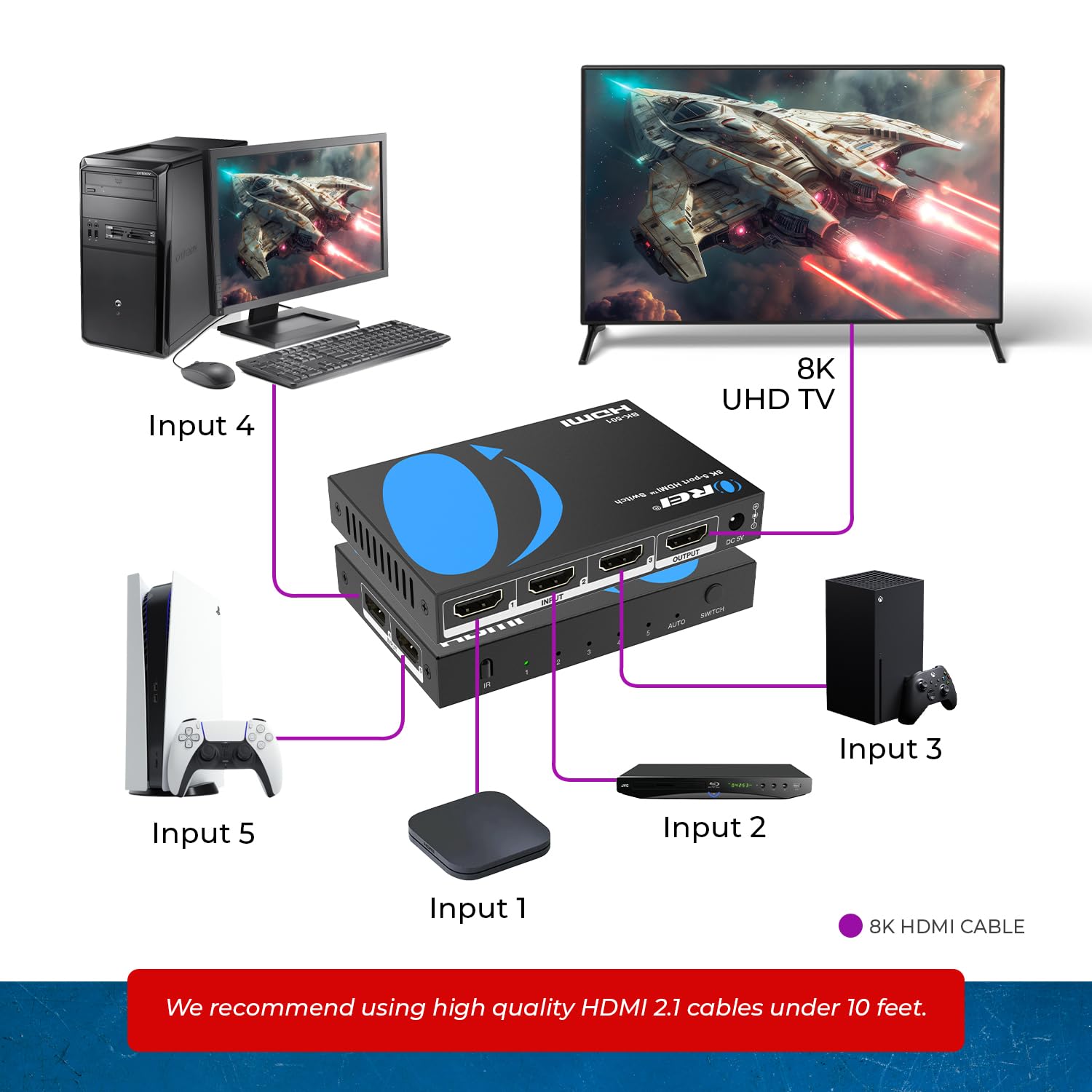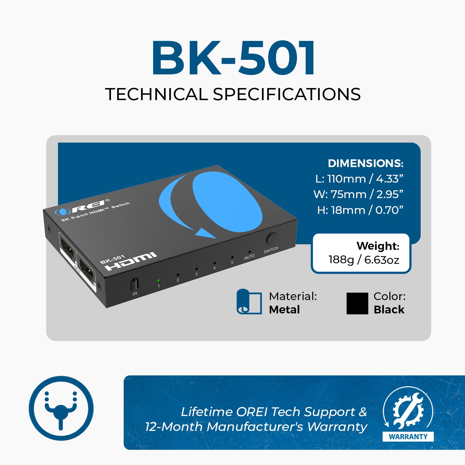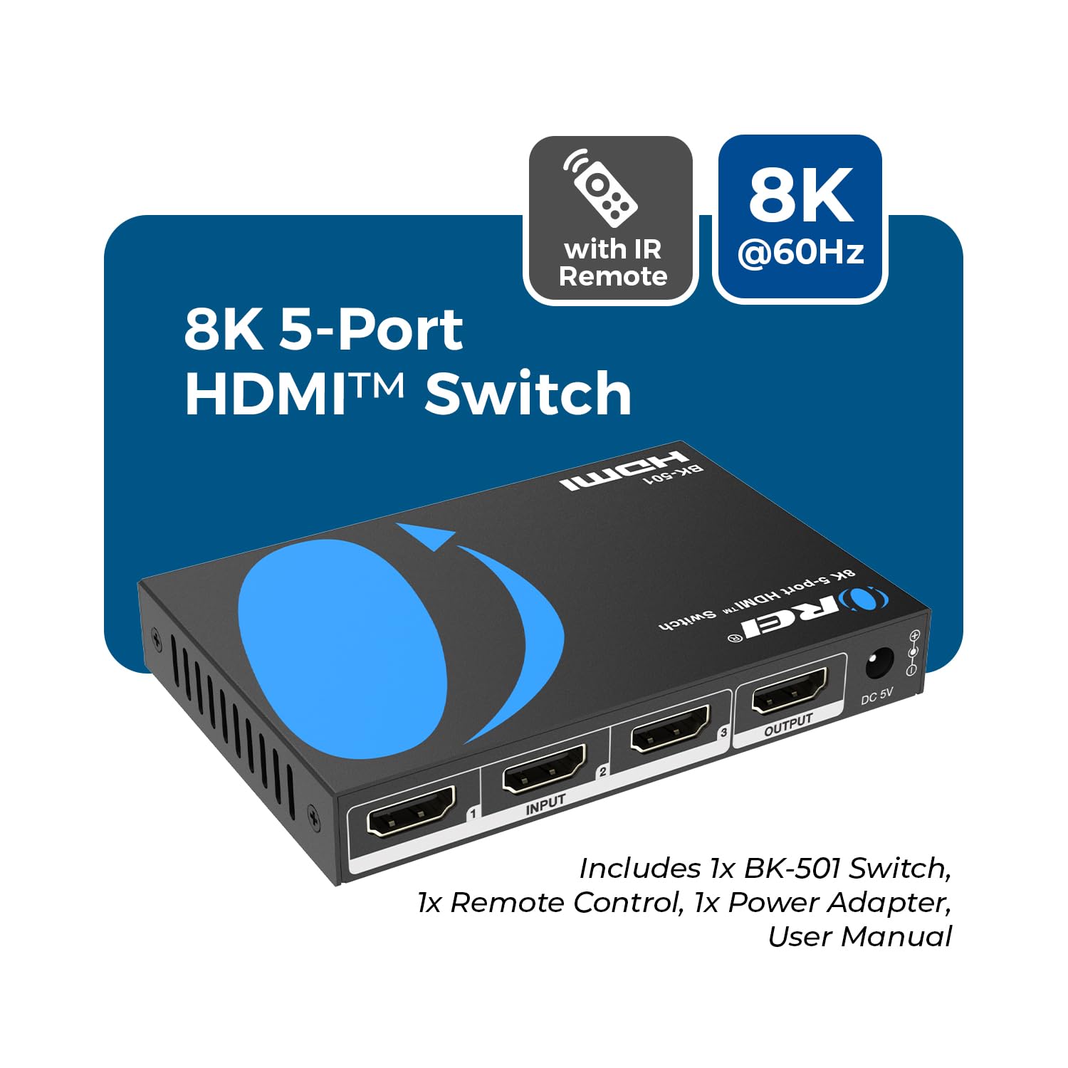 Includes 1x 8k HDMI Switch 5 in 1 out, 1x Remote Controller, 1x5V Power Adapter, and User Manual. Backed by a 1 Year warranty from OREI