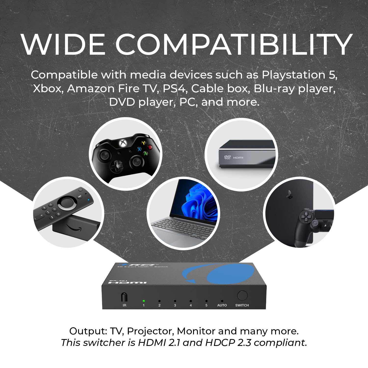 Optimized for next-gen gaming, this HDMI switch comes with VRR (Variable Refresh Rate), ALLM (Auto Low Latency Mode), and QFT (Quick Frame Transport)