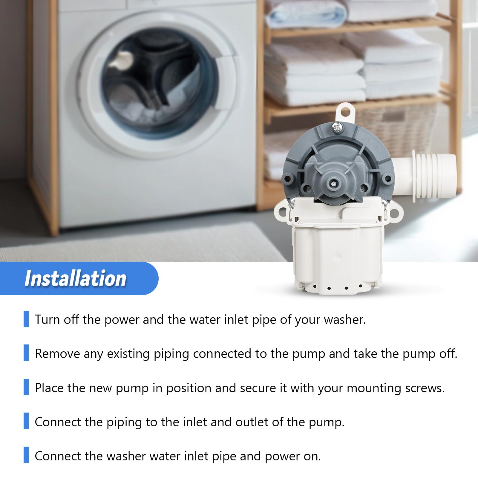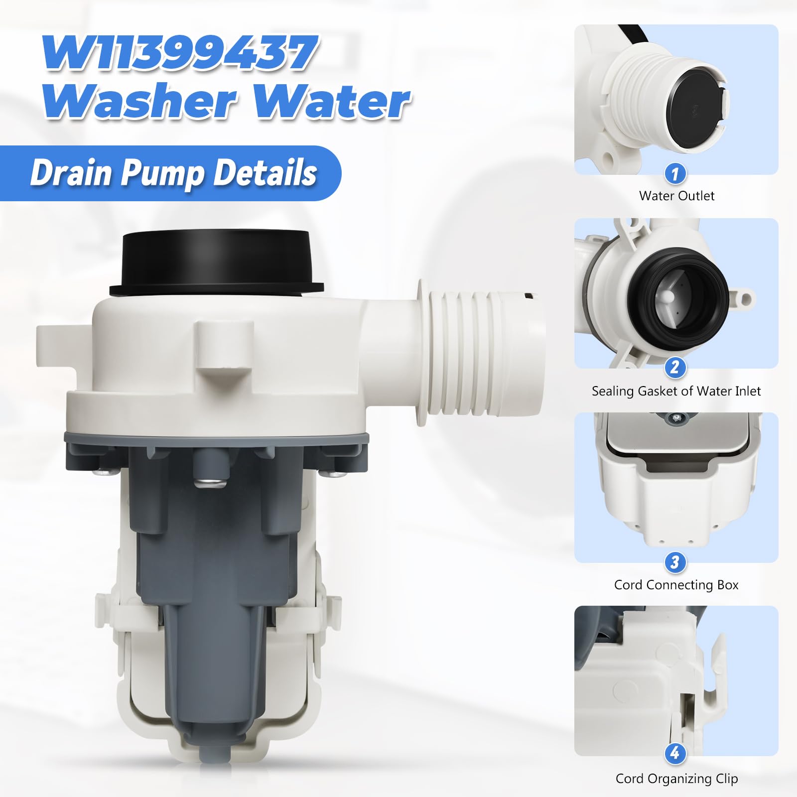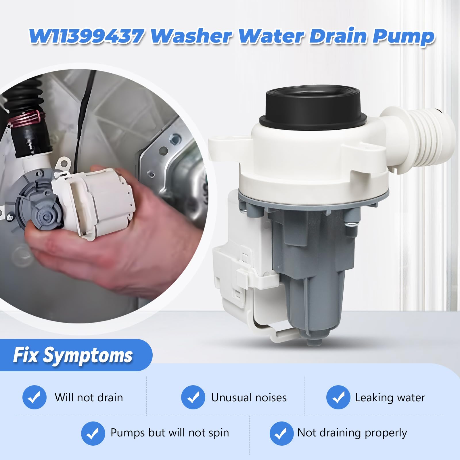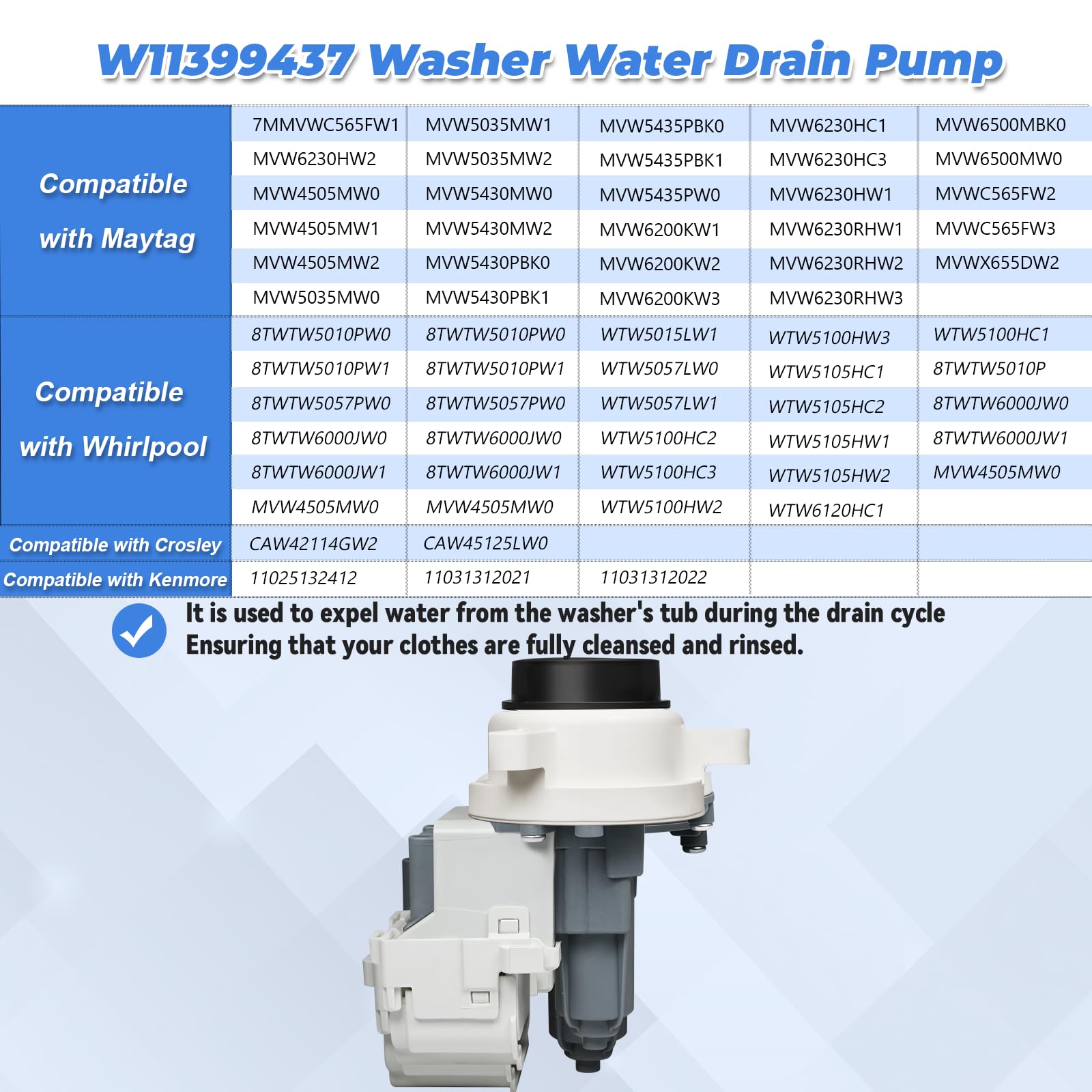 Compatible Washer Models: W11399437 washer water drain pump is compatible with Maytag Whirlpool Crosley Kenmore washer models MVW6230HW2, 7MMVWC565FW1, MVW5430PBK0, MVW5435PBK0, MVW5435PW0, MVW6200KW1, MVW6230HW1, MVW6500MW0, MVWC565FW2, MVWX655DW2, WTW5100HC1, 8TWTW5010PW0, 8TWTW5057PW0, 8TWTW6000JW0, MVW4505MW0, WTW5000DW3, WTW5005KW0, WTW5010LW0, WTW5015LW0, WTW5057LW0, WTW5100HC2, WTW5100HW2, WTW5105HC1, WTW5105HW1, WTW6120HC1, CAW42114GW2, CAW45125LW0, 11025132412, 11031312021, etc