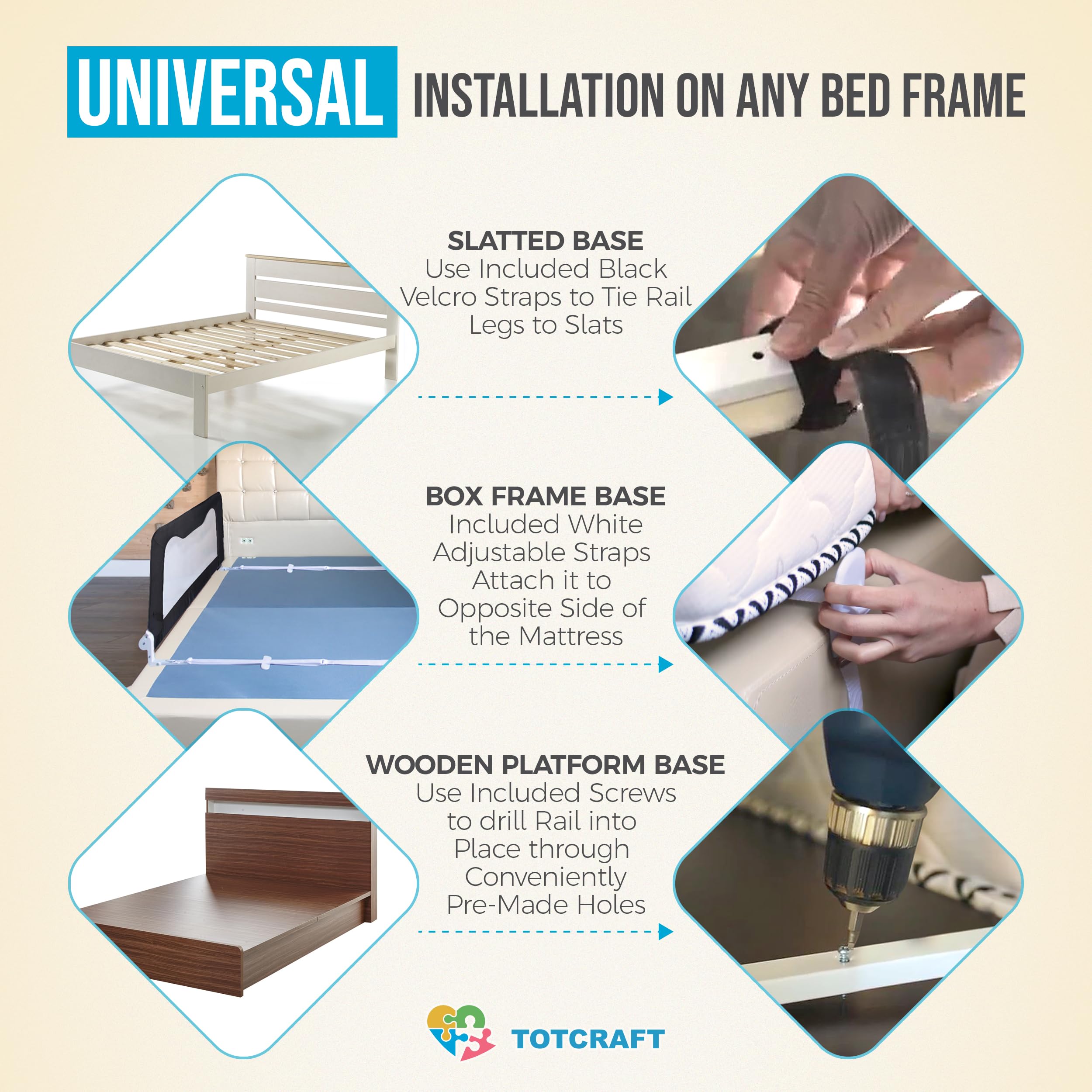 ✅【Compatibility & Universal Fit for most bed types & sizes】: TotCraft Bed safety Rail Guard works with slatted beds, box springs or wooden base beds. Also suitable for Cribs, Queen beds, Double twins, king size beds, Single mattresses, Toddler beds, Tempurpedic beds, Bunk beds, full size beds, Twin beds, Double mattress, and Twin mattress.