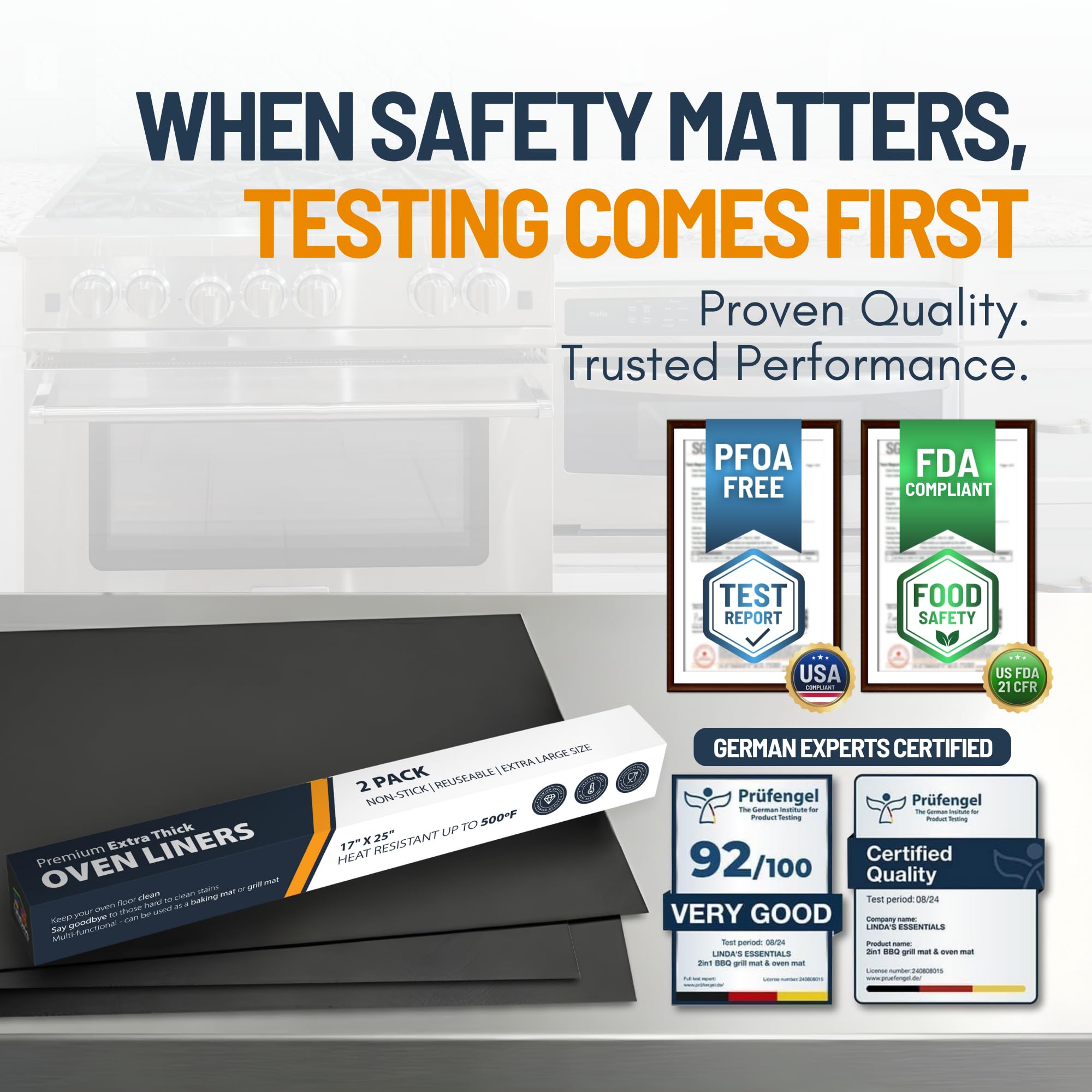 SUPERIOR QUALITY: Withstands up to 500°F and is 100% BPA Free and PFOA Free. Each oven floor protector liner is made from a durable, heat-resistant coating, reinforced with fiberglass fabric. Each pack comes with 2 oven liners measuring 17” by 25”, with a thickness of 0.2mm, providing you with an extra-thick durable product that covers your entire bottom oven. Easily cut to size using scissors to fit your oven