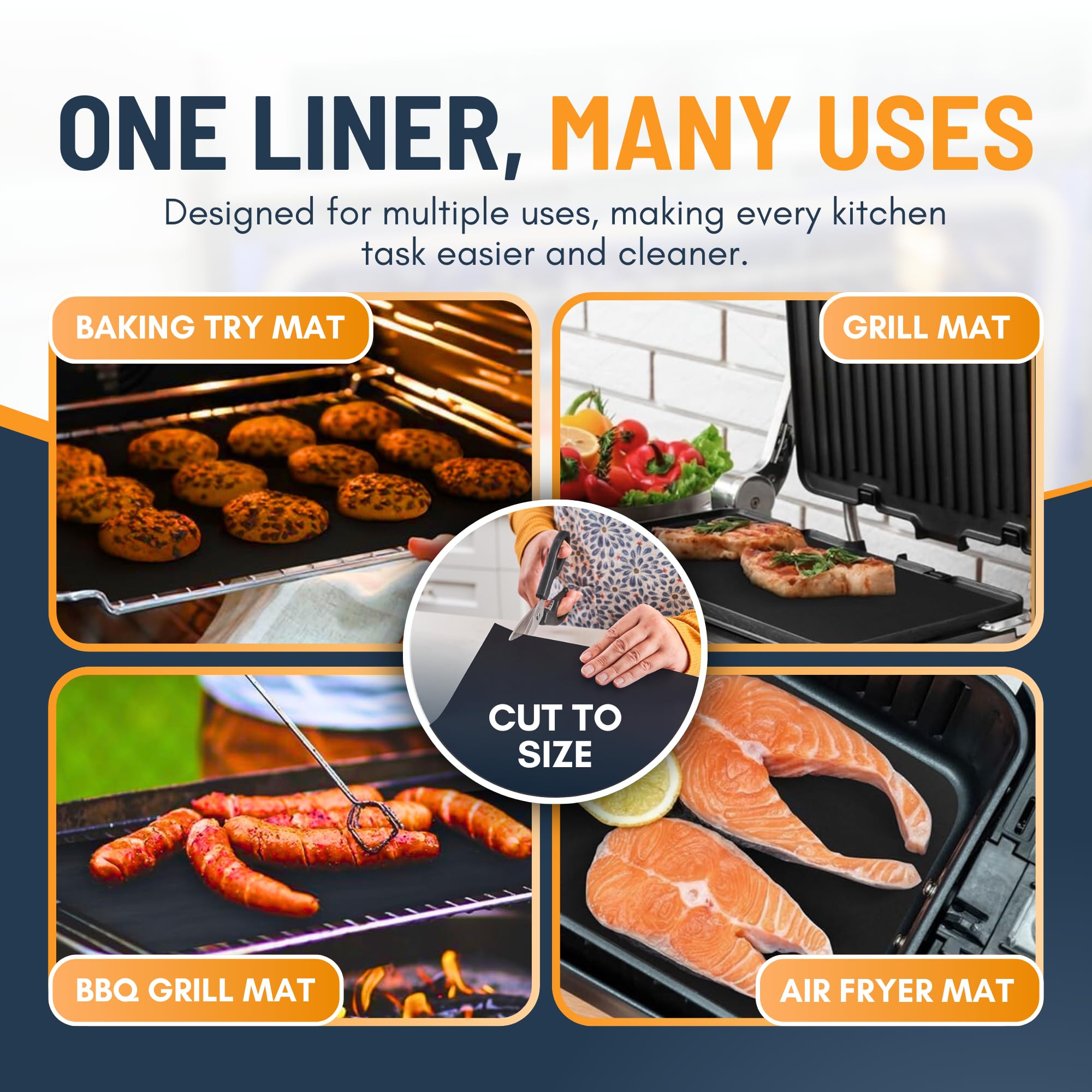 MULTI FUNCTIONAL: Works as a bbq grill mat, baking mat, oven liner and pan liner - the uses are endless. They also act as drip pan trays for cooking and baking - protecting your oven floor no matter the case. Our double sided oven liners are a must have cooking accessory for any kitchen