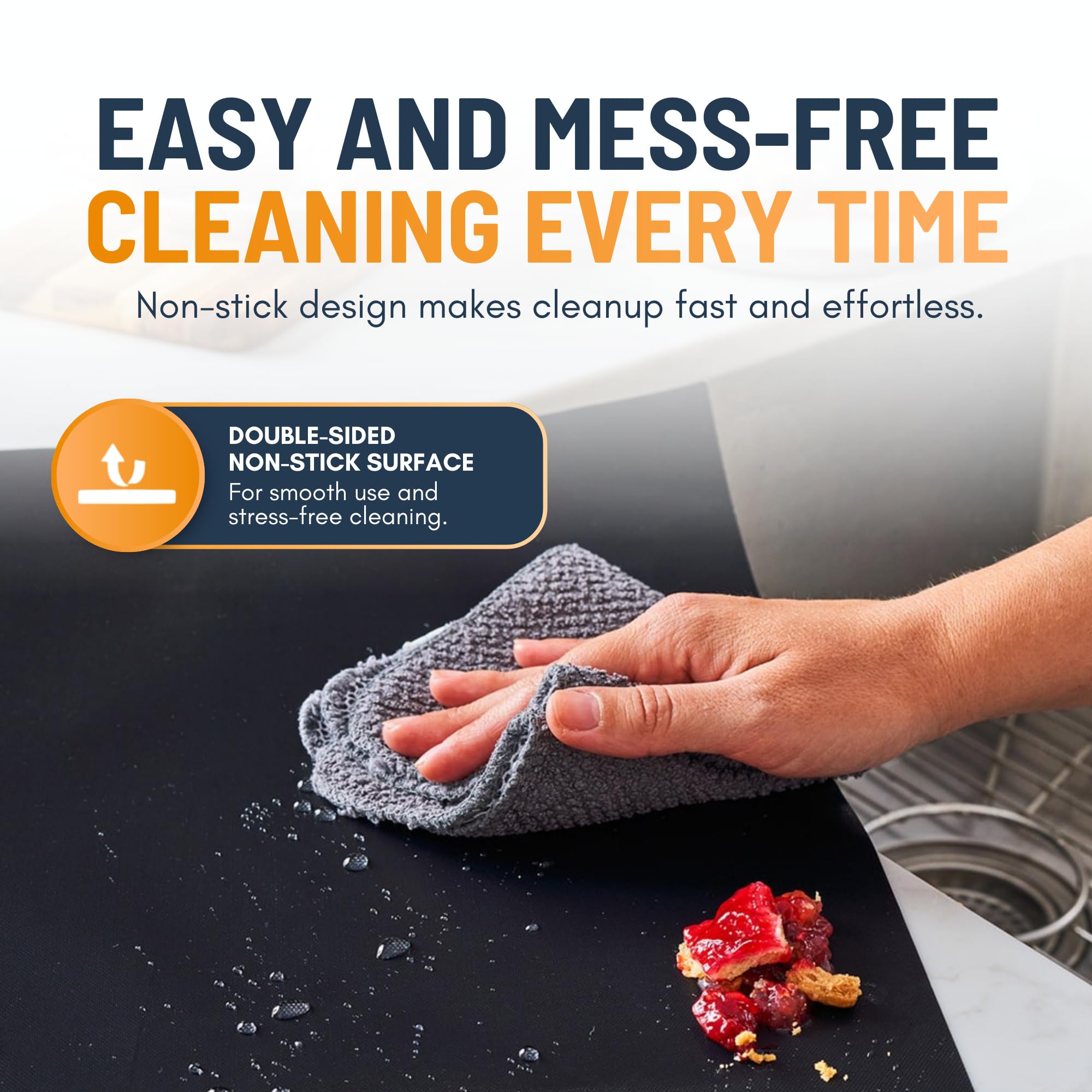 SAVE TIME CLEANING: Put an end to scrubbing the bottom of your oven floor. Our washable heavy duty and non-stick oven liners mats save you time and energy and are easy to clean - simply wipe down using a damp cloth or place in the top shelf of your dishwasher, then reuse as normal. You can also use these liners as an oven cover for hassle-free cleanup