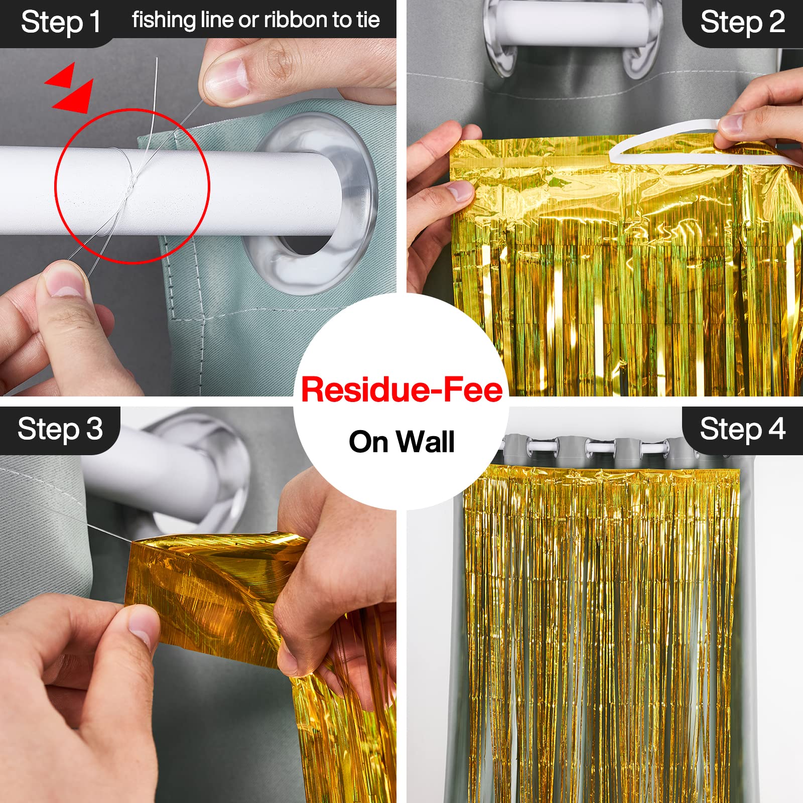 Easy to Fix: Either to fix on wall via fishing line or ribbon for residue-free effect or to quickly hang up by adhesive tape on the back of the fringe