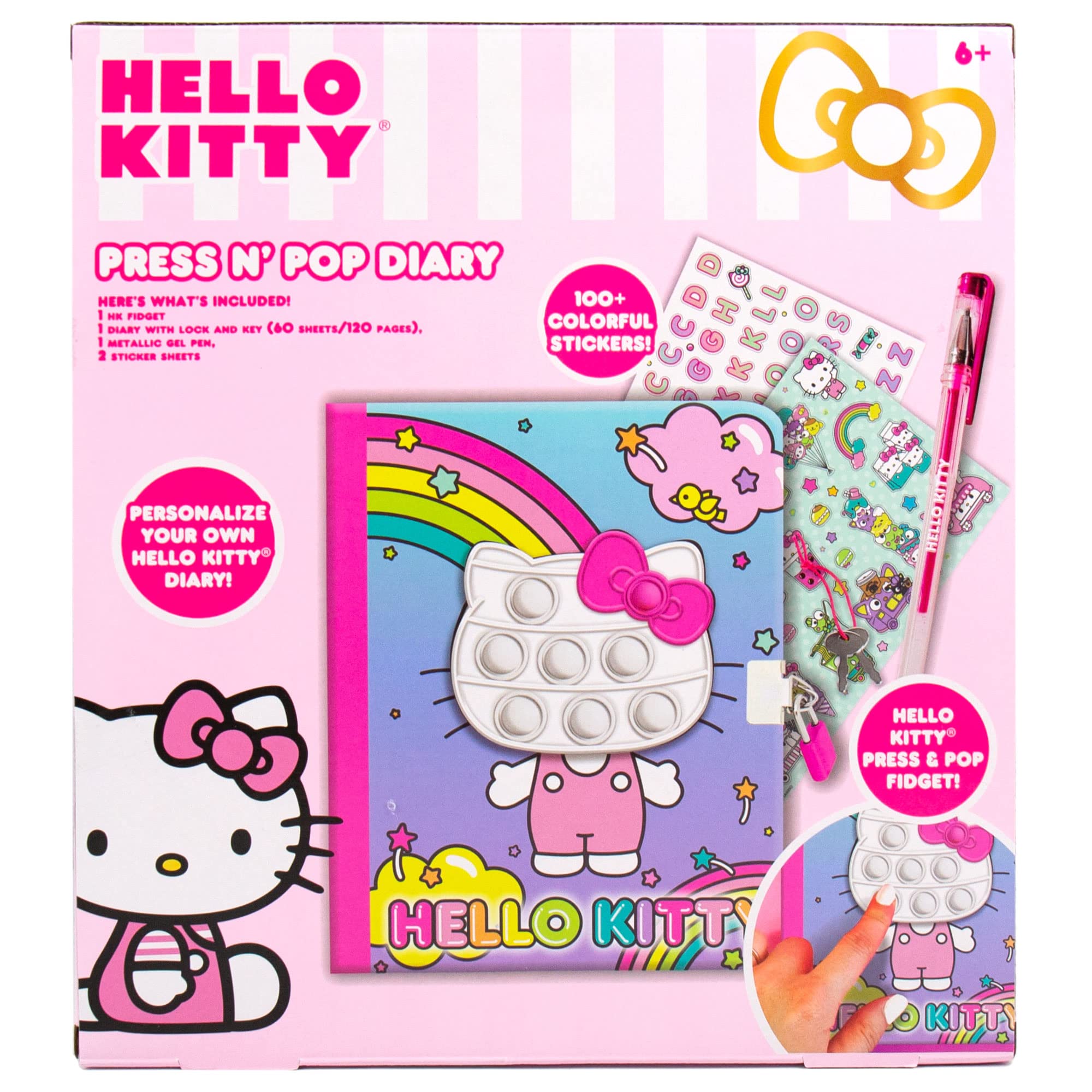 KIT INCLUDES: 1 Hello Kitty Fidget Toy (3.55 x 3.02 in.), 1 Hello Kitty Diary (6 x 7.75 in., 60 Sheets), 1 Gel Pen (Pink), 2 Sticker Sheets (4 x 5 in.), Easy-To-Follow Instructions