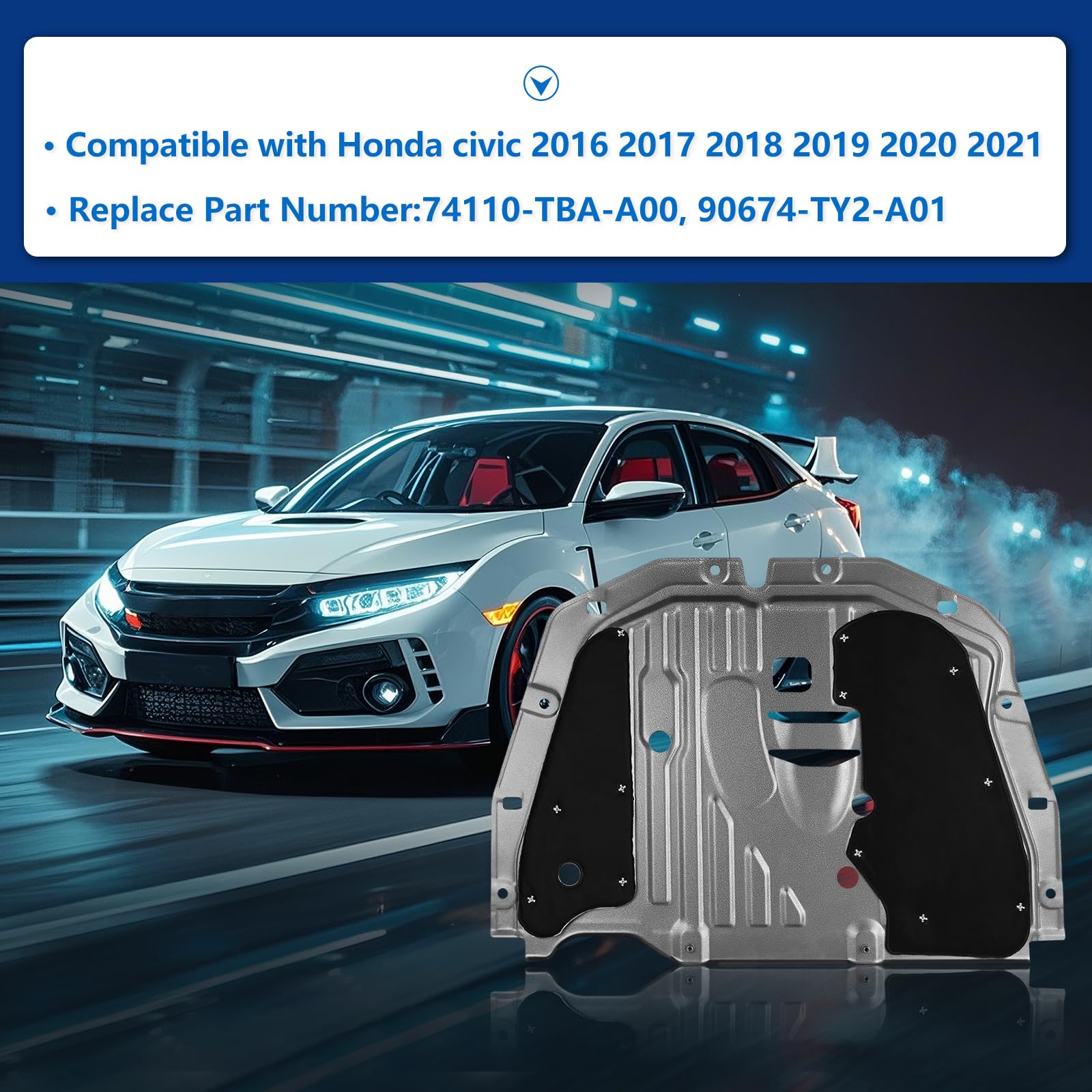 [Compatible With] : this engine splash shield Fit for Honda Civic 2016 2017 2018 2019 2020 2021 Replace OEM Number 74110-TBA-A00, 90674-TY2-A01.