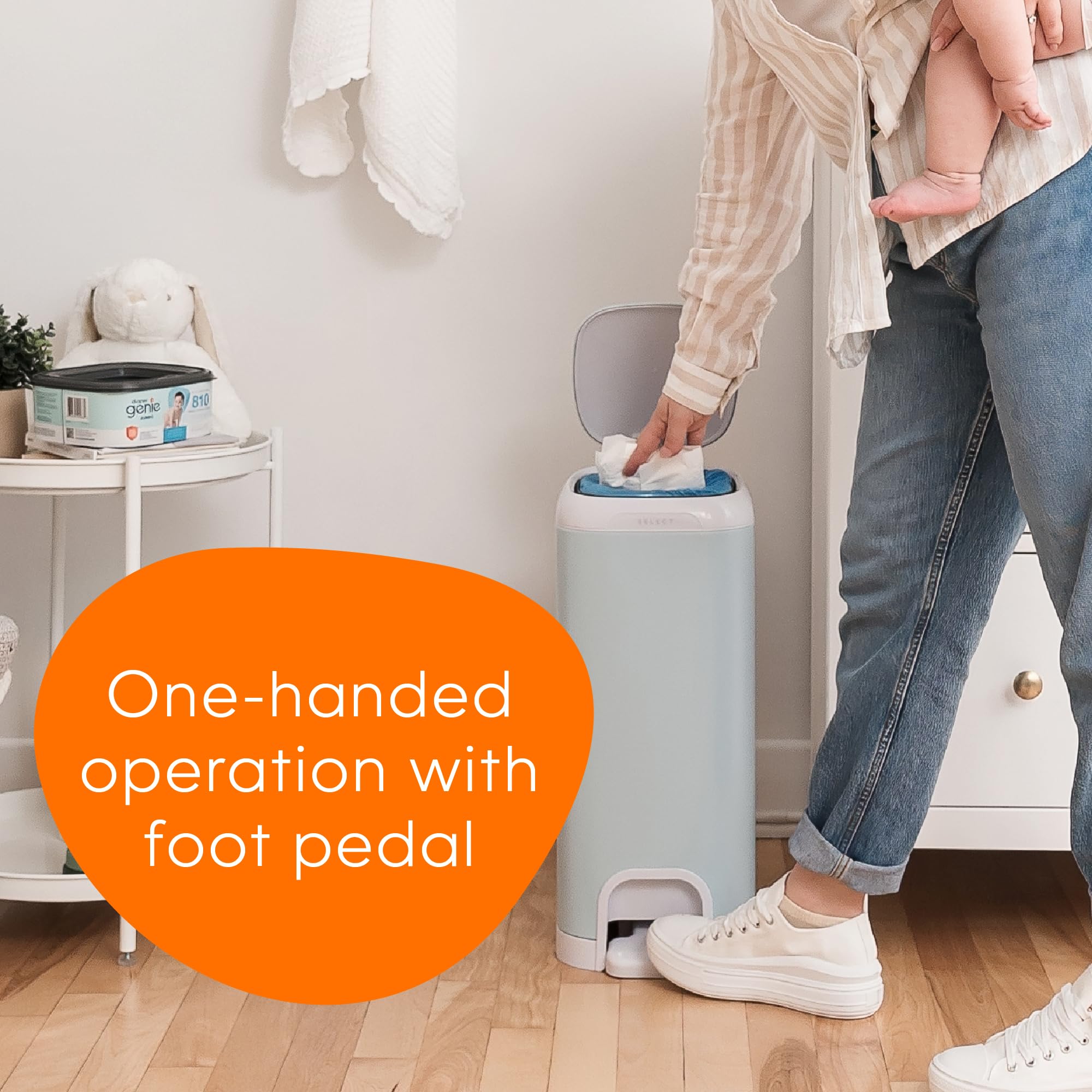 Introducing the new Diaper Genie Select Pail, a sleek addition to your nursery designed with both style and durability in mind. Crafted from durable stainless steel, the new Diaper Genie Select pail features a Push N Lock odor locking clamp that effectively helps to contain odors of messy diapers. For added convenience, the Select diaper disposal system includes a foot pedal, allowing for easy, one-handed operation. Our new metal pail can hold up to 40 newborn diapers and comes with multi-layer starter refill film, featuring our advanced Max Odor Lock technology. This starter refill can securely hold up to 165 newborn diapers, offering extended usability. The Select Pail is also compatible with our Diaper Genie Jumbo refills made from a durable, multi-layer film with odor-locking barrier technology, ensuring effectiveness and long-lasting freshness.