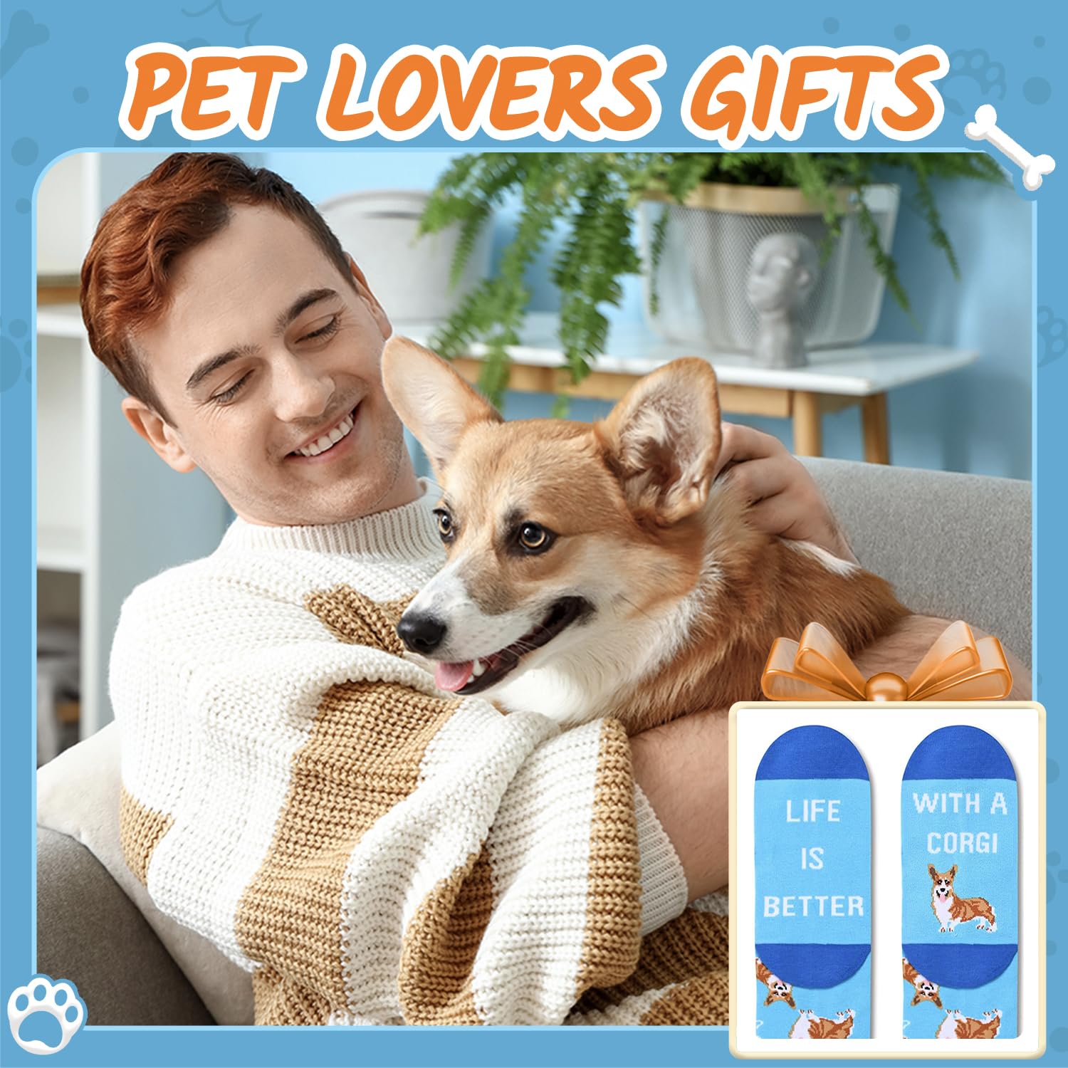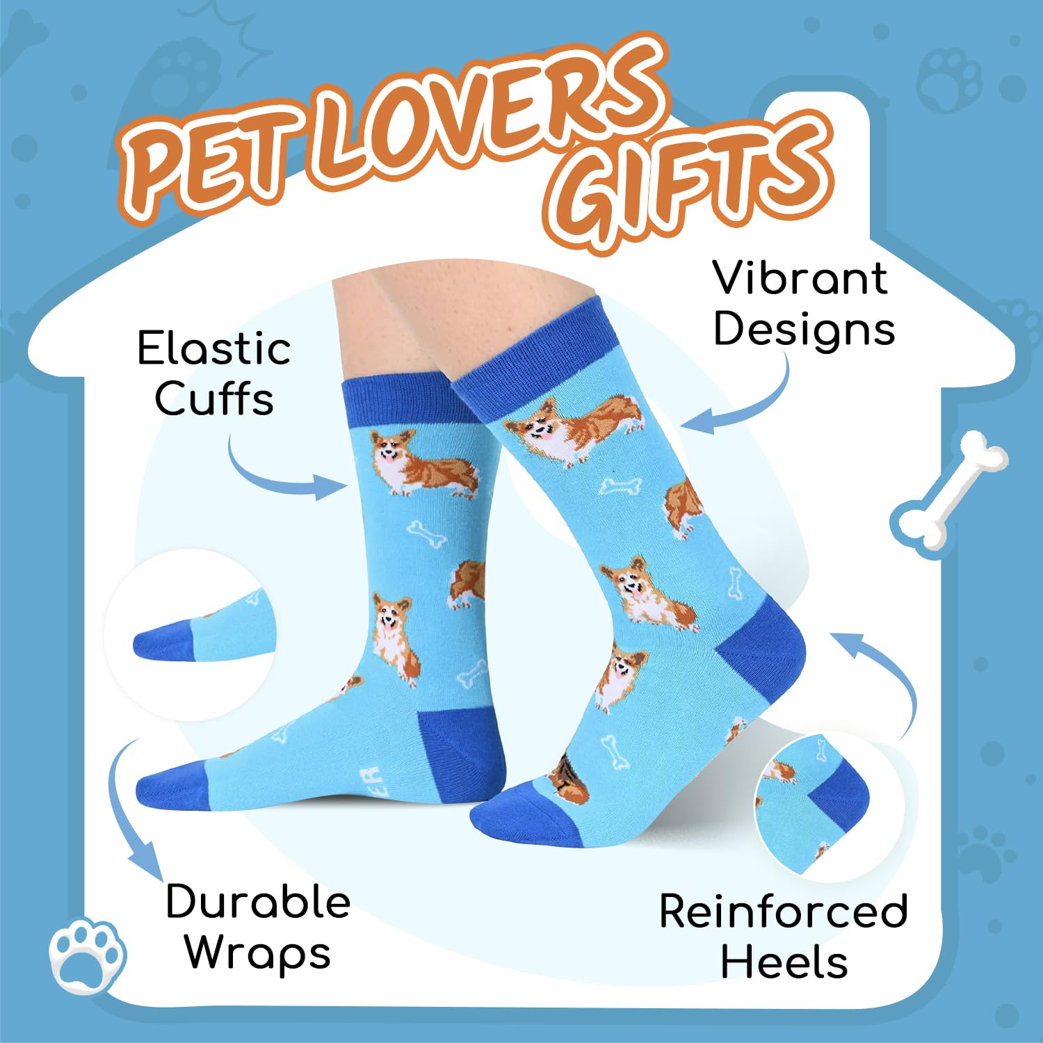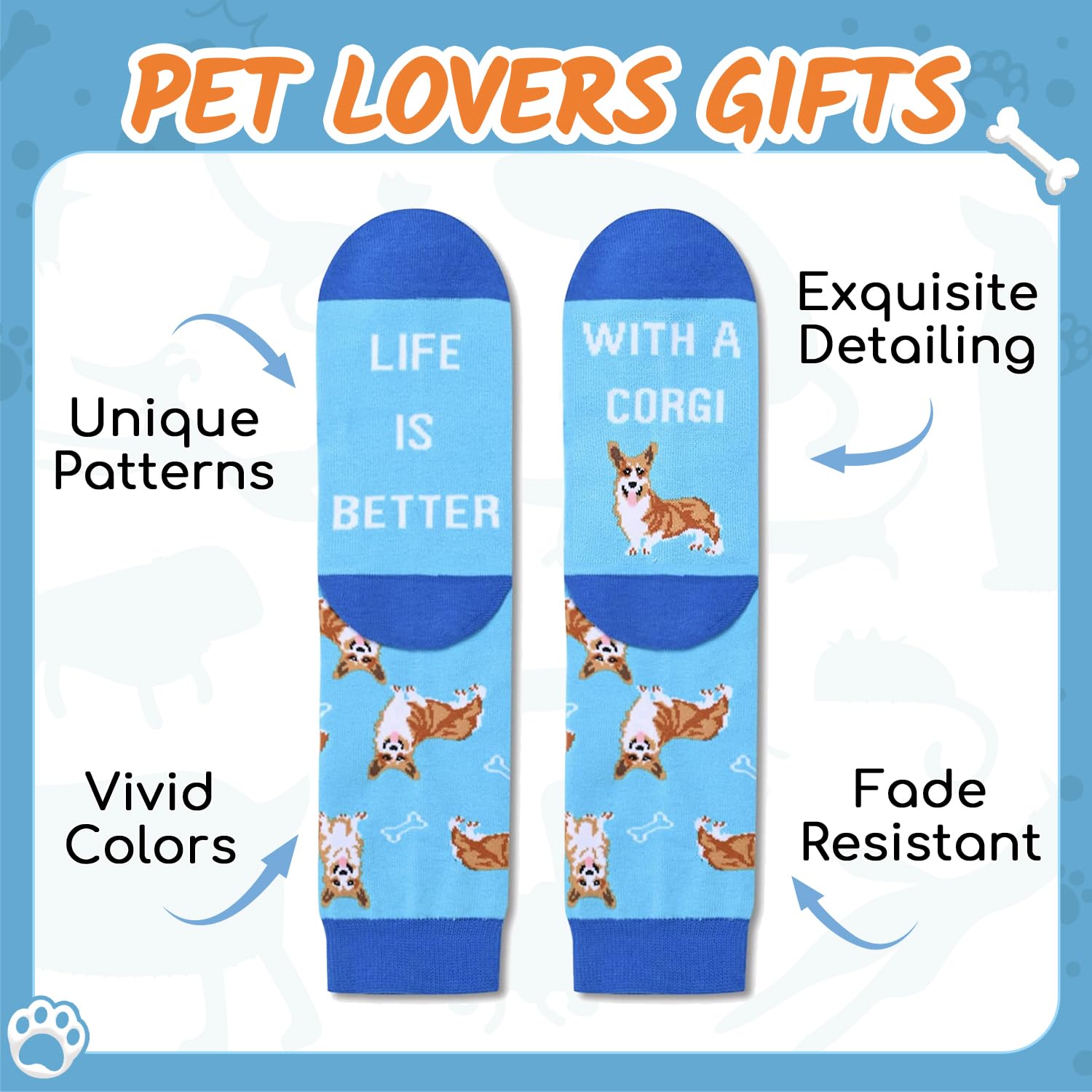 CORGI SOCKS - Our funny socks are designed for both women and men and feature cute corgis and bones in blue, with the funny sayings "LIFE IS BETTER WITH A CORGI."