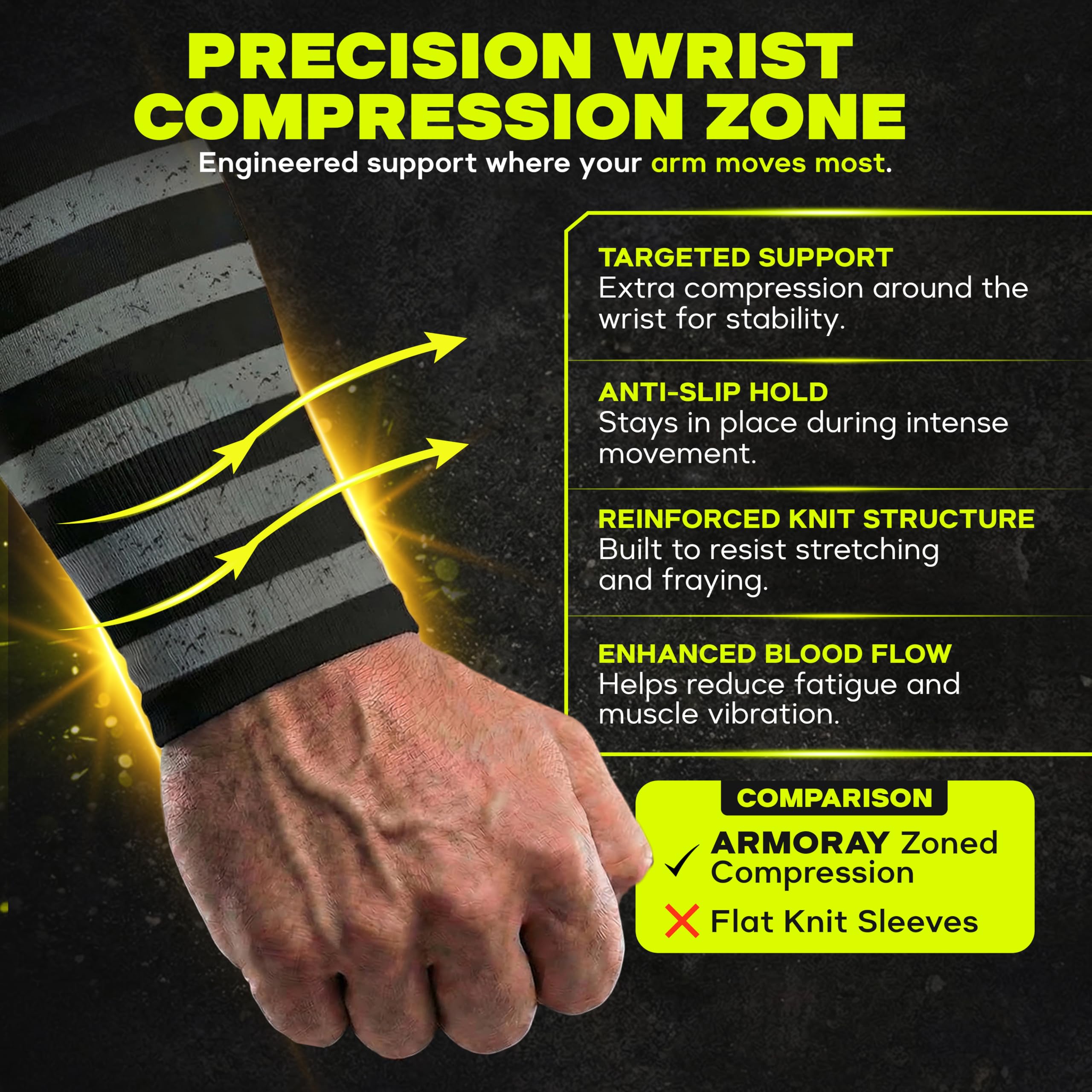 🦾ZERO slip + Pressure Release guaranteed: ARMORAY Arm Compression Sleeves are carefully crafted with Segmented Weave technology, with minimal exterior stitching for optimal comfort and grip. NO rub, NO slip, NO itch. The ergonomic design is knitted to not only provide comfort and protection - but expertly release pressure during strenuous exercise and activities.