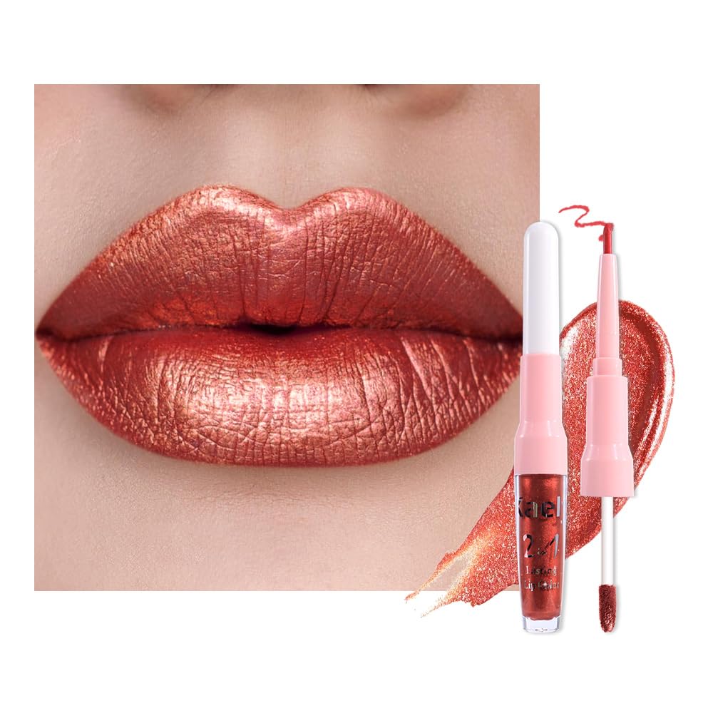 2 IN 1 Lip Liner & Metallic Lipstick: The double ended design made you can use lipstick and lip liner on both ends. New design with dual heads lipstick & lip liner in one, for draw delicate lip line before applying lipstick. It combines lip line and metallic lipstick and makes double-end lipstick more perfect,meets the need of all occasions.