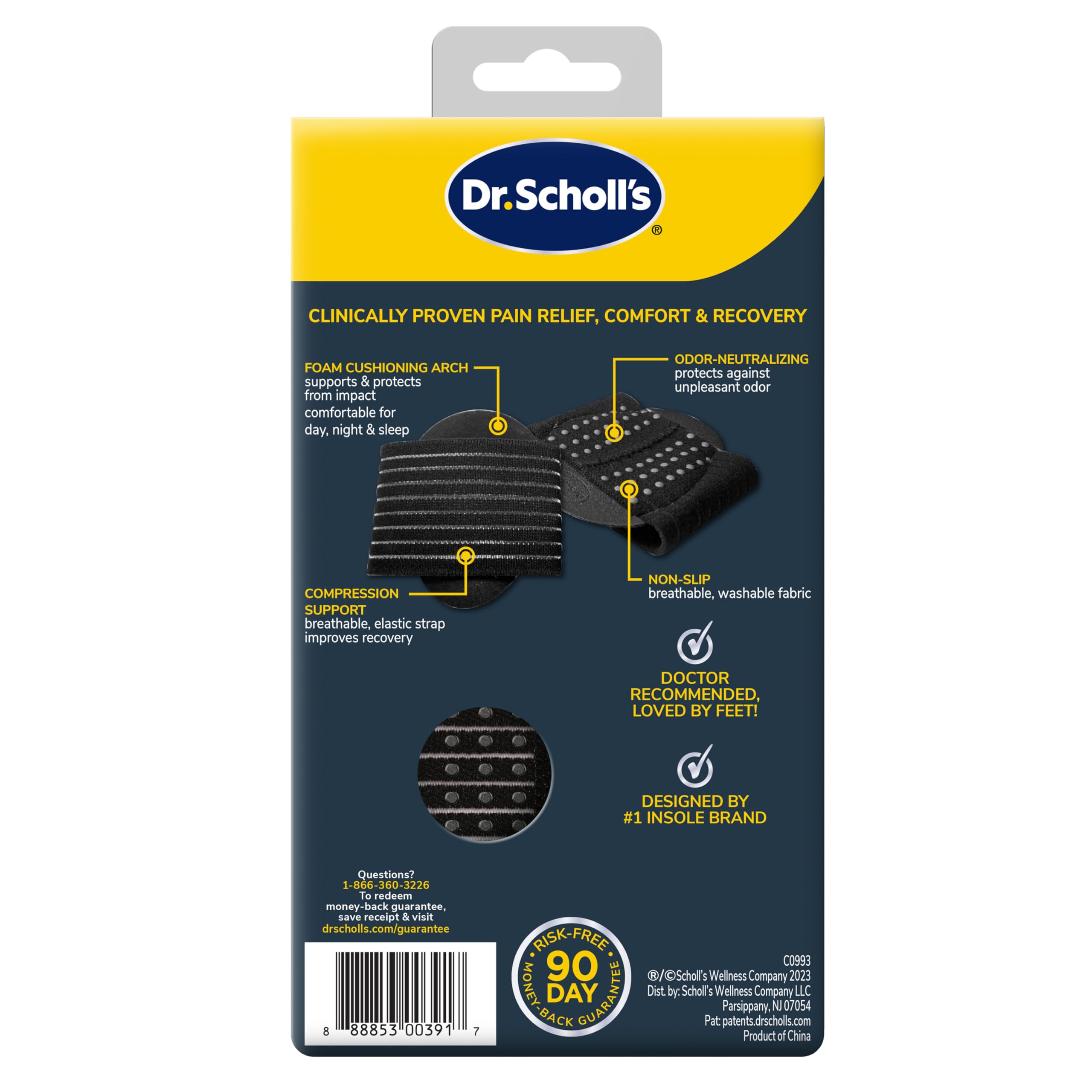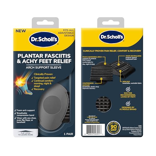 Dr. Scholl's® Plantar Fasciitis & Achy Feet Relief Arch Support Sleeve is specifically designed for those who suffer from plantar fasciitis & tired, achy feet and is clinically proven to provide relief of that pain and discomfort. These inserts provide pain relief from plantar fasciitis, with or without the existence of heel spurs.The built in arch support from the foam pad and breathable compression band helps to distribute foot pressure to support the arch & plantar fascia and provide long-lasting all-day comfort. Wear these supportive sleeves throughout the day with shoes & socks, around the house barefoot or in your slippers. You can wear them to bed while you're getting some well deserved rest, to avoid morning plantar fasciitis pain! The arch support takes pressure off the heel, providing targeted support to the fascia, reducing plantar fasciitis pain, and relieving tired, achy feet. Relieves pain throughout the day and is comfortable to wear during any activity!