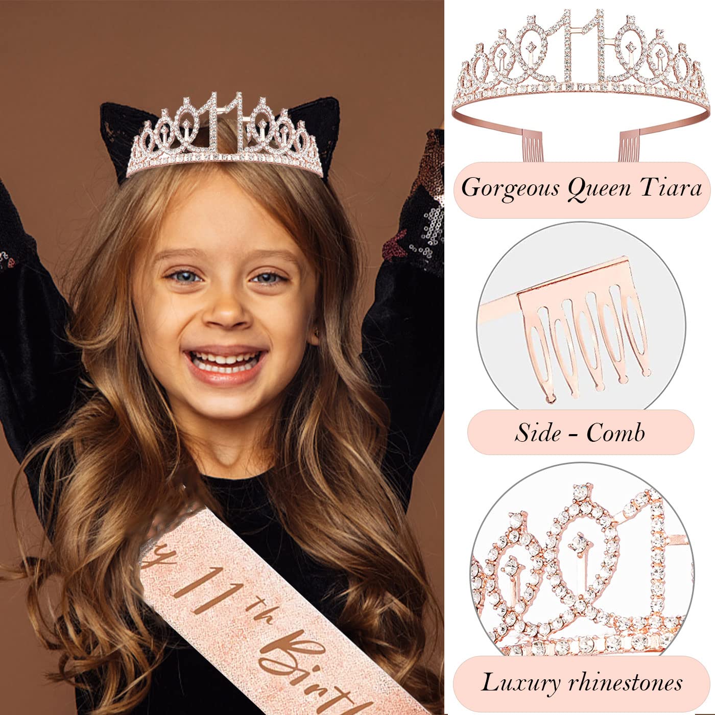 Glittery Rose Gold Crown 11: Made of high quality alloy and rhinestone. 11th Birthday Tiara is with combs that make sure it can grip the hair more tightly for fitting girls. Dimension: 5.4β on the front side.