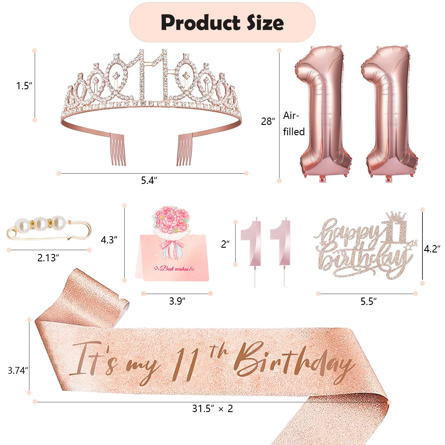 11th Birthday Decorations for Girls: Glittery 11th tiara/crown *1pc, βItβs my 11th birthdayβ sash *1pc, Happy 11th birthday cake topper *1pc, pearl pin*1pc, 1+1 numeral candles *1set, 1+1 numeral balloons *1set, they are exquisitely packaged in the carton.