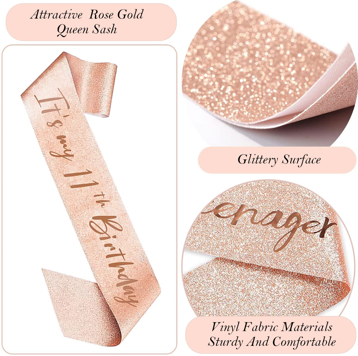 Birthday Girl Sash: Our 11th birthday sash is made of high quality glitter fabric with foil βItβs my 11th birthdayβ lettering . The sash is in 61 inch length and comes with a gold charm pin that you can easily adjust the length you need.