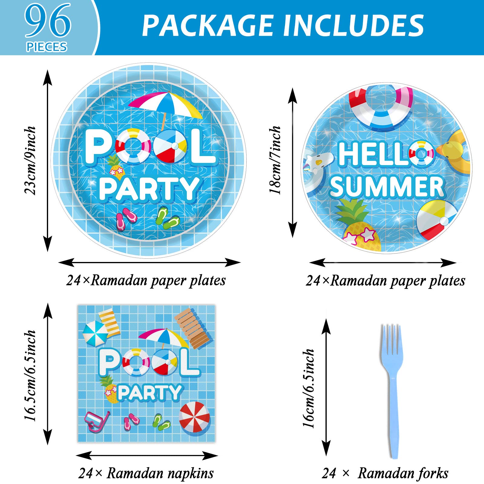 What's in the package: You'll receive 24 9" pool party paper plates, 24 7" pool party paper plates, 24 6.5" pool party napkin replacers, and 24 plastic blue forks, each set serves 24 people guests