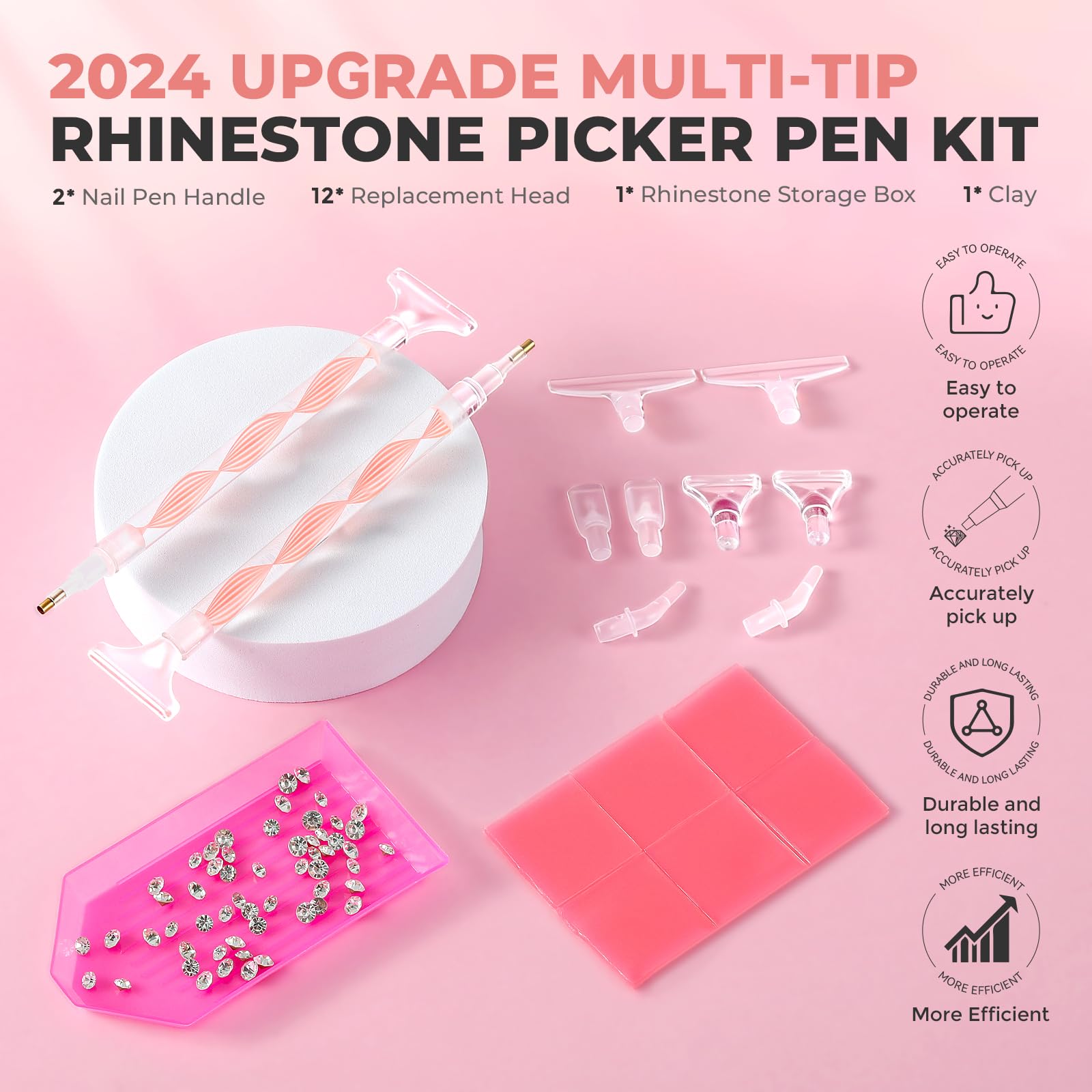 Multi-Tips Rhinestone Picker Tool Kit: Includes 2 acrylic pen handle, 12 replacement pen tips (6 sizes in total), 1 rhinestone storage box, 6 clay(1*1cm). For all kinds of nail art and jewelry making needs.