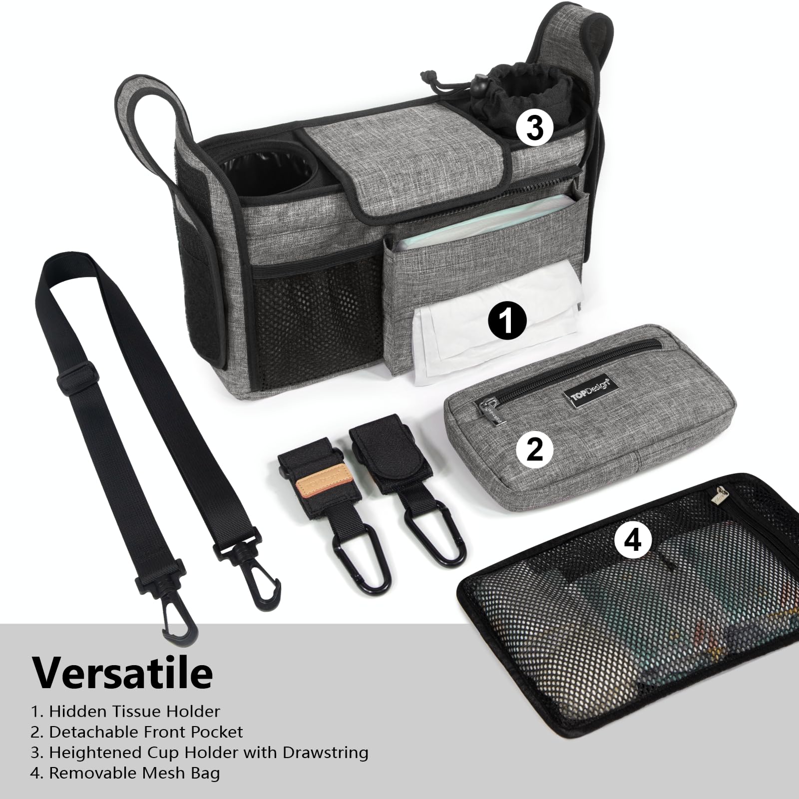 TOP DESIGN & DURABILITY: The front detachable pouch can be used as a separate wristlet purse for phone, lipsticks and other small items. And the stroller caddy comes with a strap that allows you to wear it as a shoulder bag when carrying the baby for a walk. The thicker waterproof oxford material we choose makes the bag last longer. Embedded the metal frame and bottom board inside, strengthened the edge to achieve better transverse and longitudinal support. This exclusive strength other competitors don't process- makes the bag more durable and stays upright.
